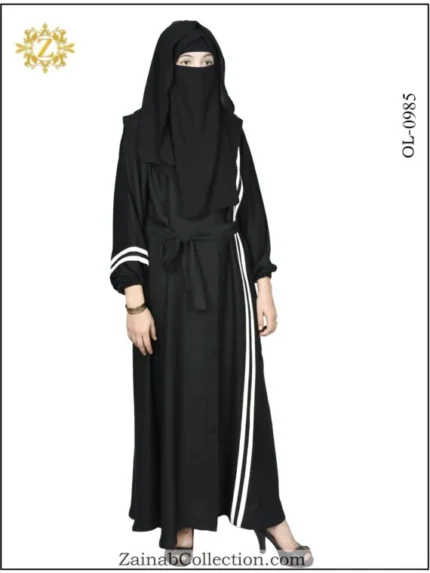 Black modern maxi abaya with an elegant strip design on one side, offering a sleek and stylish look.