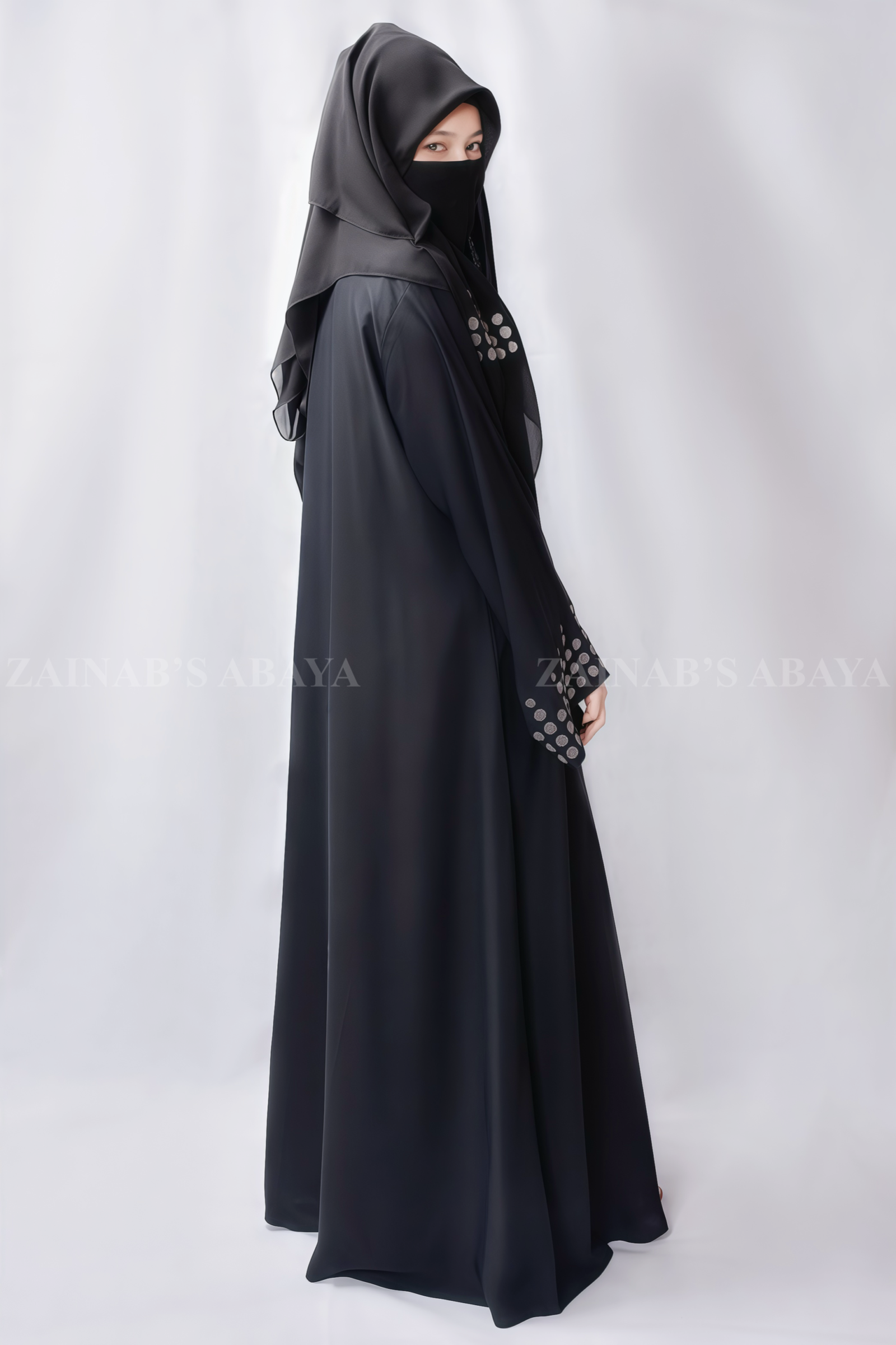 This Black Front Open Abaya for women is crafted with Premium Nida Korean Fabric. This black abaya opens at the front. It has pretty circle-shaped stitch designs on the sleeve cuffs and piping along the front. Includes a matching black chiffon scarf with the same pattern.