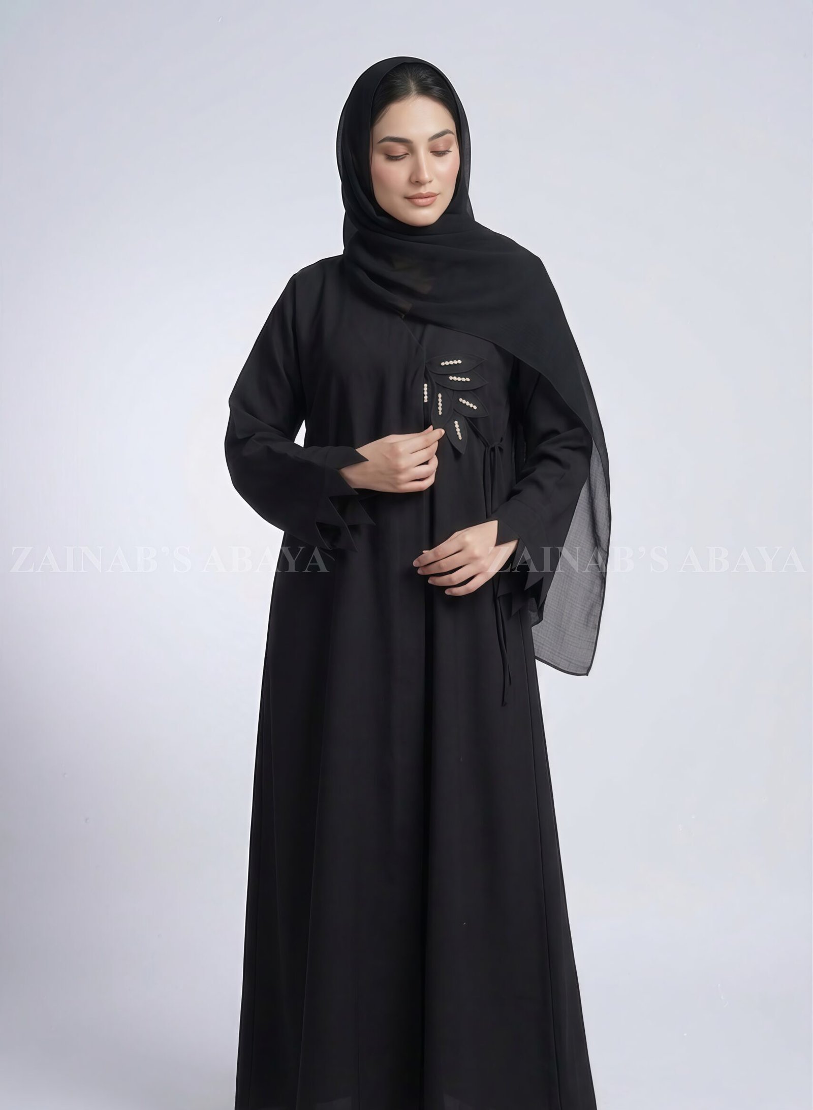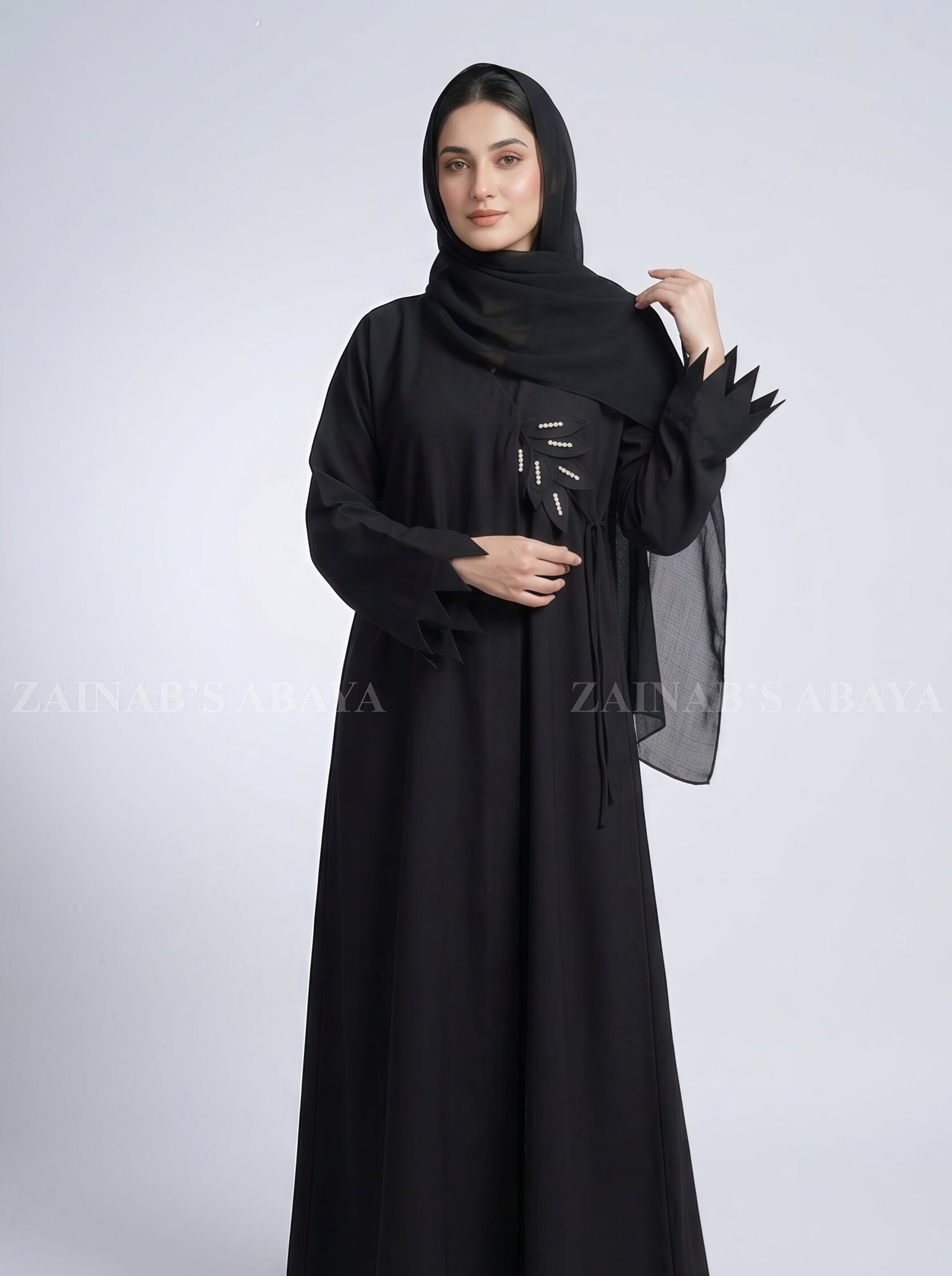 This black front open angrakha style abaya for women is a perfect blend of tradition and elegance. Made with Premium Nida Korean Fabric, it offers a soft and flowing fit. The pearl and leaf detailing on the front adds a subtle charm, while the matching chiffon scarf completes the look beautifully.