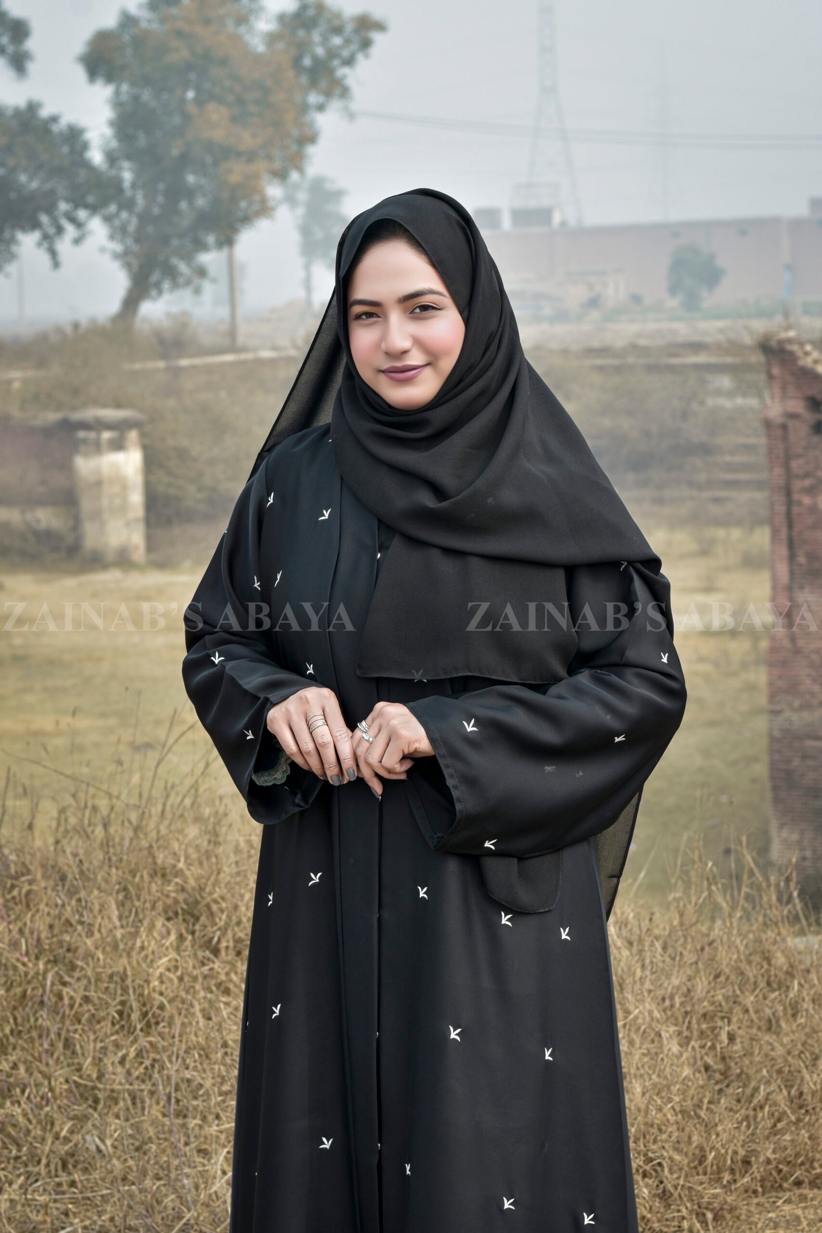 This black front open abaya is tailored for a contemporary, elegant shape with a sleek front-open design. It is embroidered in white with simple chata-style motifs on the front and sleeves, which add a delicate touch. It comes with a matching scarf that compliments the outfit by simply repeating the embroidered motifs.