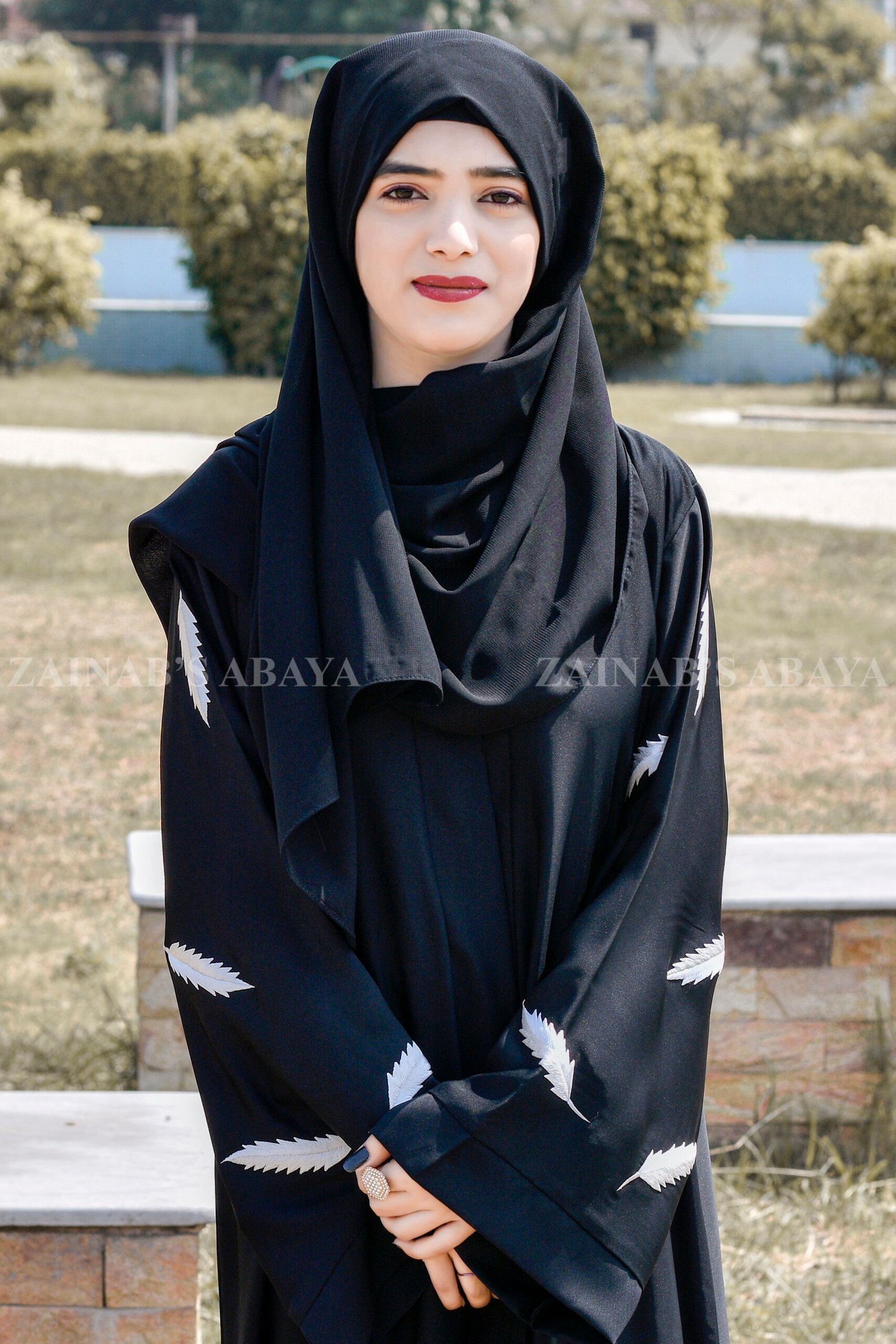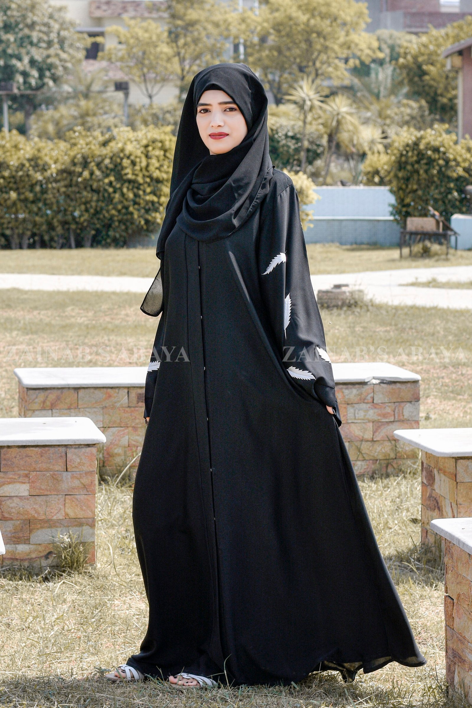 This Black Front Open Abaya with Leaf Embroidery is made from soft Nida Korean fabric. It features pretty leaf stitch designs on the sleeves. Includes a matching black chiffon scarf.