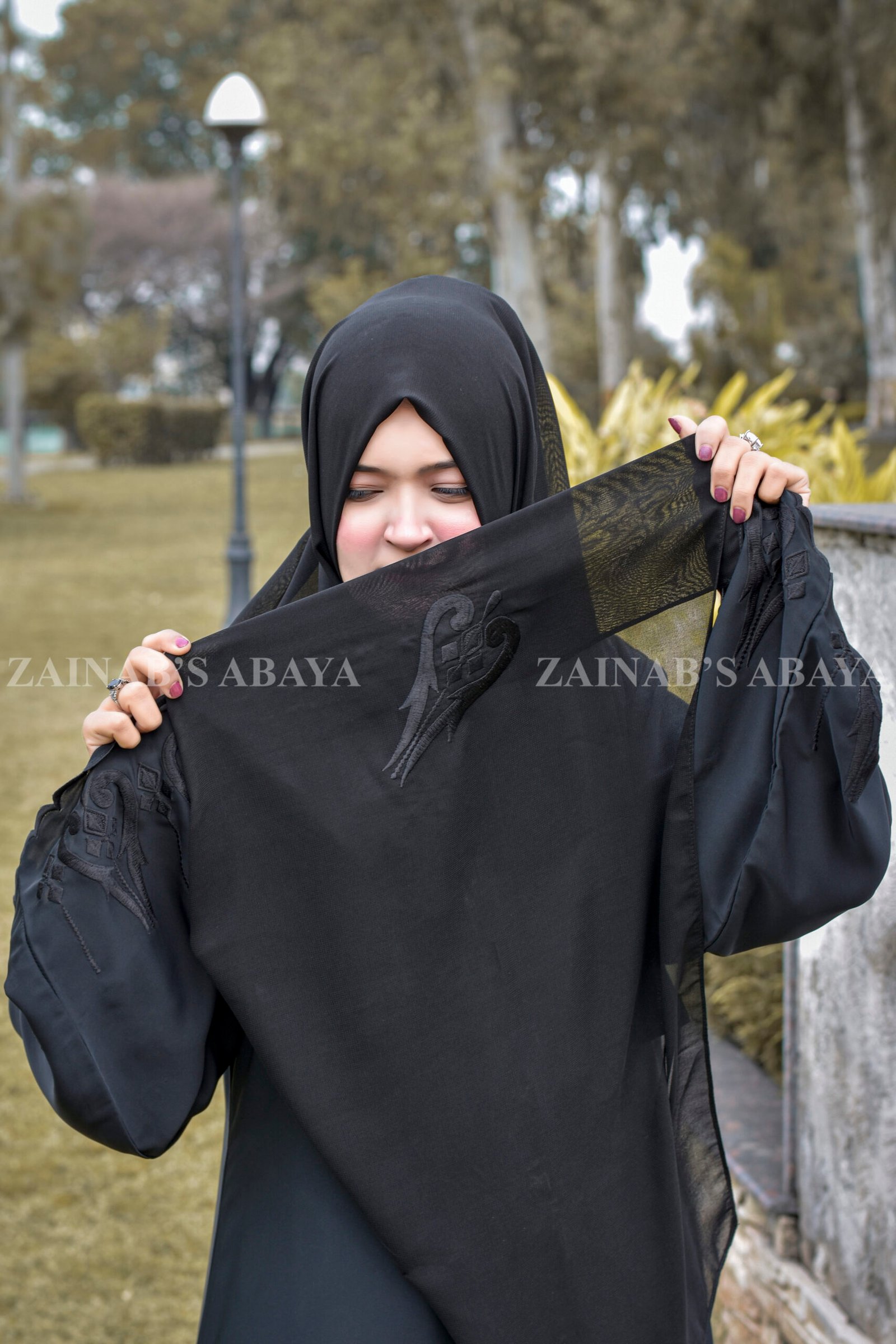 This sleek black front open gown abaya is crafted from premium Nida Korean fabric, featuring sophisticated tone-on-tone embroidery along the cuffs and around the entire hemline. The matching black staler completes the look with elegant motif detailing, creating a monochromatic masterpiece of understated luxury.
