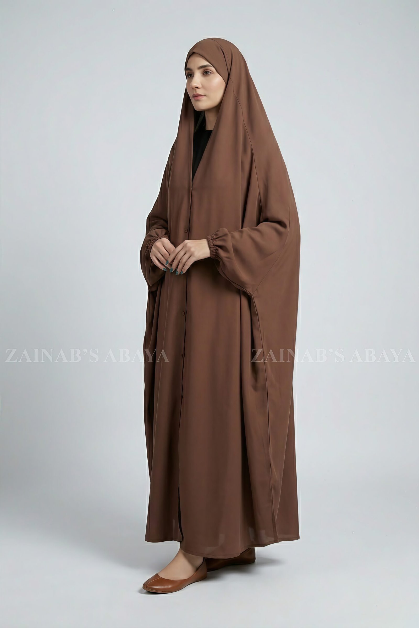 Discover elegance in every detail with our Dark Brown Iraqi Chadar, featuring a front button style, crafted from premium Nida Korean fabric. Modest, stylish, and perfect for daily and formal wear — from Zainab Designer Abaya, the top abaya brand in Pakistan.