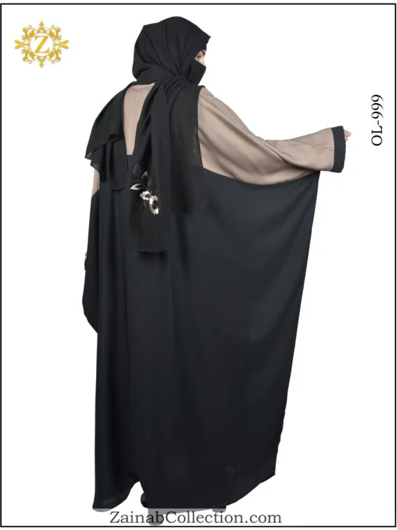 This unique butterfly abaya is crafted from premium Nida Korean fabric, featuring a striking two-tone design. The upper half is in light brown, while the lower half is in black, with light brown sleeves and black cuffs. The front showcases intricate floral embroidery in a black and light brown color combo, adding a refined and sophisticated touch.