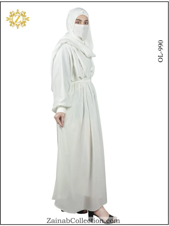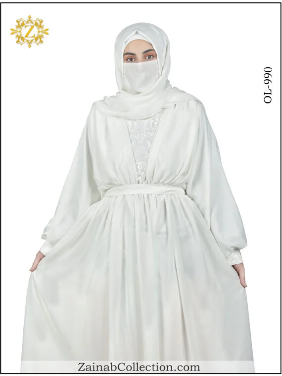 This white maxi abaya is crafted from premium Nida Korean fabric, offering a luxurious and elegant look. The front and sleeves feature intricate white embroidery, while the attached belt adds a polished and sophisticated touch. Perfect for any occasion, this abaya combines timeless style with modern detail.