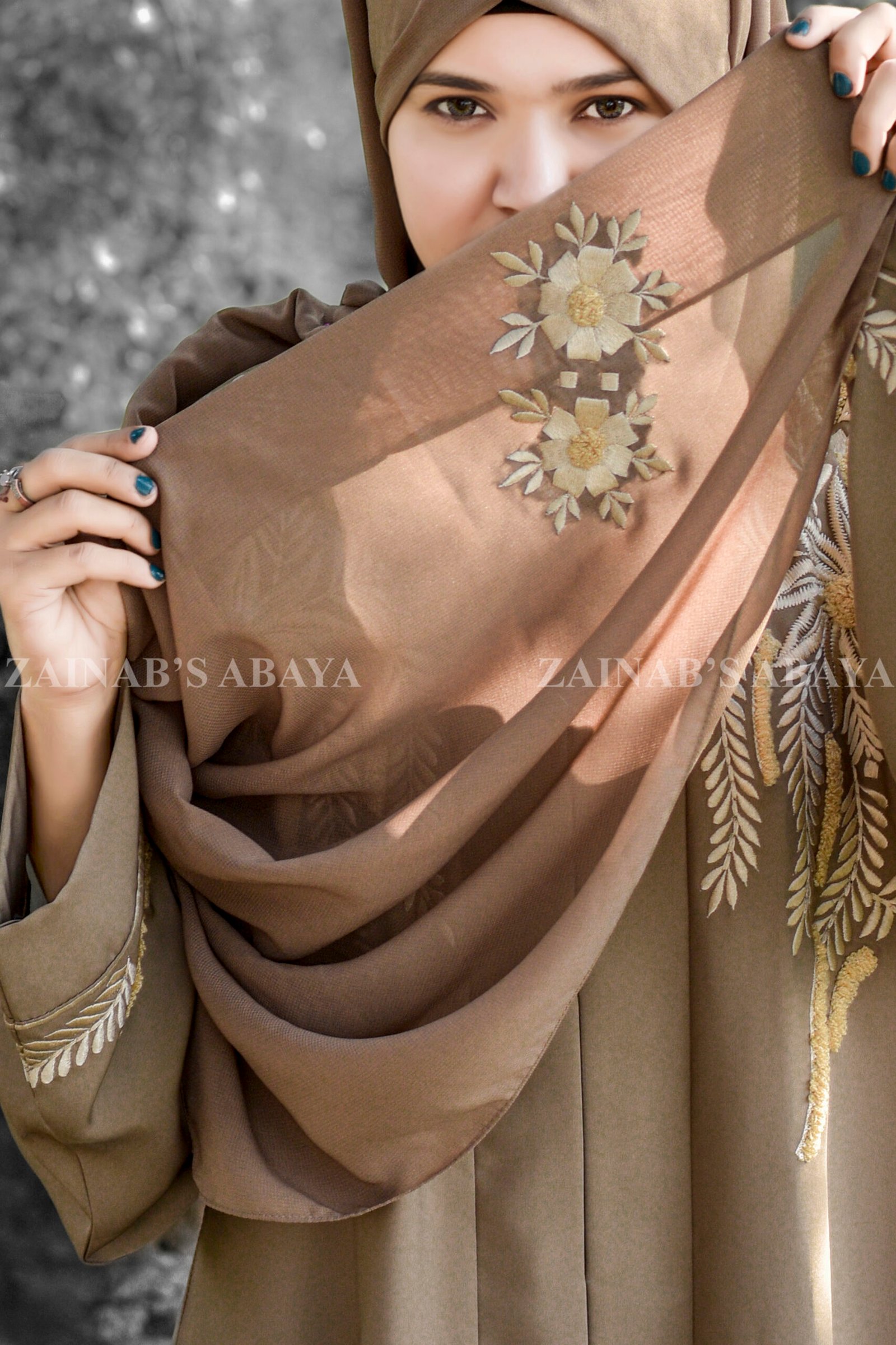 This elegant front open abaya features  delicate embroidery on the front and sleeve cuffs for refined sophistication and is crafted from premium Nida Korean fabric. The matching scarf with motif detailing completes the ensemble with timeless harmony.