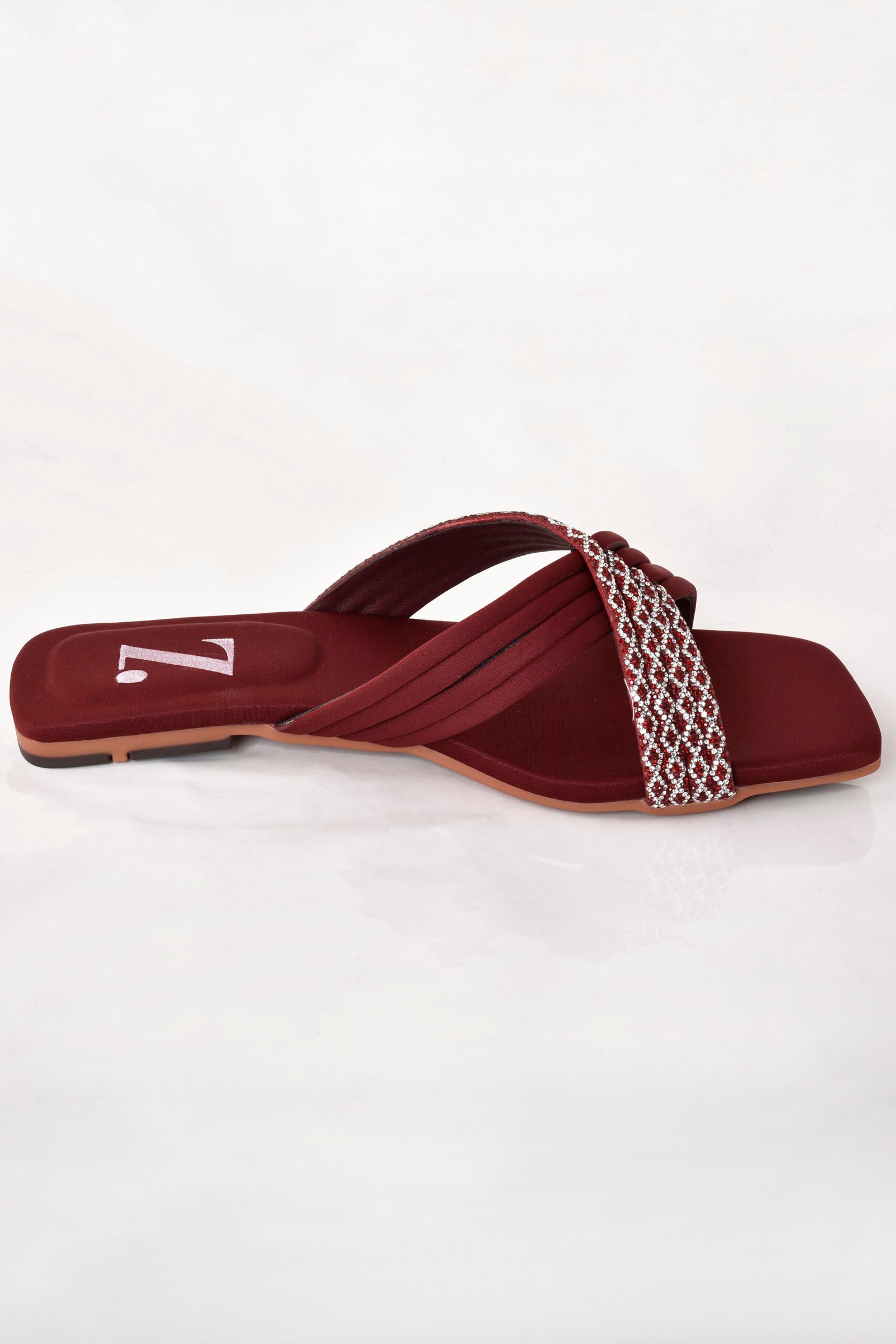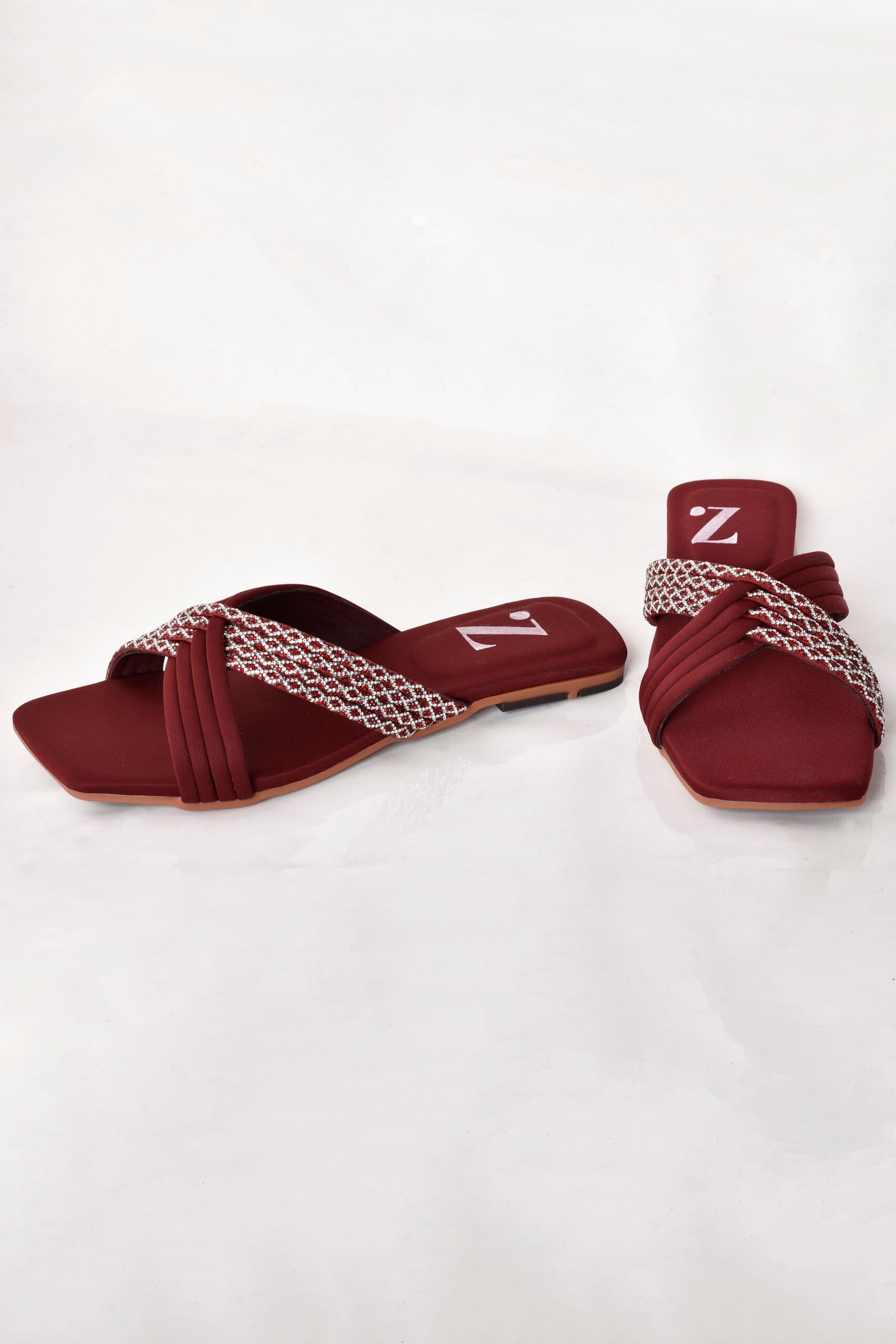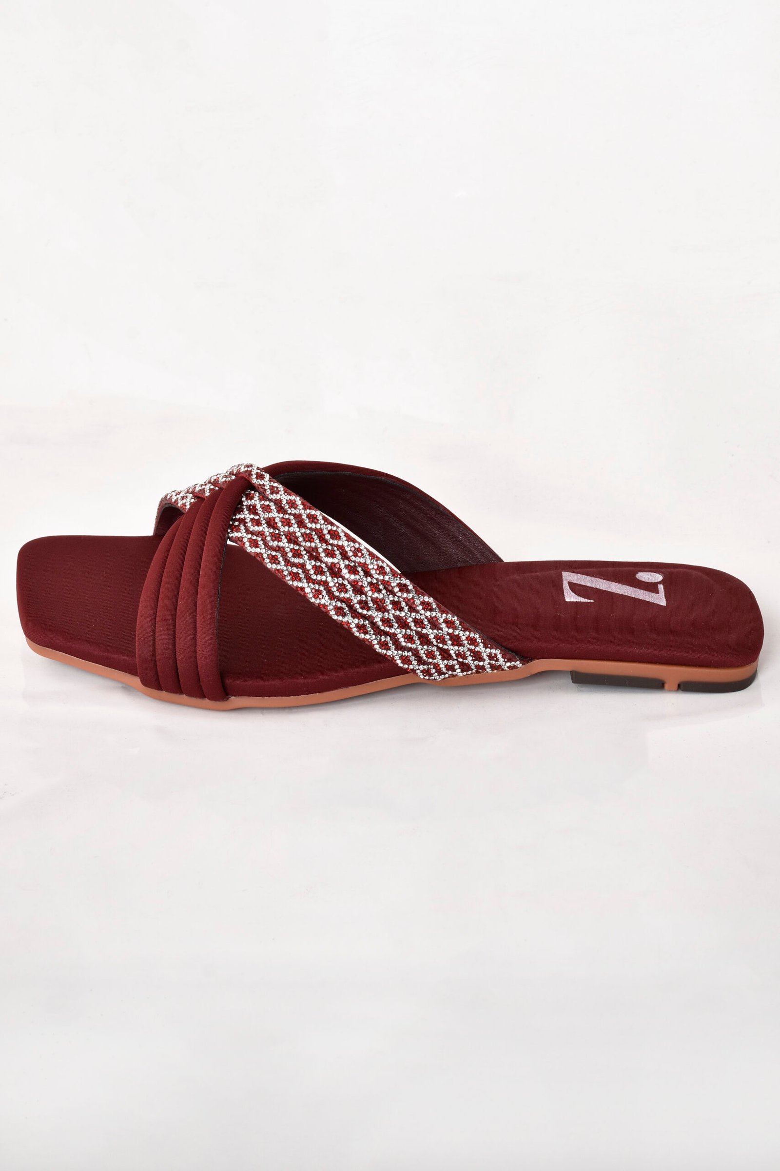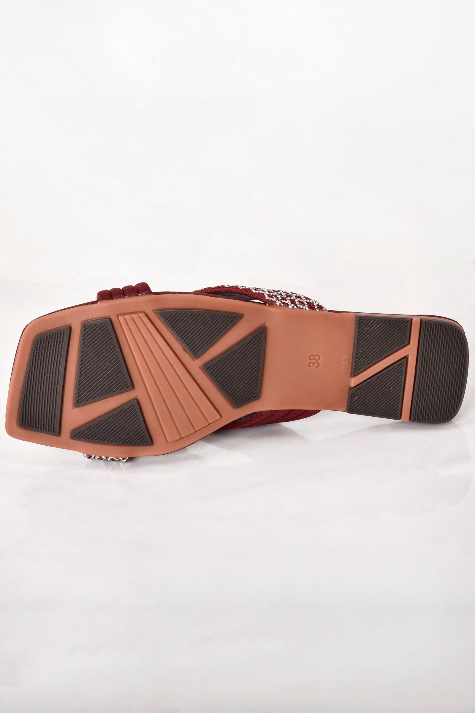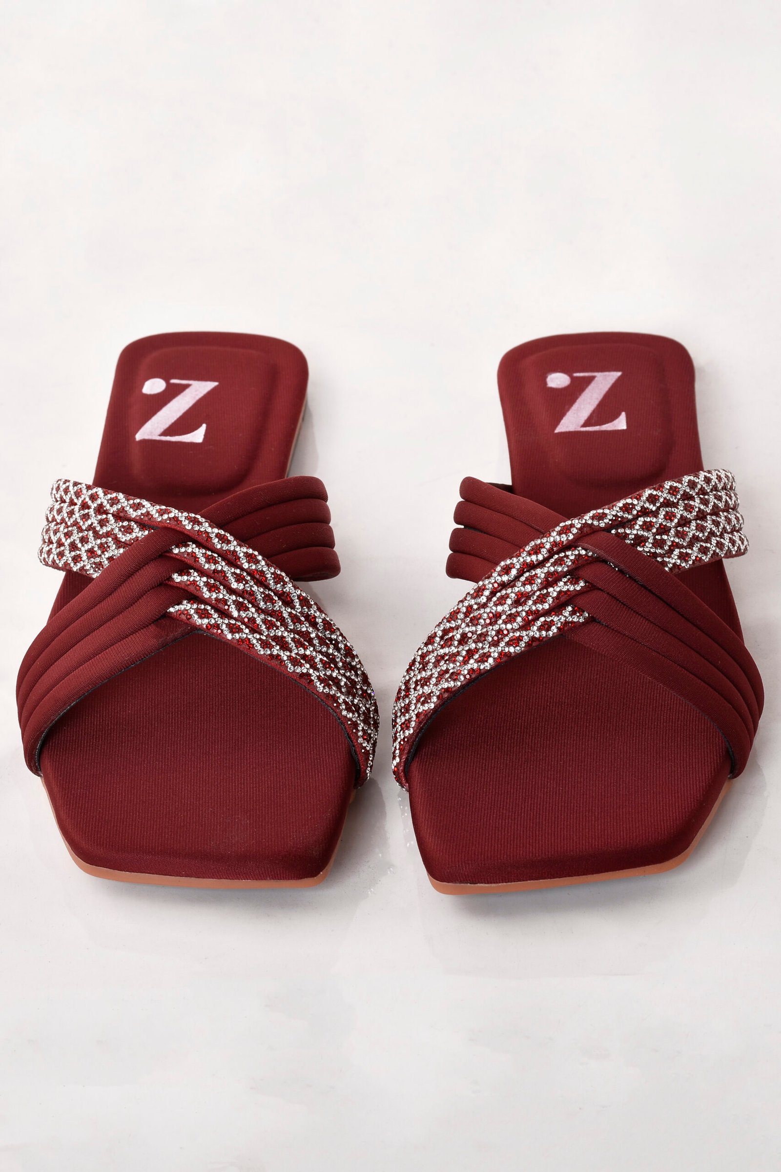 Red formal women slipper with criss-cross stone embellished straps. A rich and elegant design from the Z. Collection by Zainab Designer Abaya. Stylish, comfortable, and perfect for formal wear.