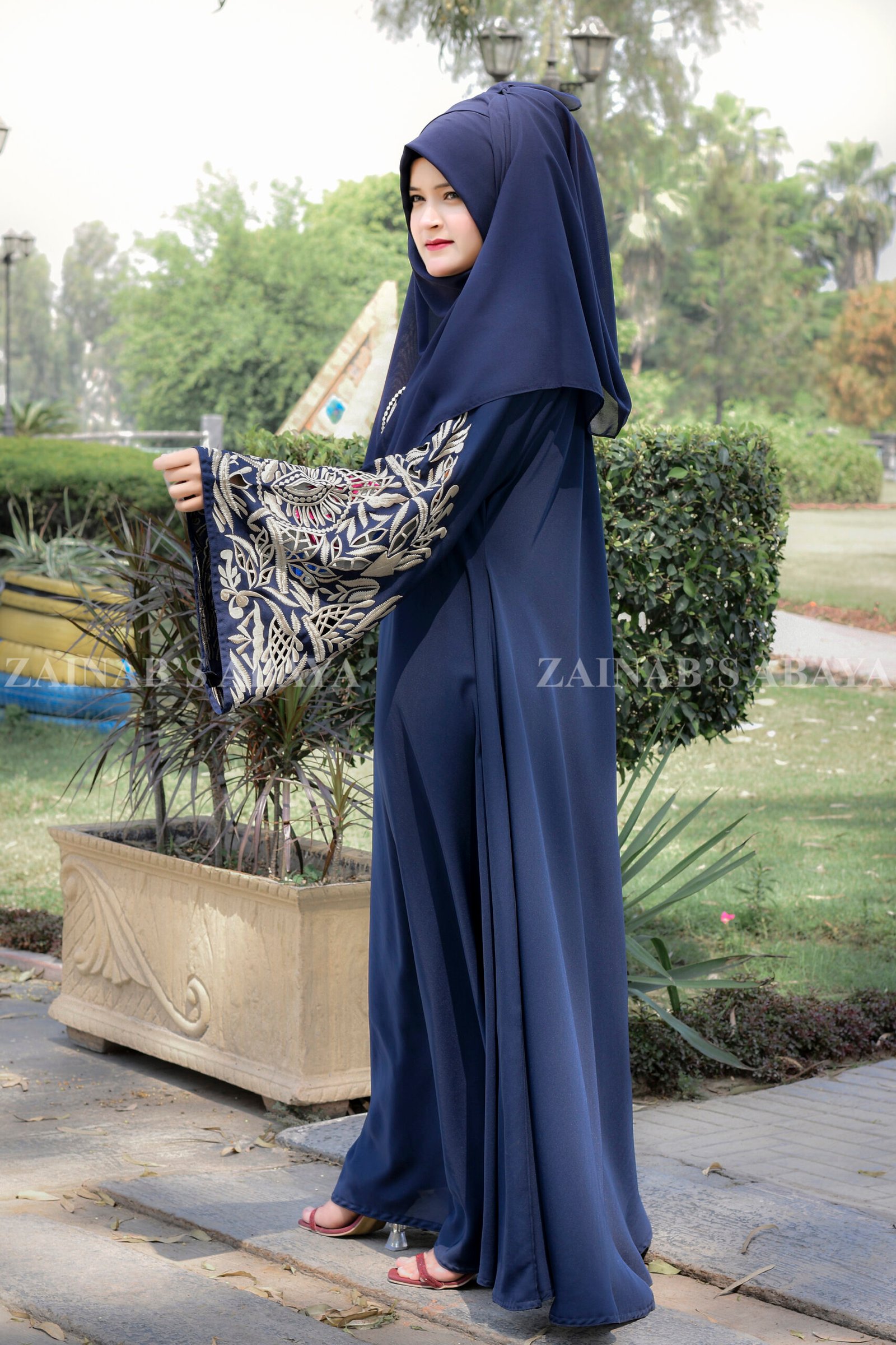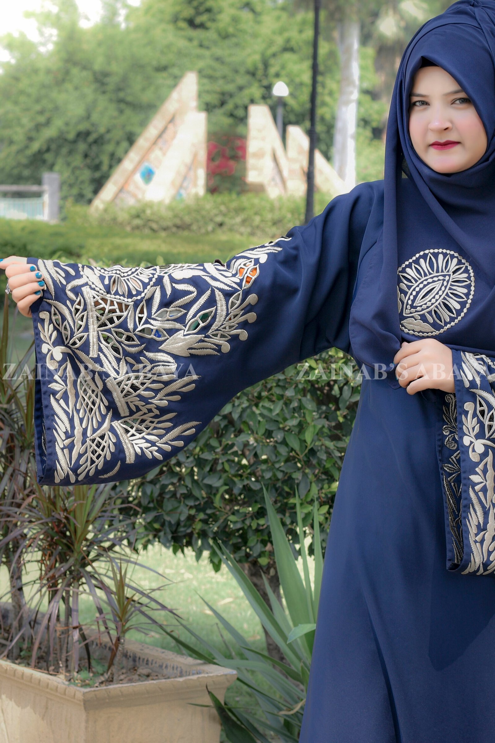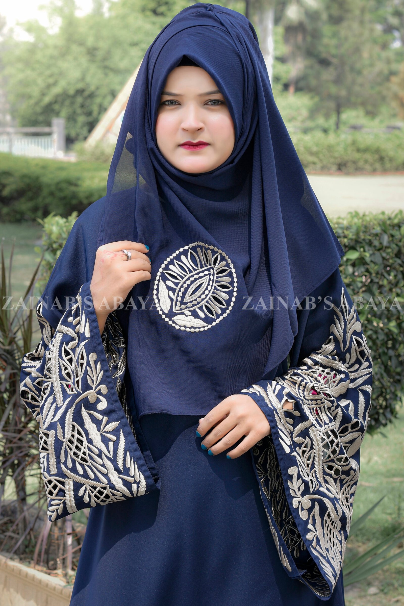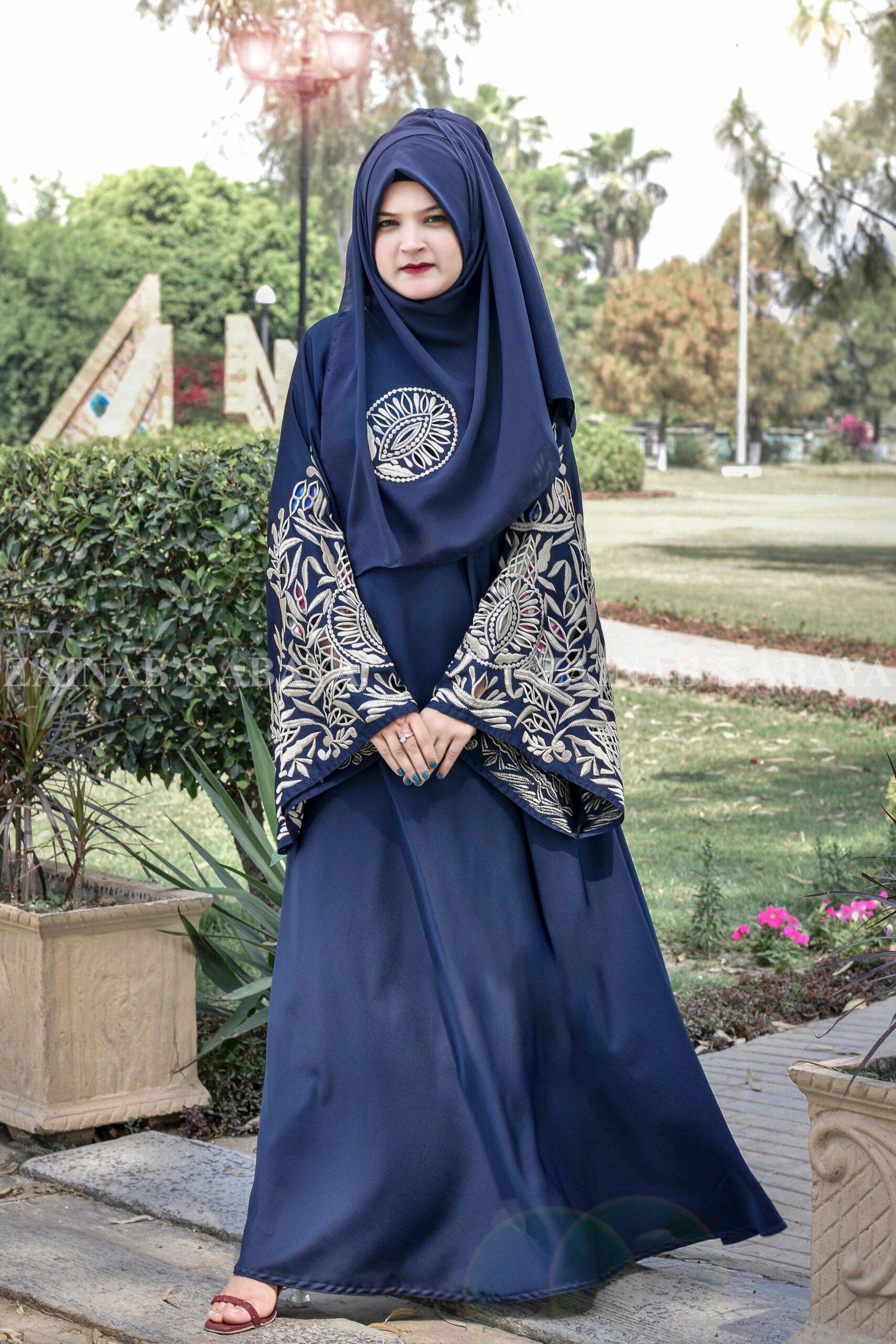 This navy blue Umbrella Abaya is made from soft Nida Korean fabric. It features lots of pretty embroidery designs on the sleeves and comes with a matching navy scarf that has the same nice pattern.