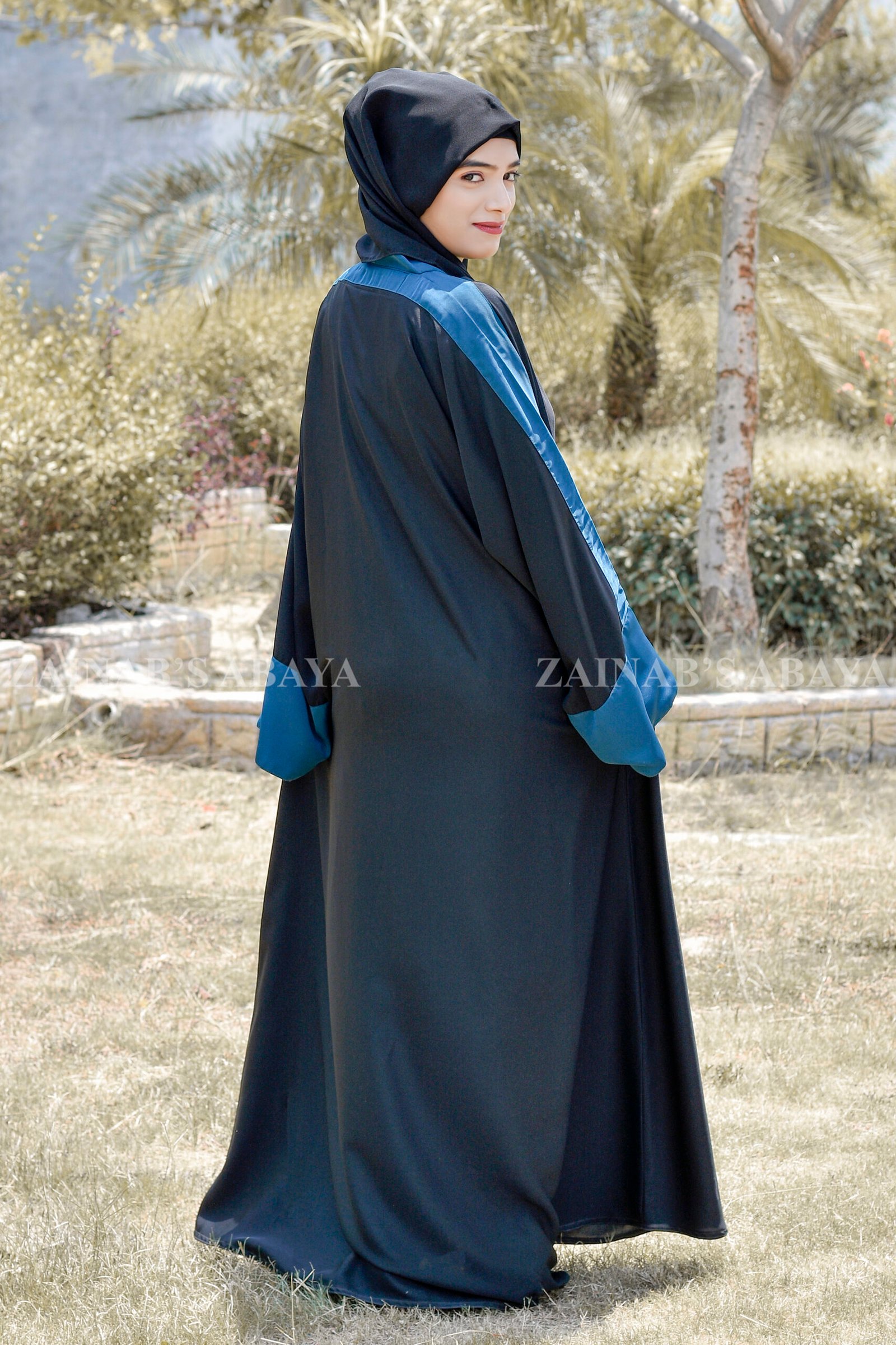 This Front Open Abaya with Double Strap is made from soft Nida Korean fabric. This abaya opens at the front. It features a double colored strap for a stylish look. Includes a matching chiffon scarf with a strap detail.