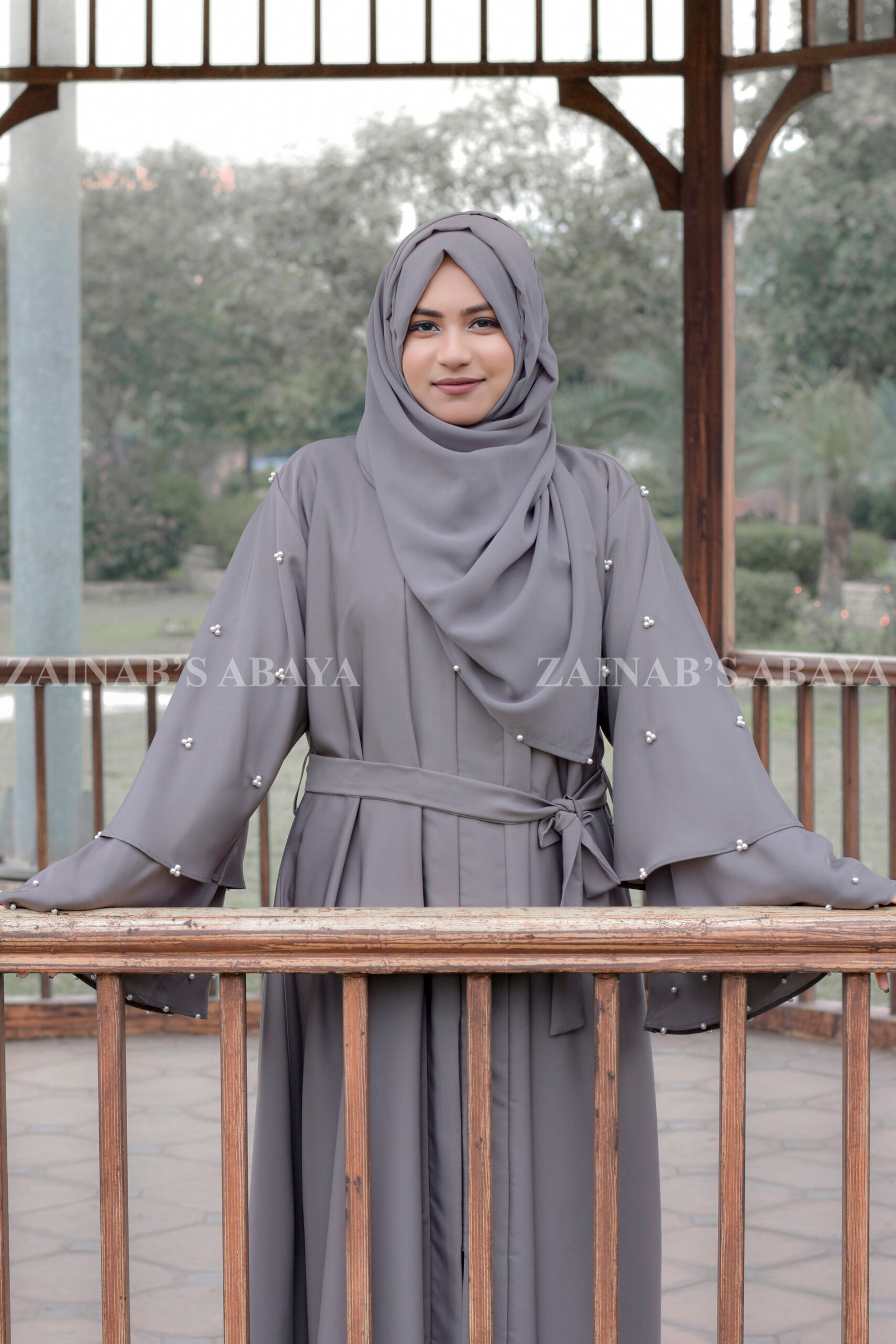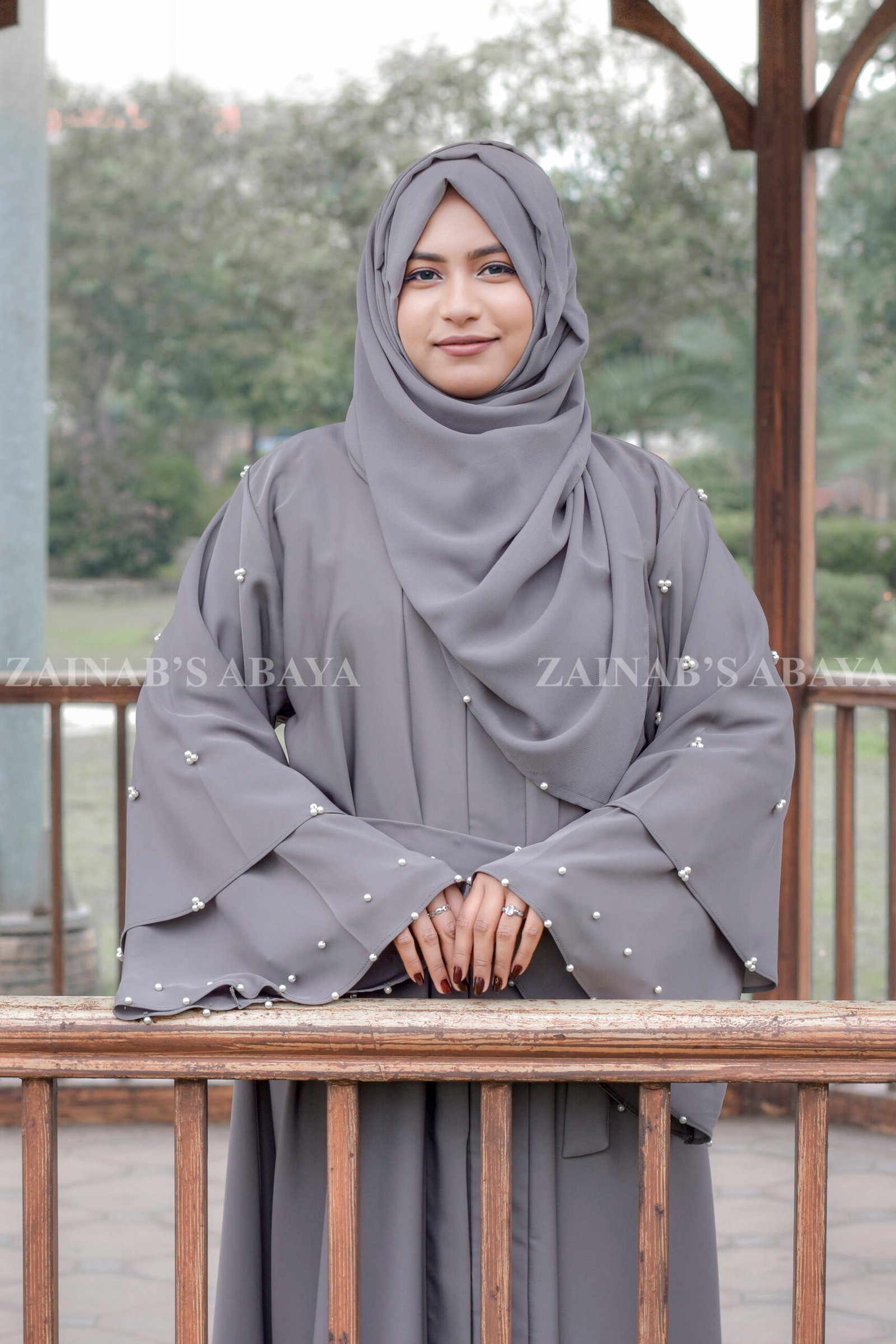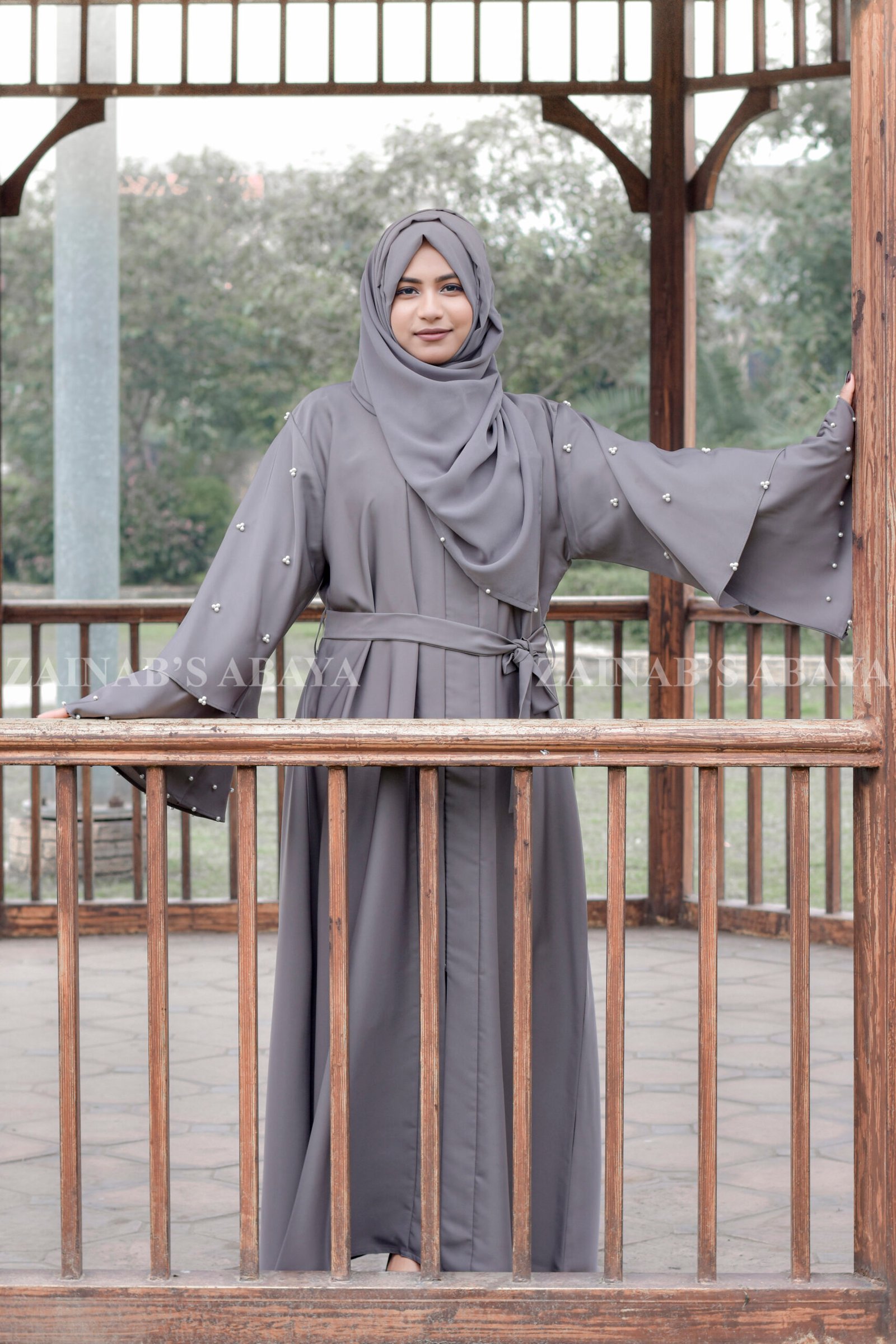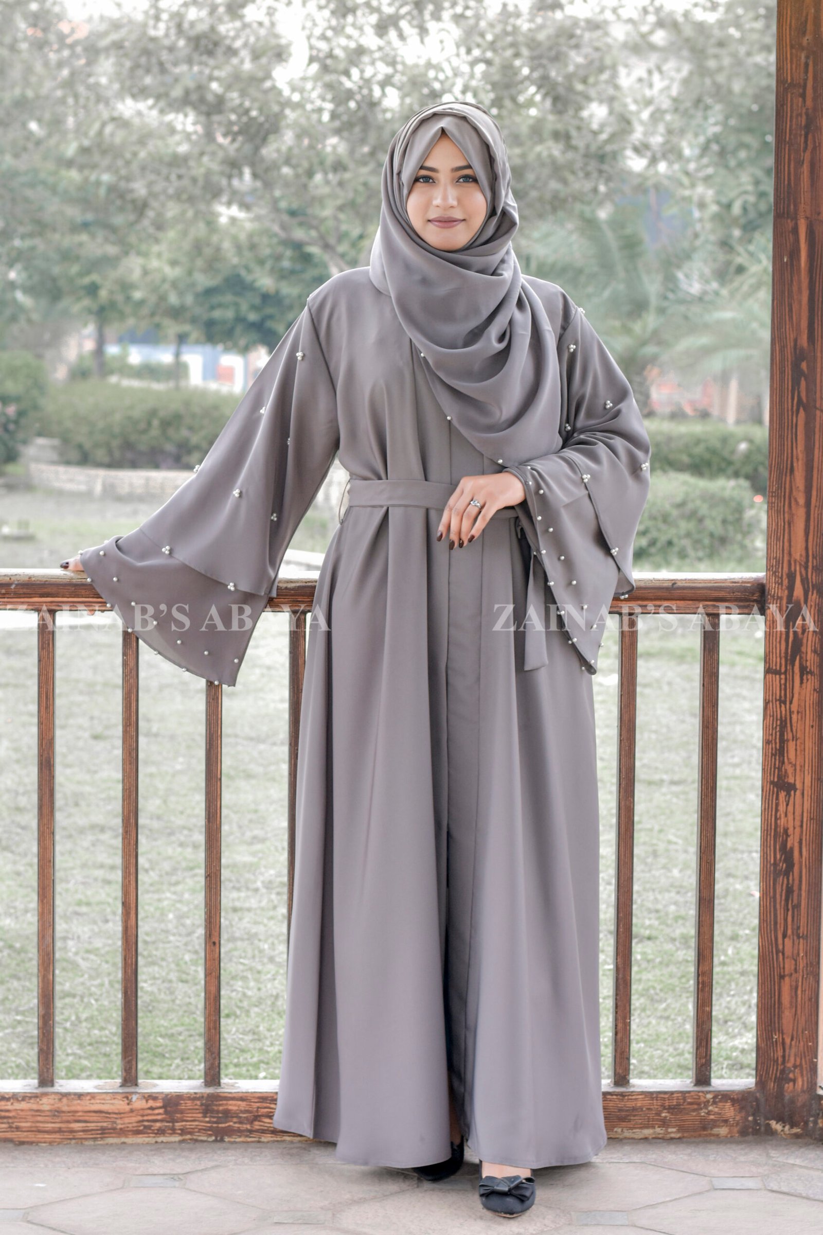 This Light Grey Front Open Abaya with Pearl Sleeves is made from soft Nida Korean fabric. This light grey abaya opens at the front. It has double-layer sleeves with shiny pearl details. Includes a matching light grey chiffon scarf with the same pearl design.