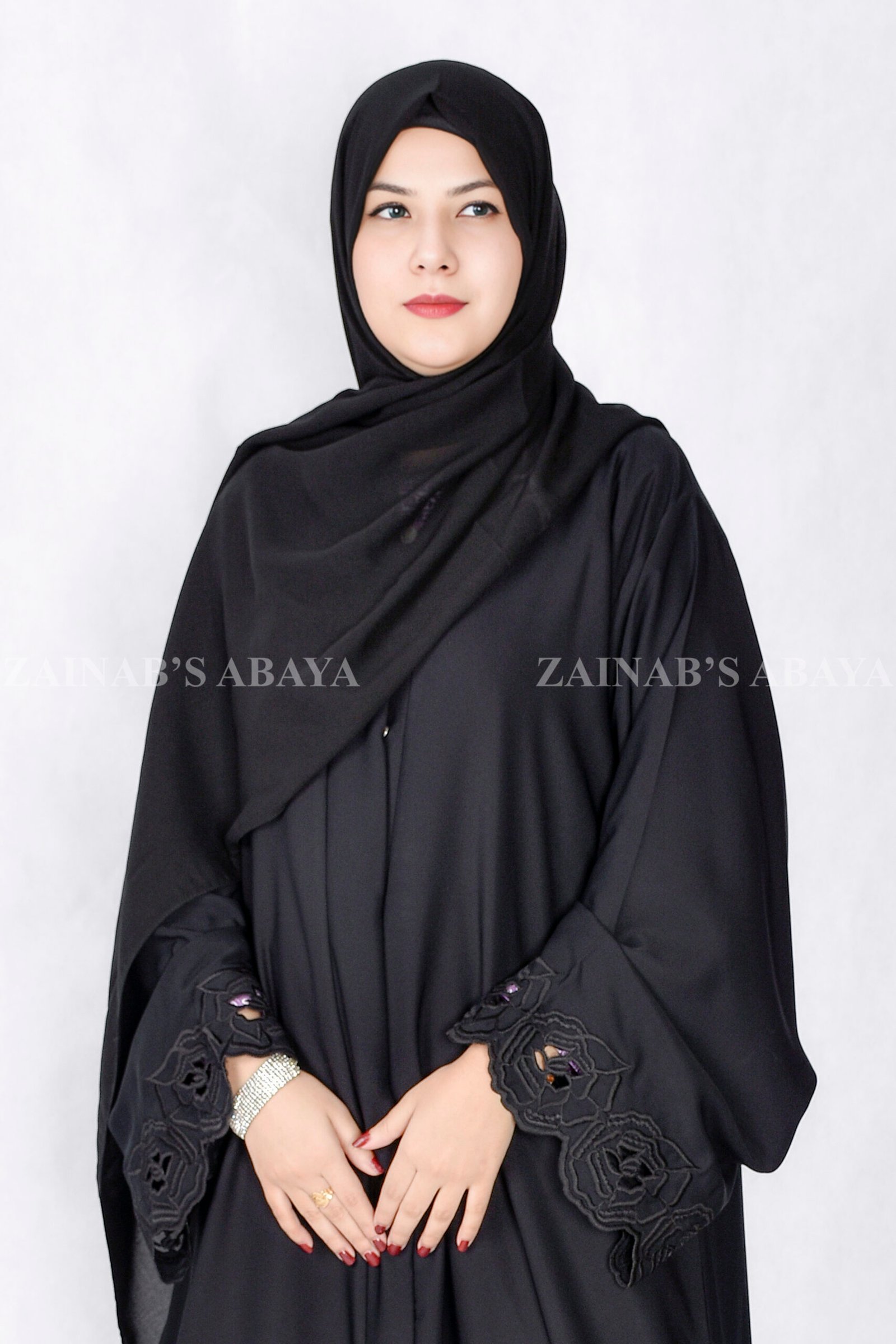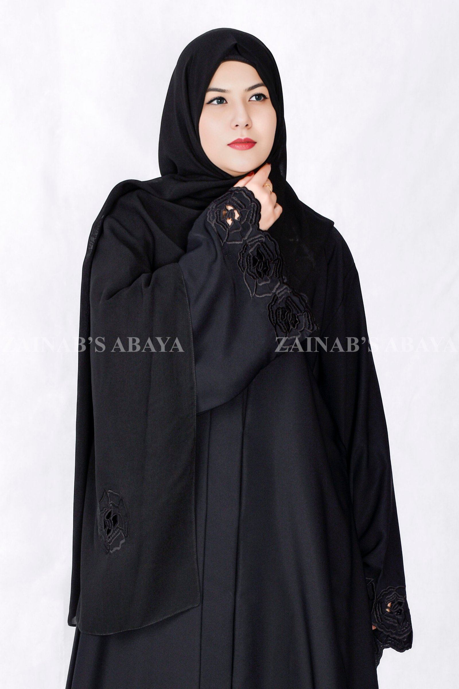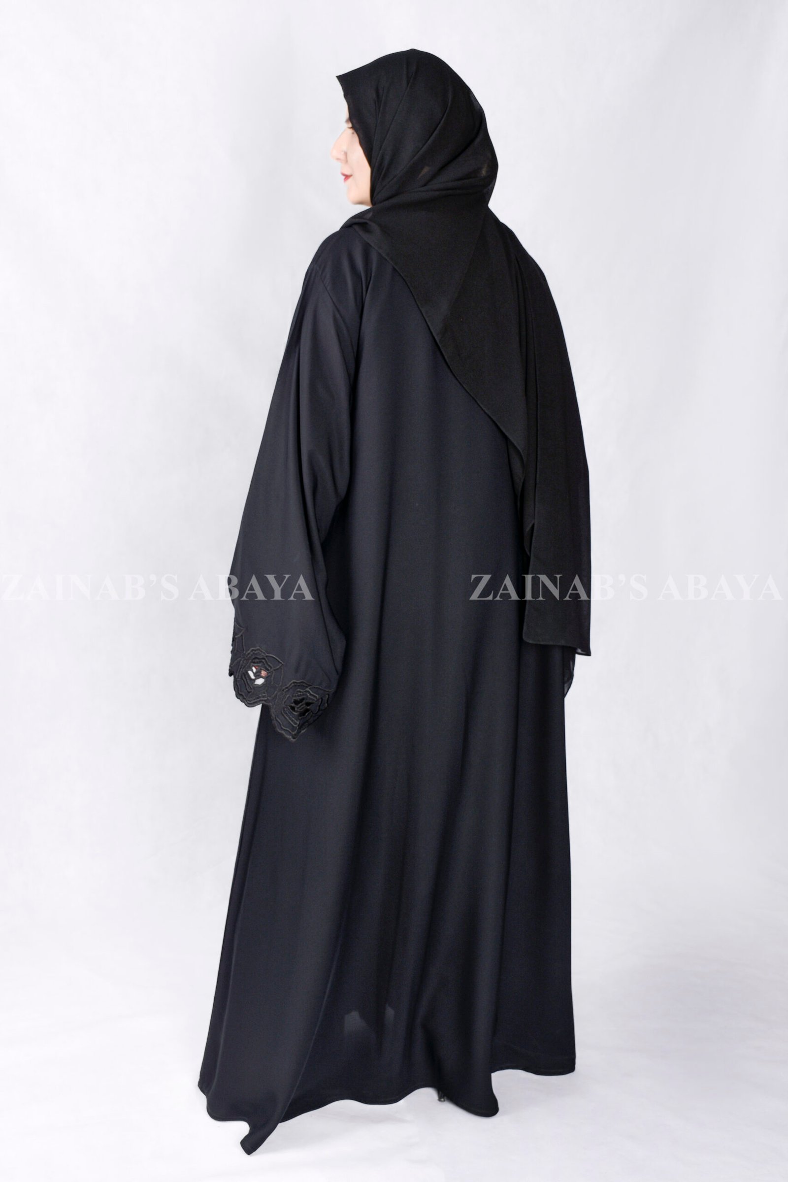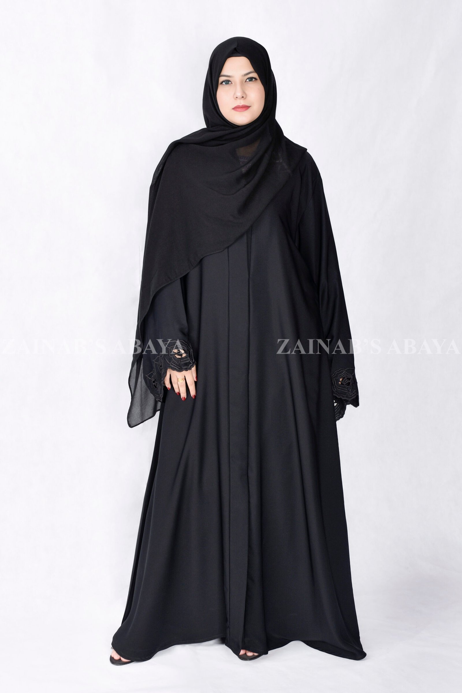 Black Front Open Abaya with Embroidery & Cut Work, made from soft Nida Korean fabric. It features pretty stitch designs and delicate cut work on the sleeve ends. Includes a light, see-through scarf in matching black.