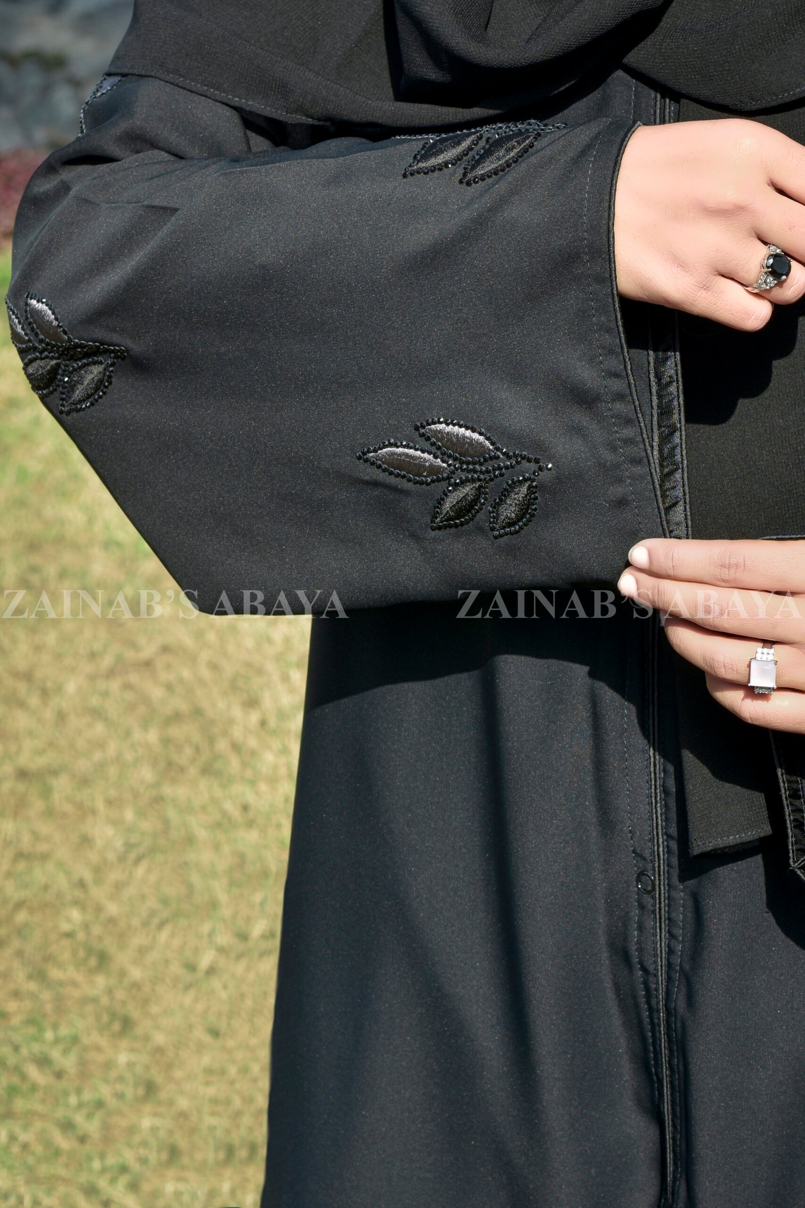 This black front open abaya features elegant black stone work on the sleeves and functional buttons, offering a modern, polished look for any occasion.
