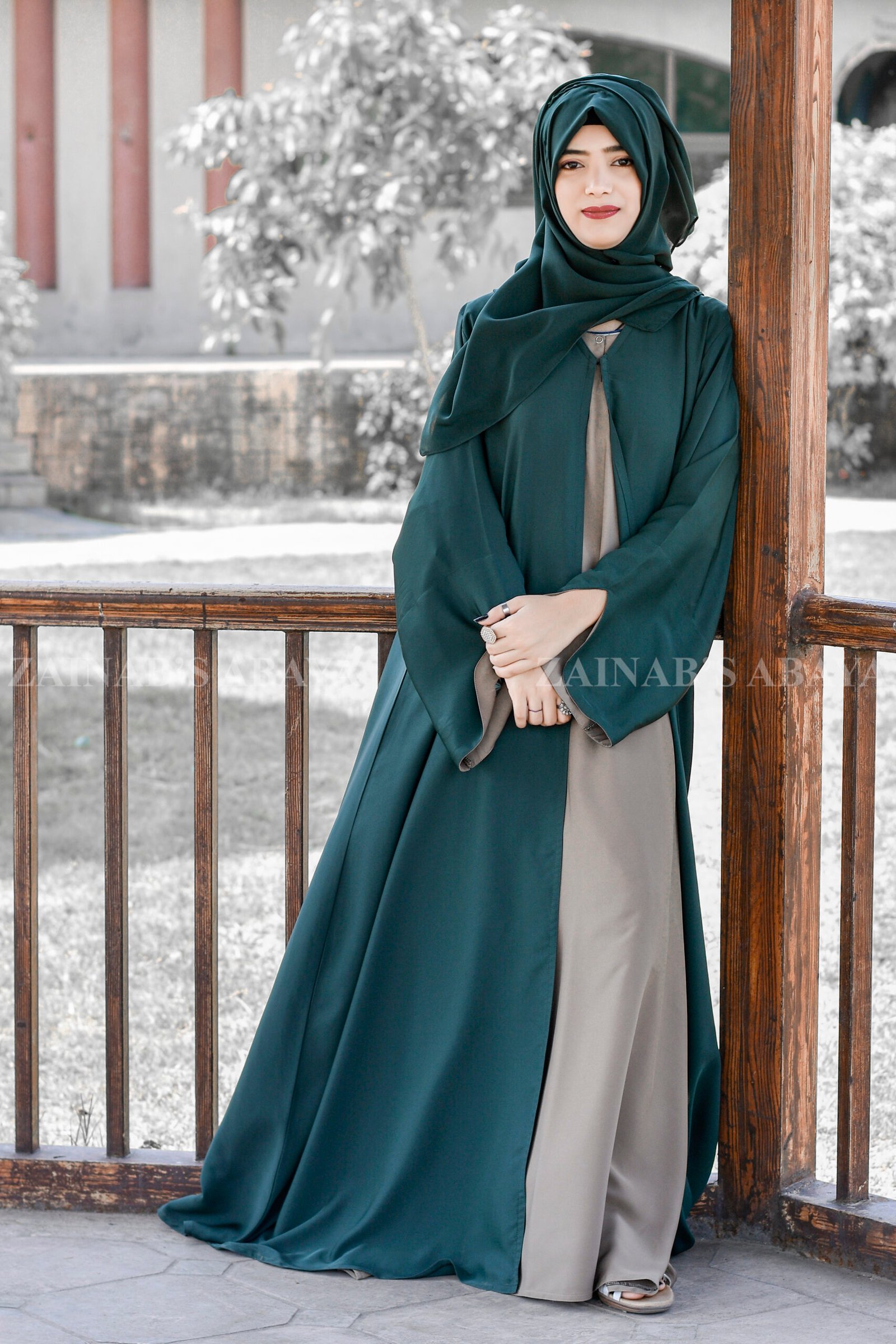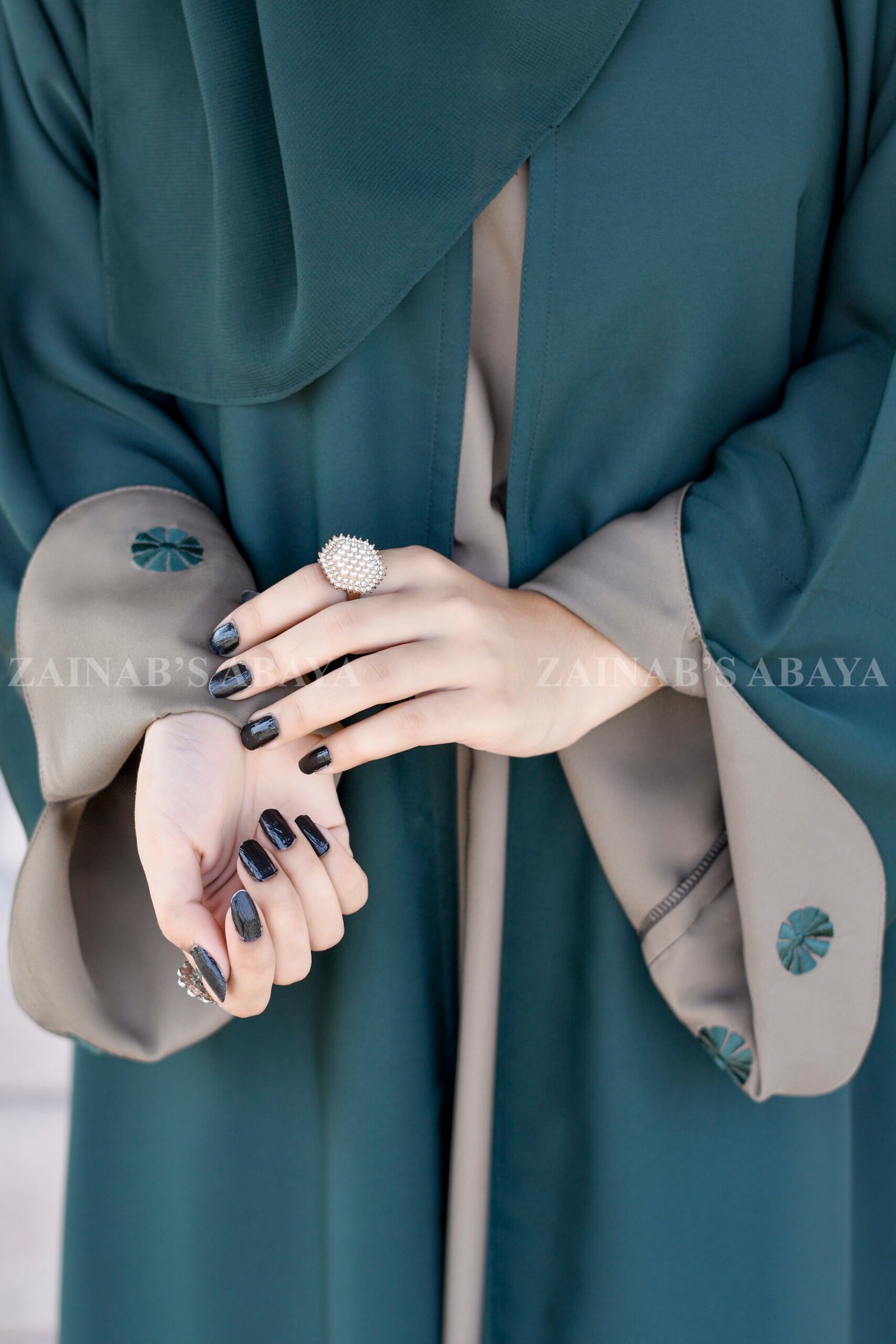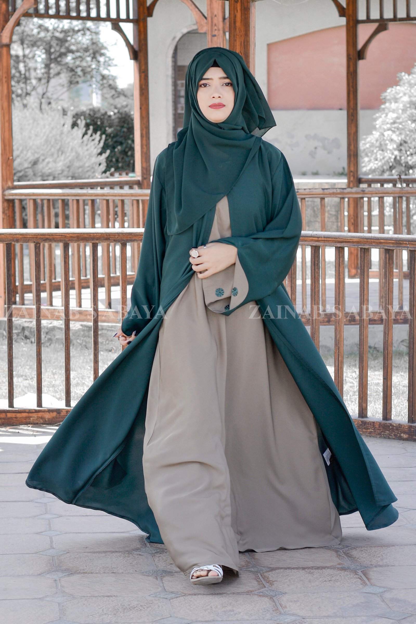 This Gown Abaya with Inner Maxi is made from soft Nida Korean fabric. This abaya features pretty stitch designs on the sleeve ends. Includes a matching chiffon scarf.