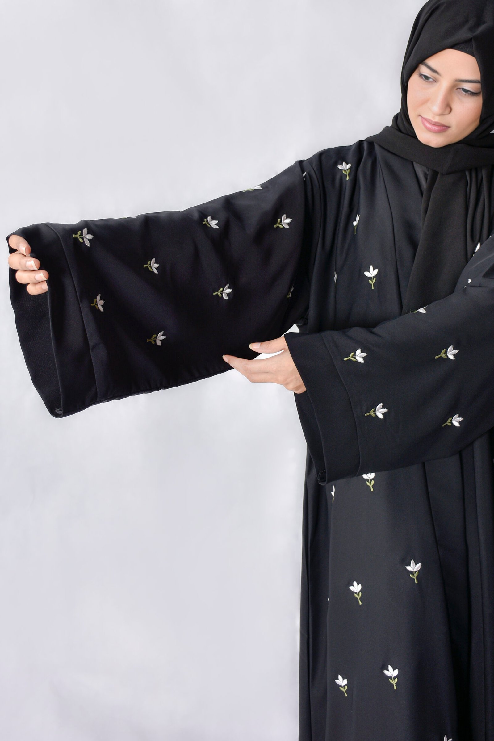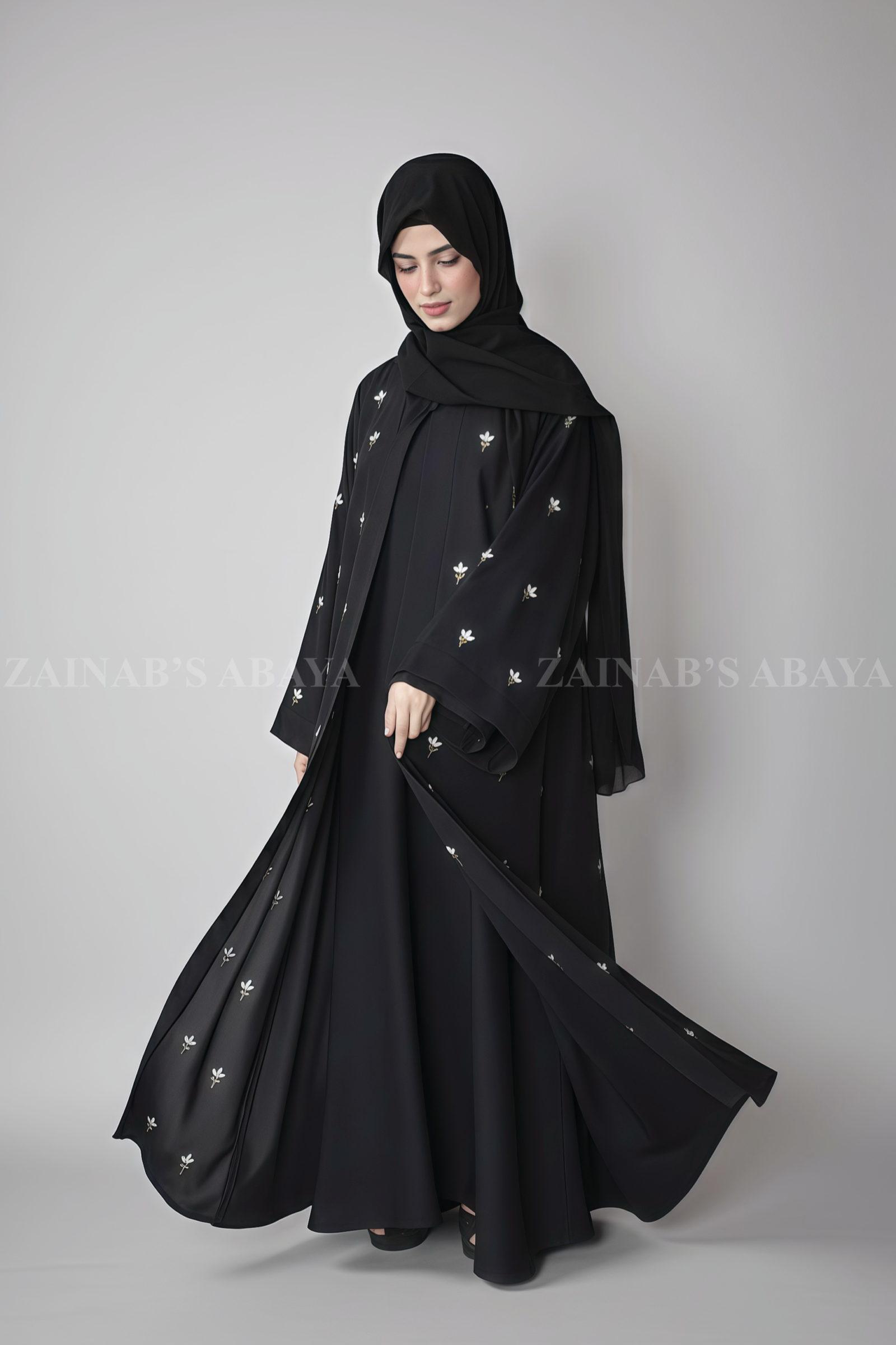 This Double Gown Abaya with Embroidery is crafted with Premium Nida Korean Fabric. This two-layer gown abaya has pretty embroidery designs on the front and sleeves. Includes a matching chiffon scarf with the same pattern.