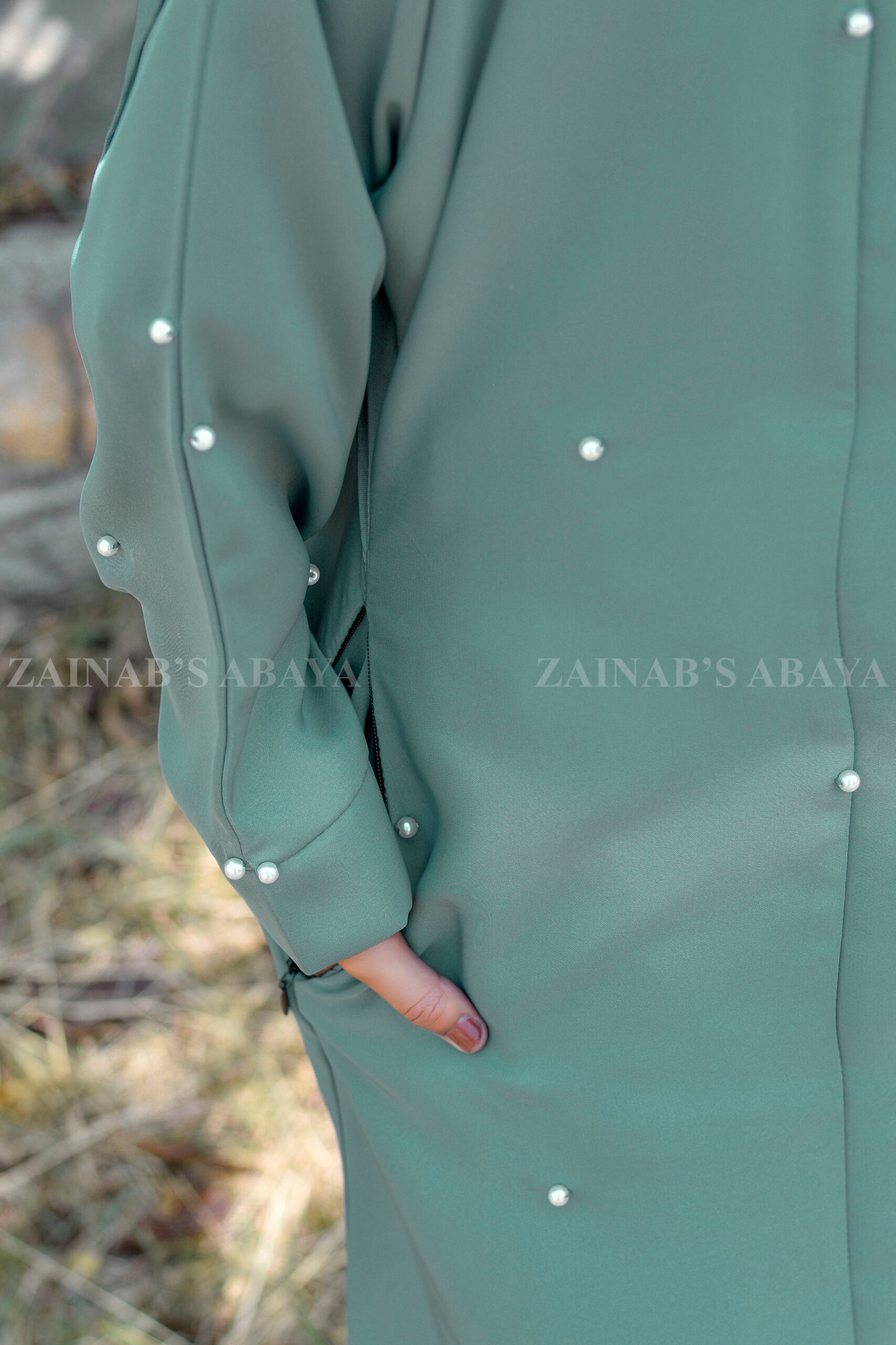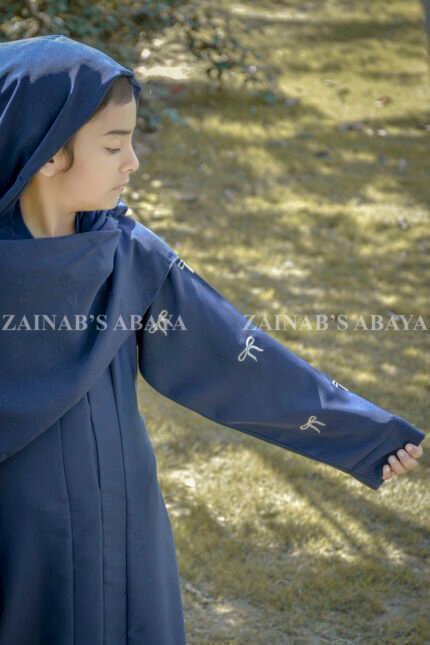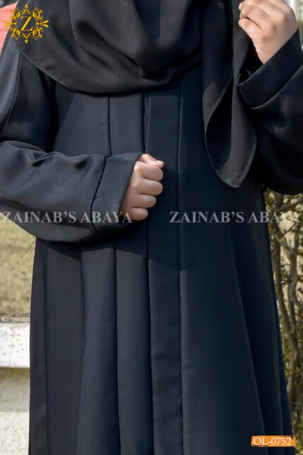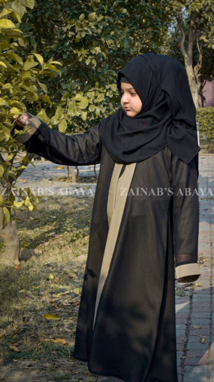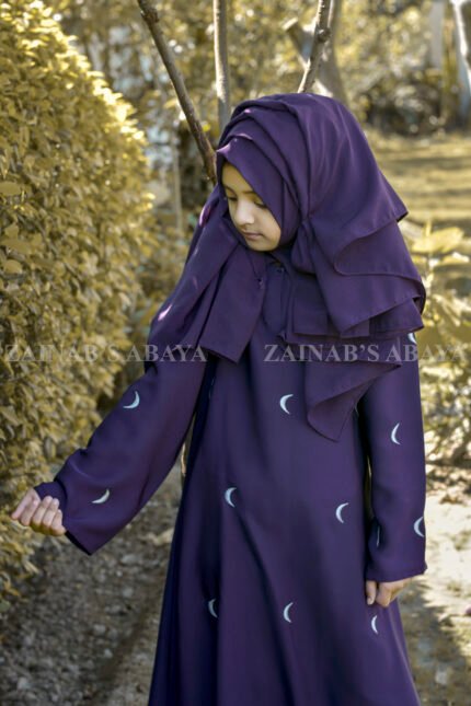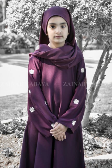 This Grape Colored Front Open Abaya for Kids is made up of Premium Nida Korean Fabric. It has shiny pearl work on front and sleeves and two side pockets. Includes a matching scarf in chiffon fabric with pearls along the border.