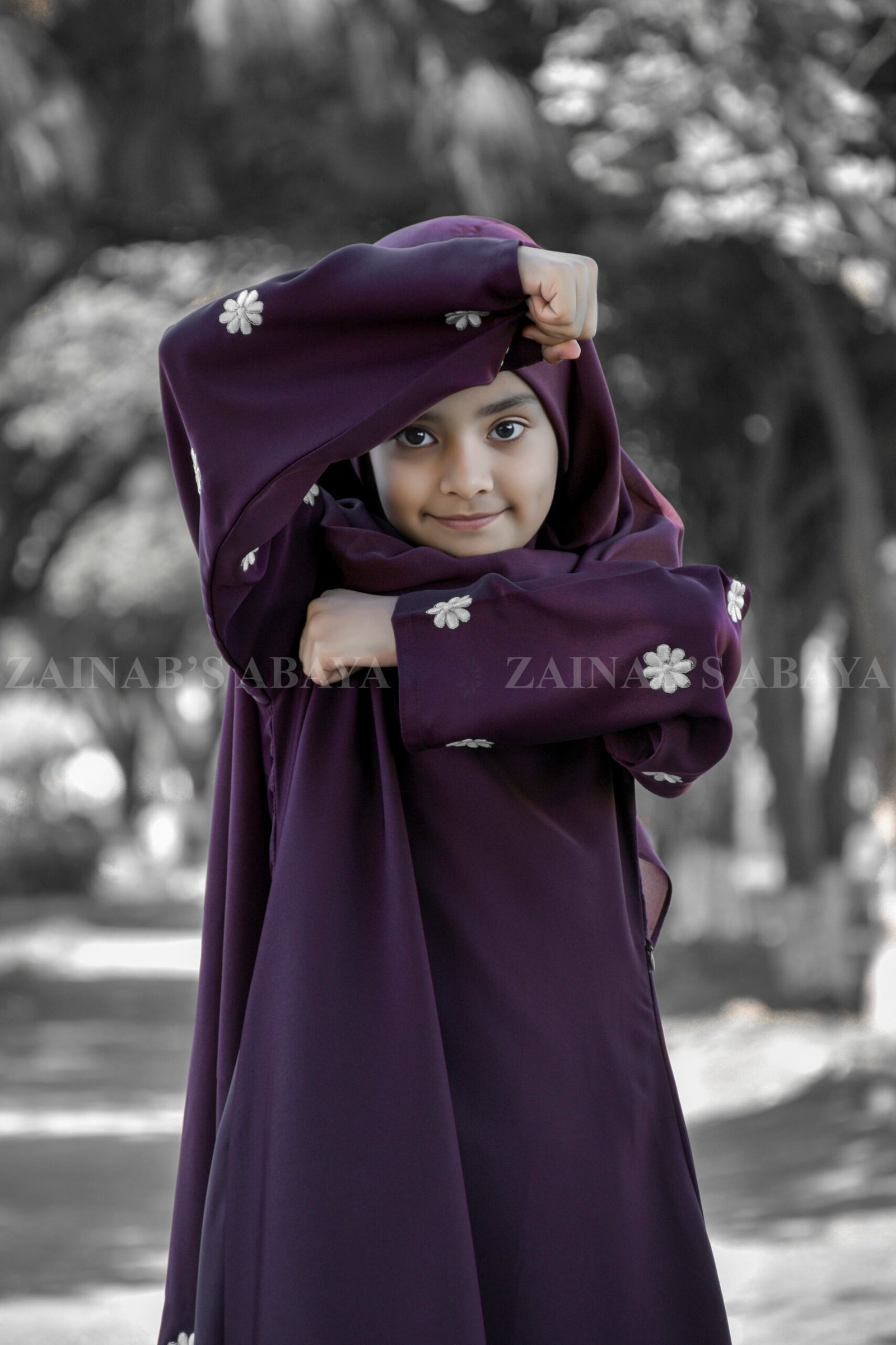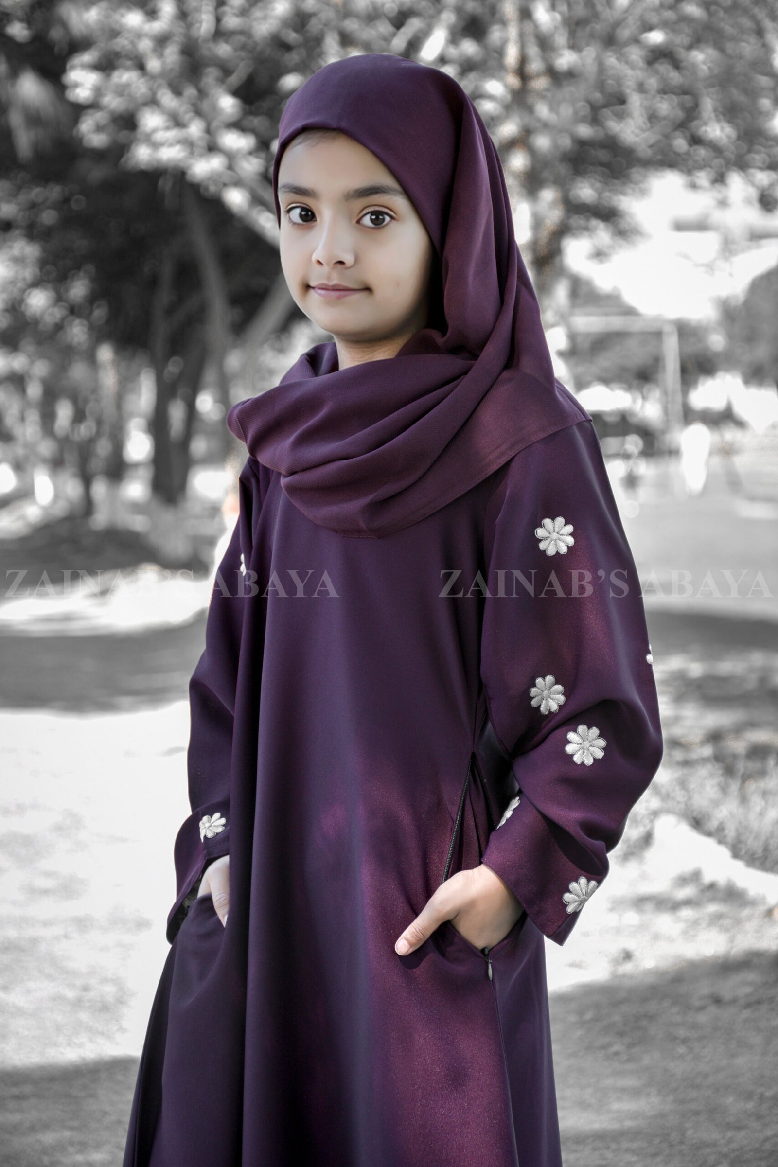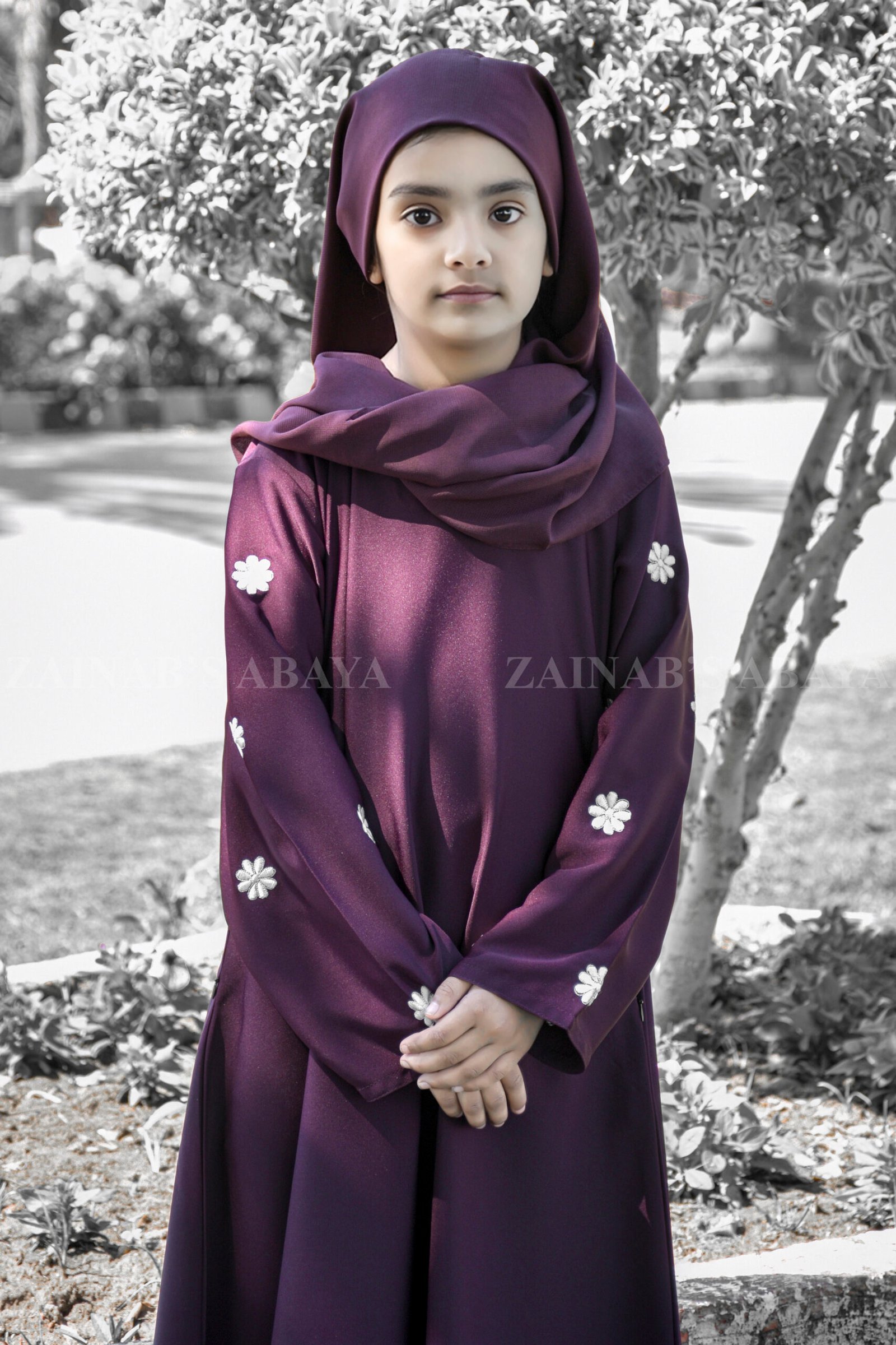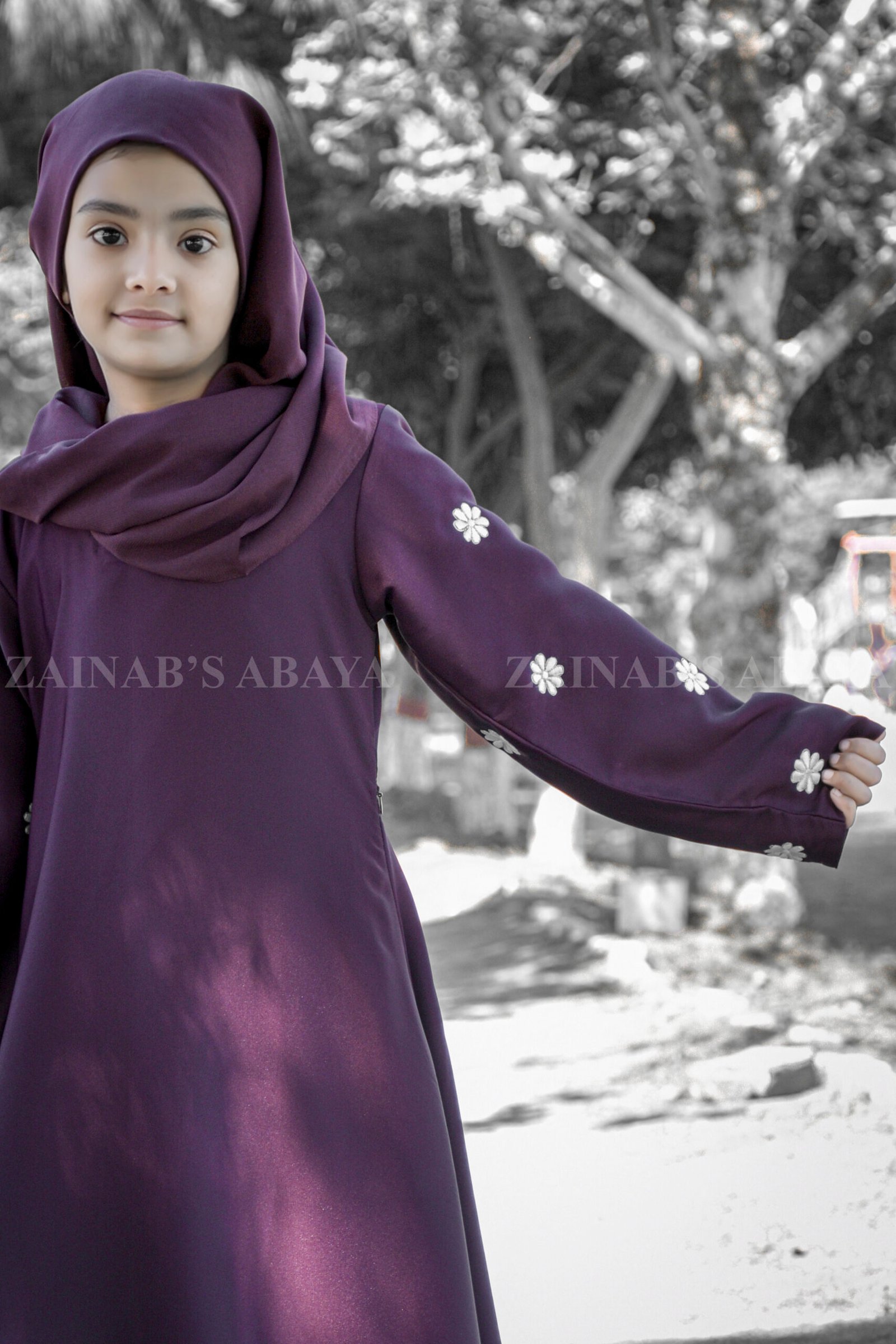 This purple colores maxi abaya is adored for your little one, specially crafted from ultra-soft Nida Korean Fabric for delicate skin. This maxi abaya features elegant white floral embroidery, creating a magical look perfect for any occasion.