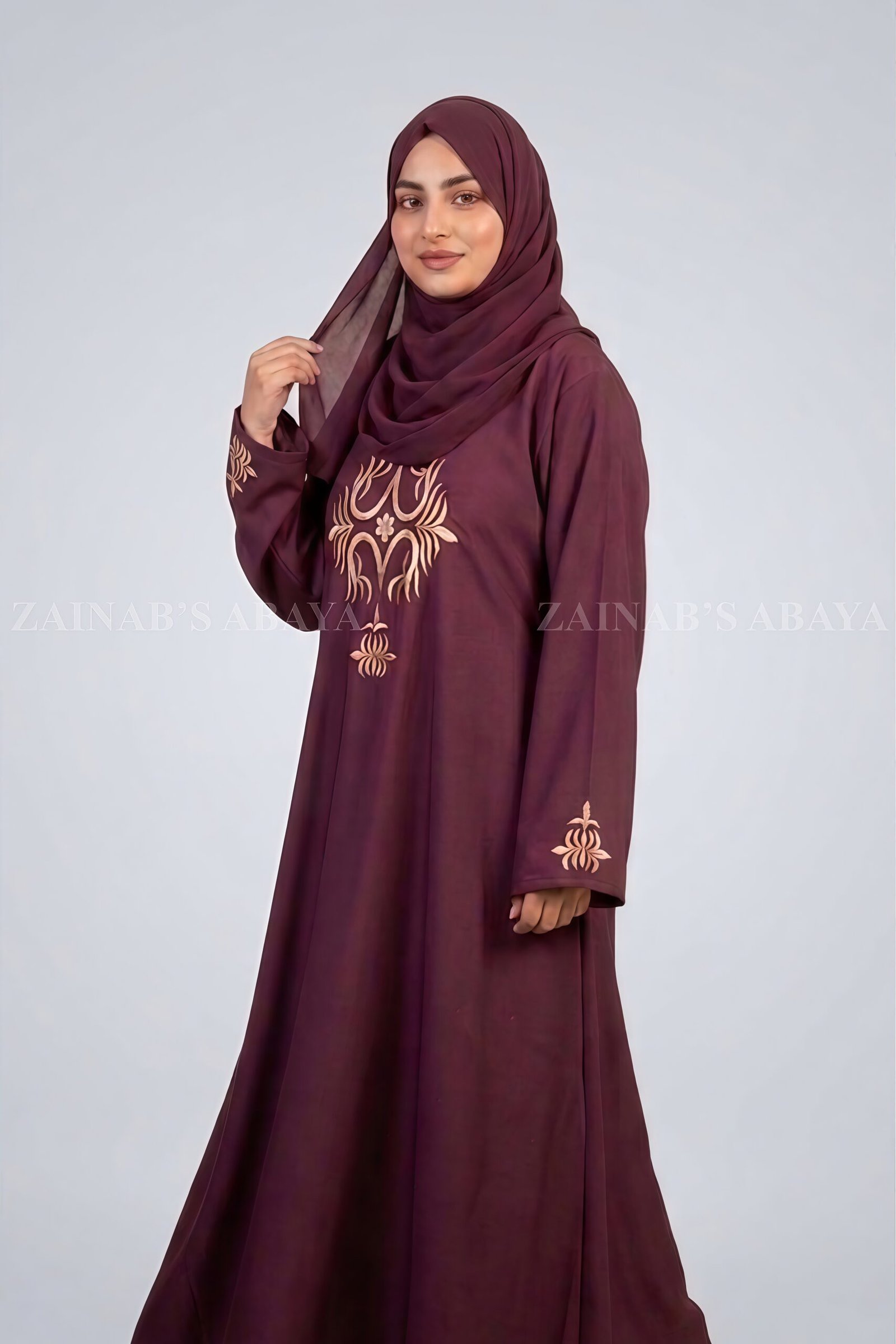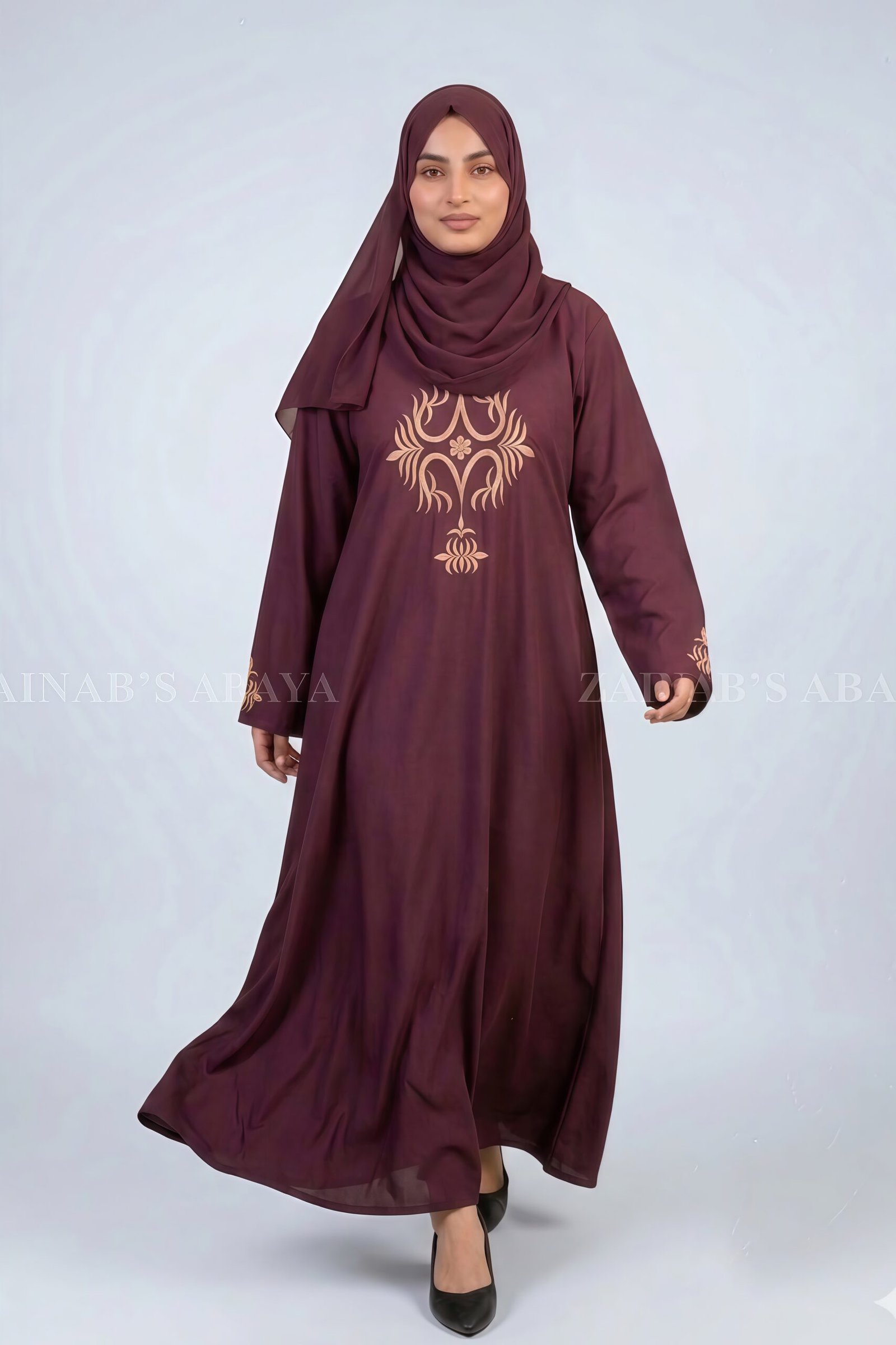 This maroon maxi abaya for women is a perfect blend of elegance and affordability. Made with Premium Nida Korean Fabric, it offers a soft and flowing feel. The embroidery on the front and sleeve cuffs adds a stylish touch, while the matching chiffon scarf completes the look beautifully.