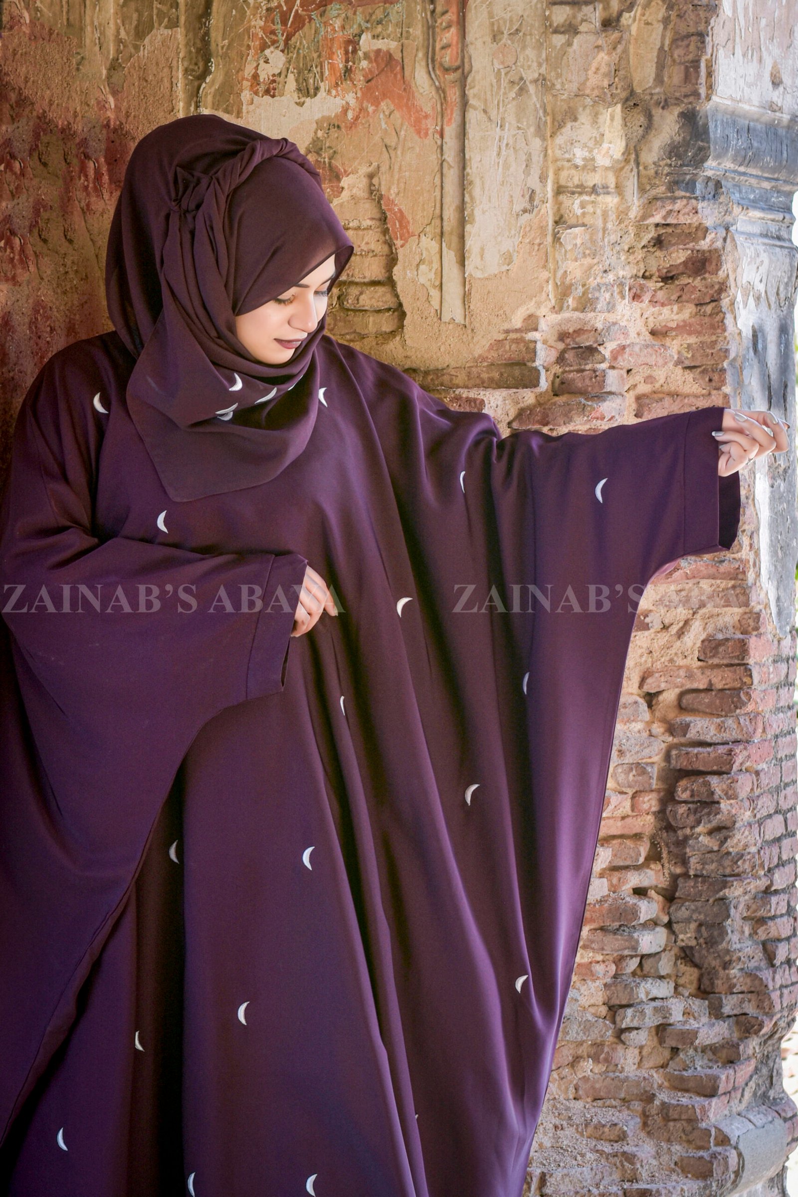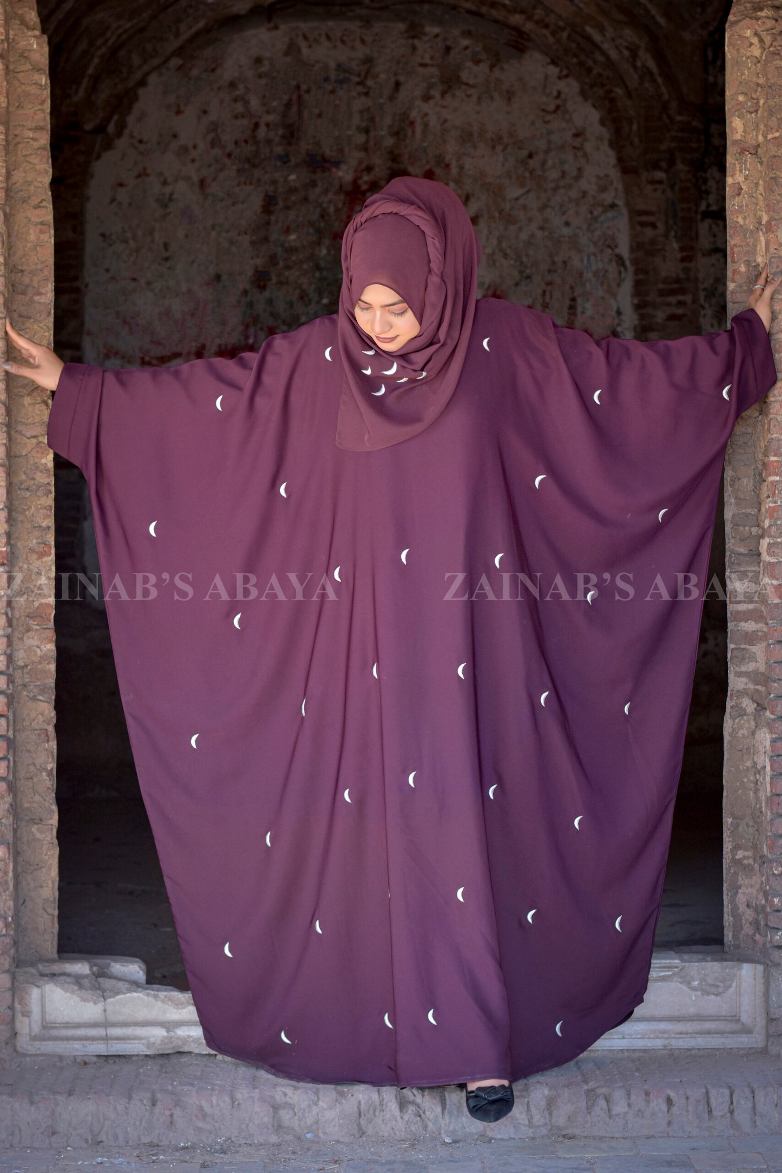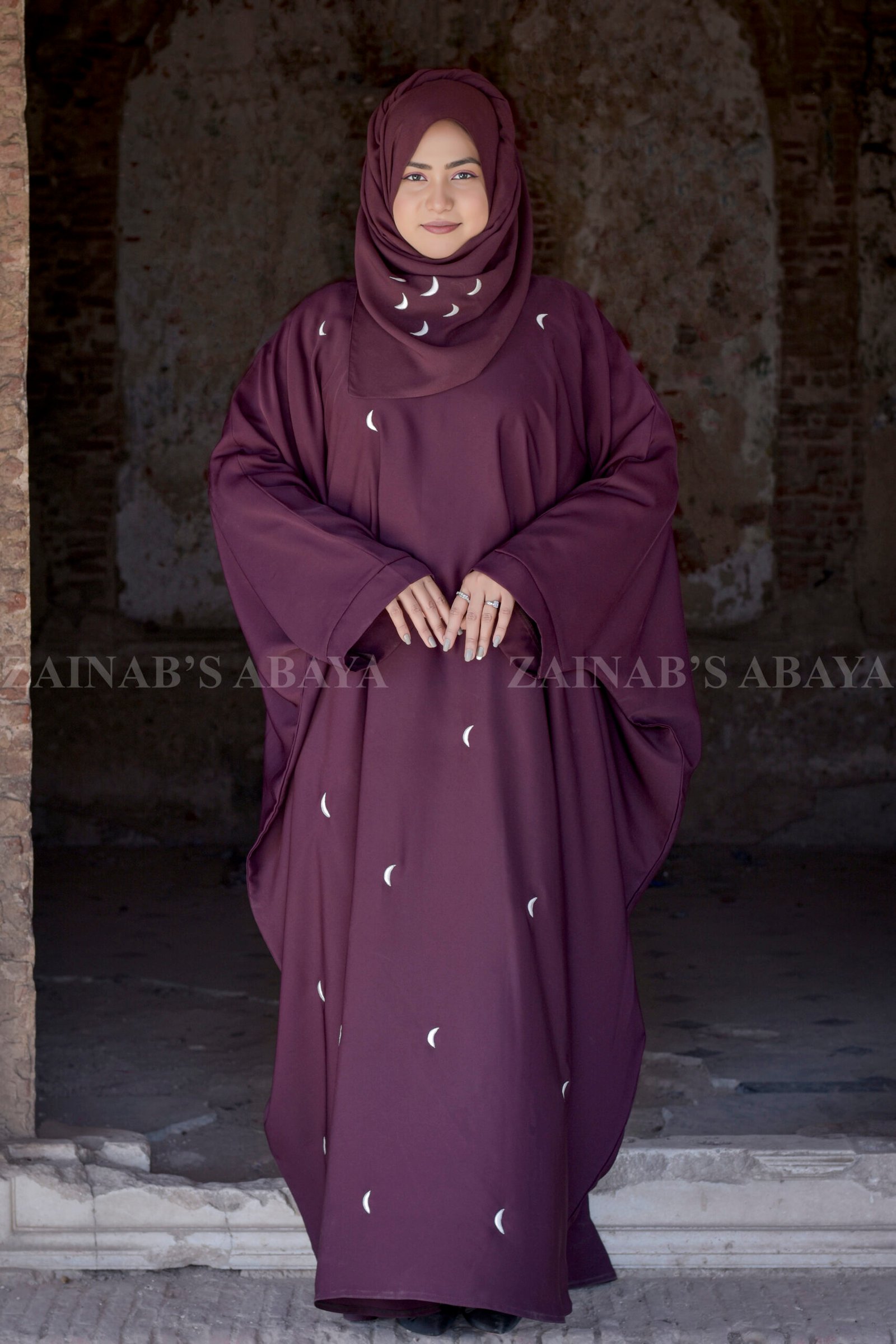 This maroon-colored kaftan abaya is crafted from premium Nida Korean fabric, offering a luxurious and elegant look. The abaya features intricate white embroidery in a moon style, adding a refined and sophisticated touch. Perfect for any occasion, this abaya combines timeless style with modern elegance.