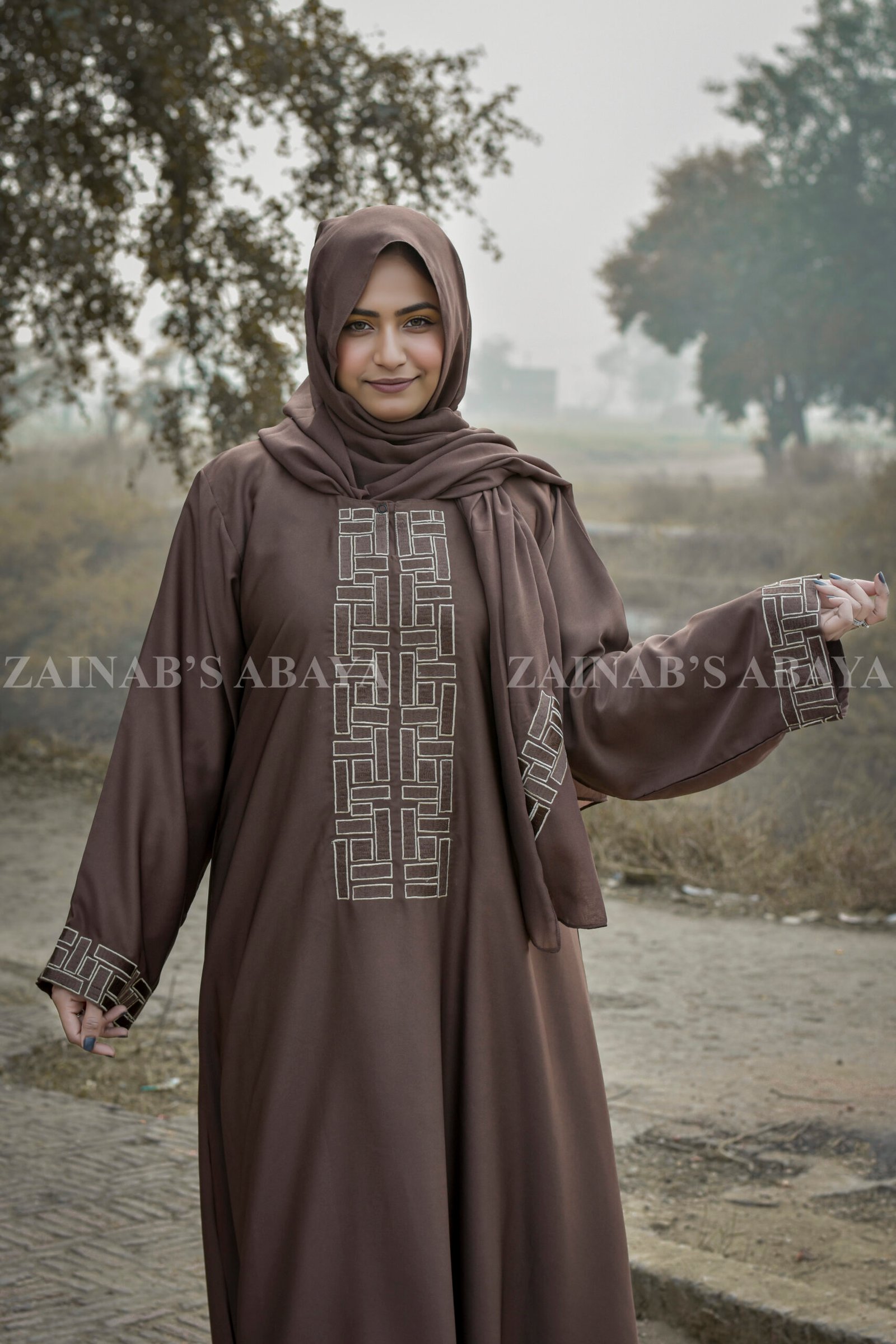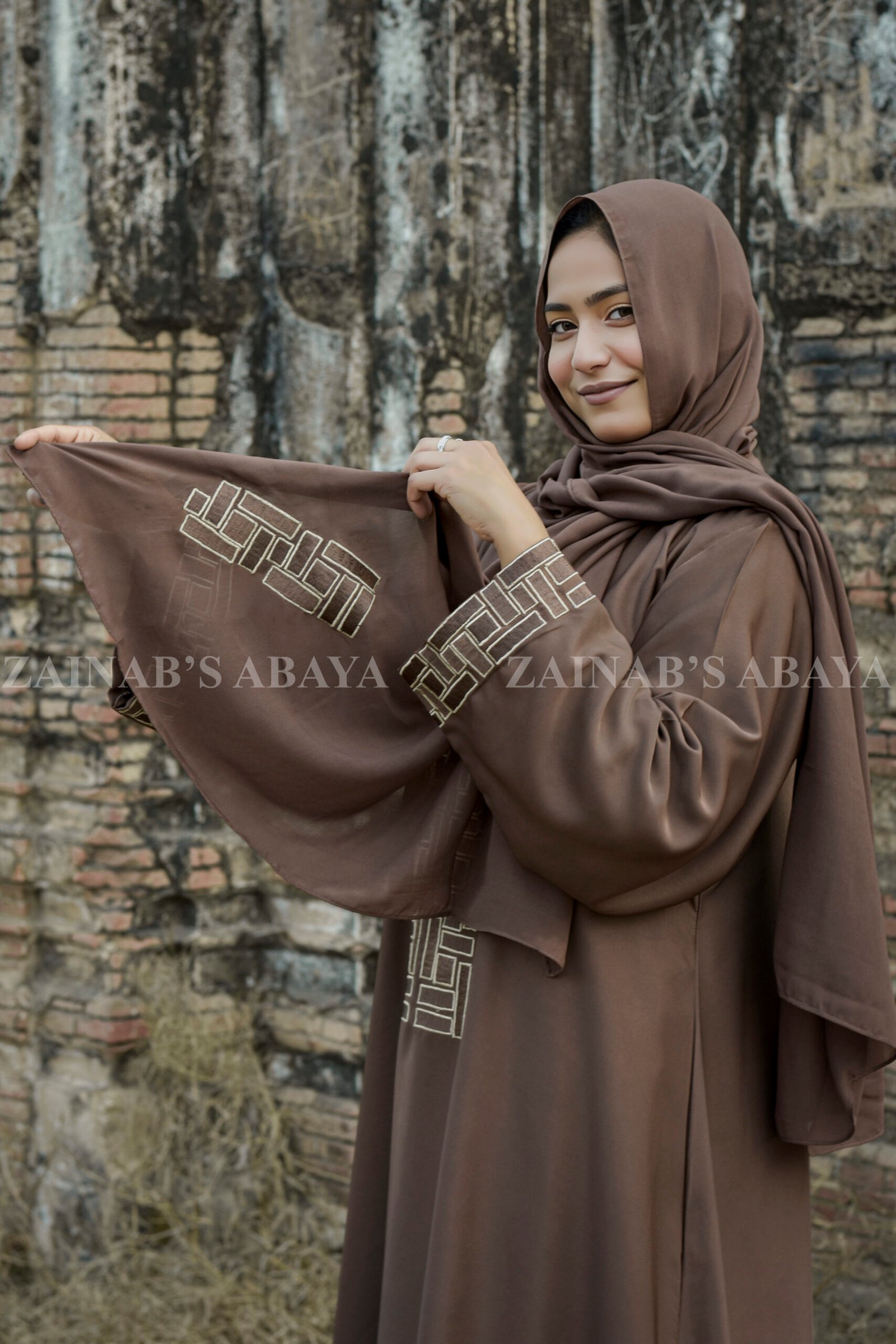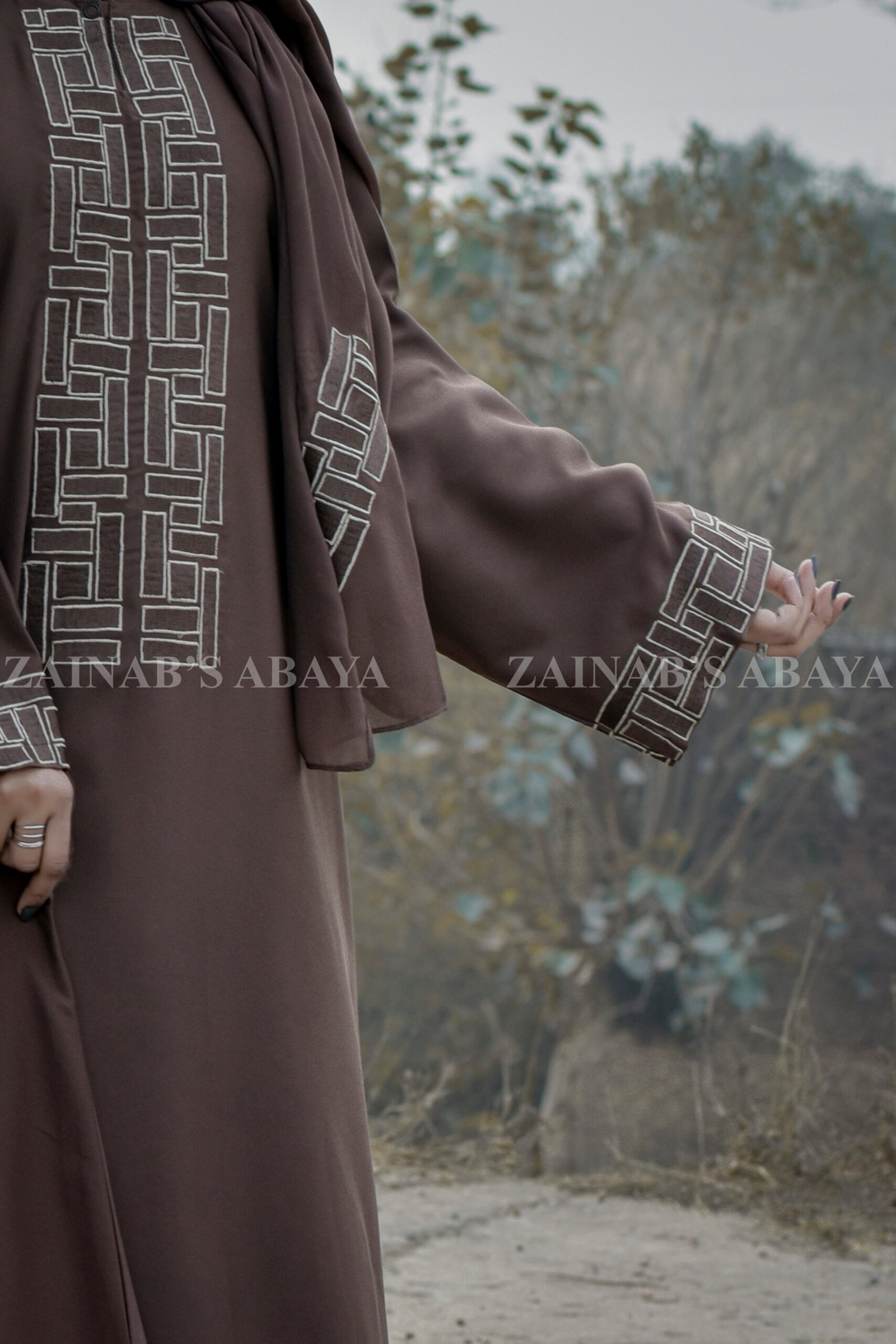 This brown maxi abaya features elegant embroidery on the front and sleeves, with a white outline that adds a striking contrast. The matching scarf includes delicate motifs, completing the ensemble with timeless sophistication.