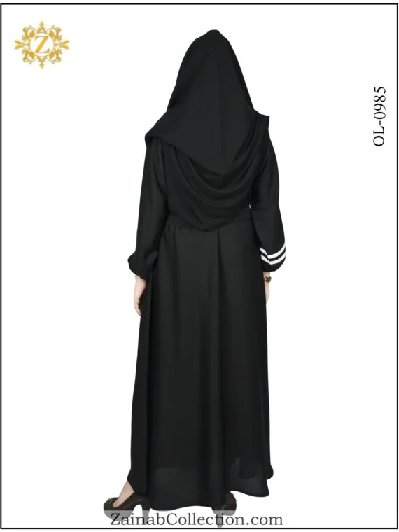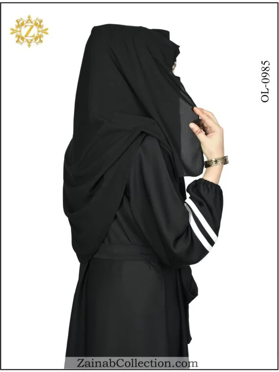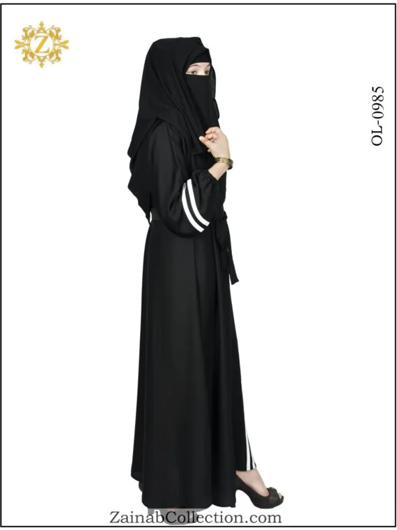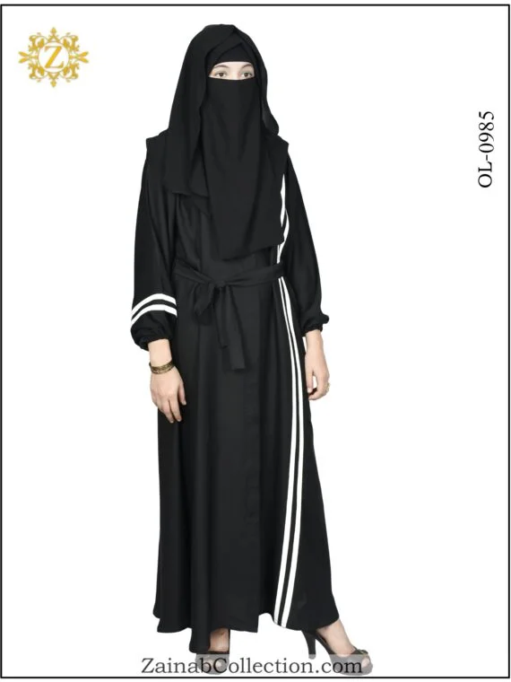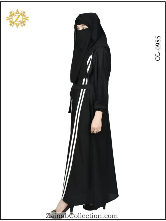 This black maxi abaya is crafted from premium Nida Korean fabric, offering a sleek and elegant design. The front and sleeves feature stylish white strips on one side, adding a modern and sophisticated touch. Perfect for any occasion, this abaya combines contemporary style with timeless elegance.