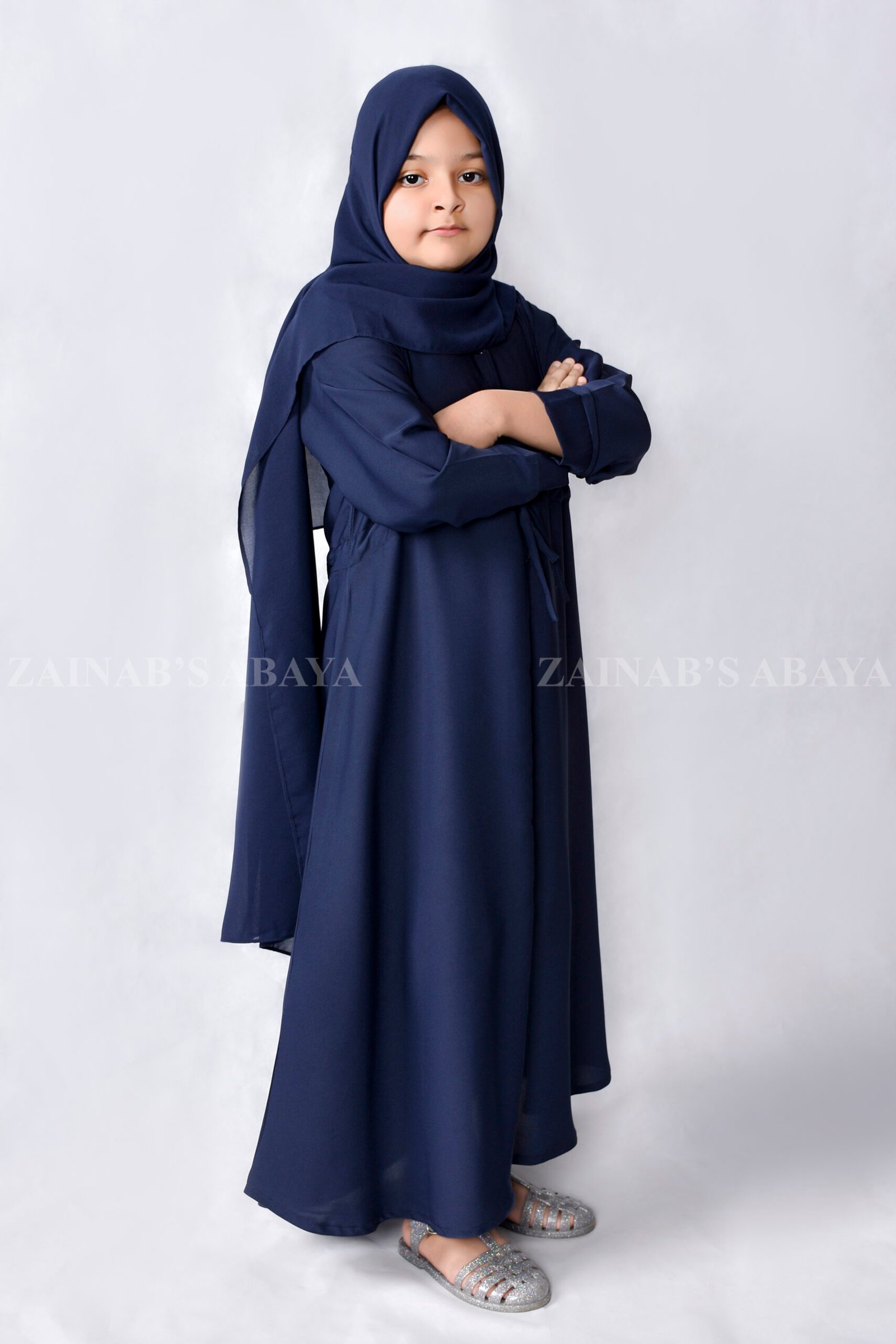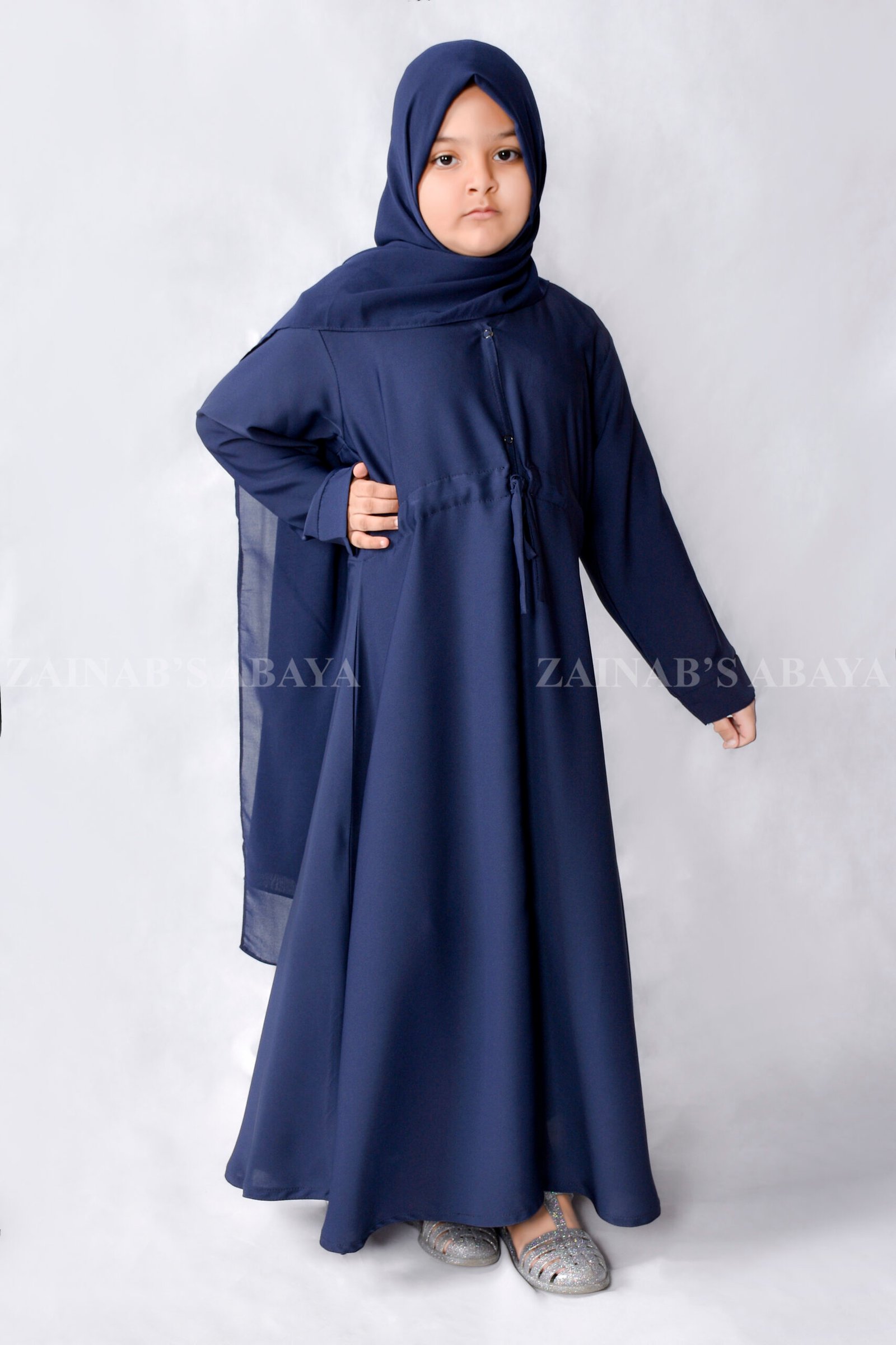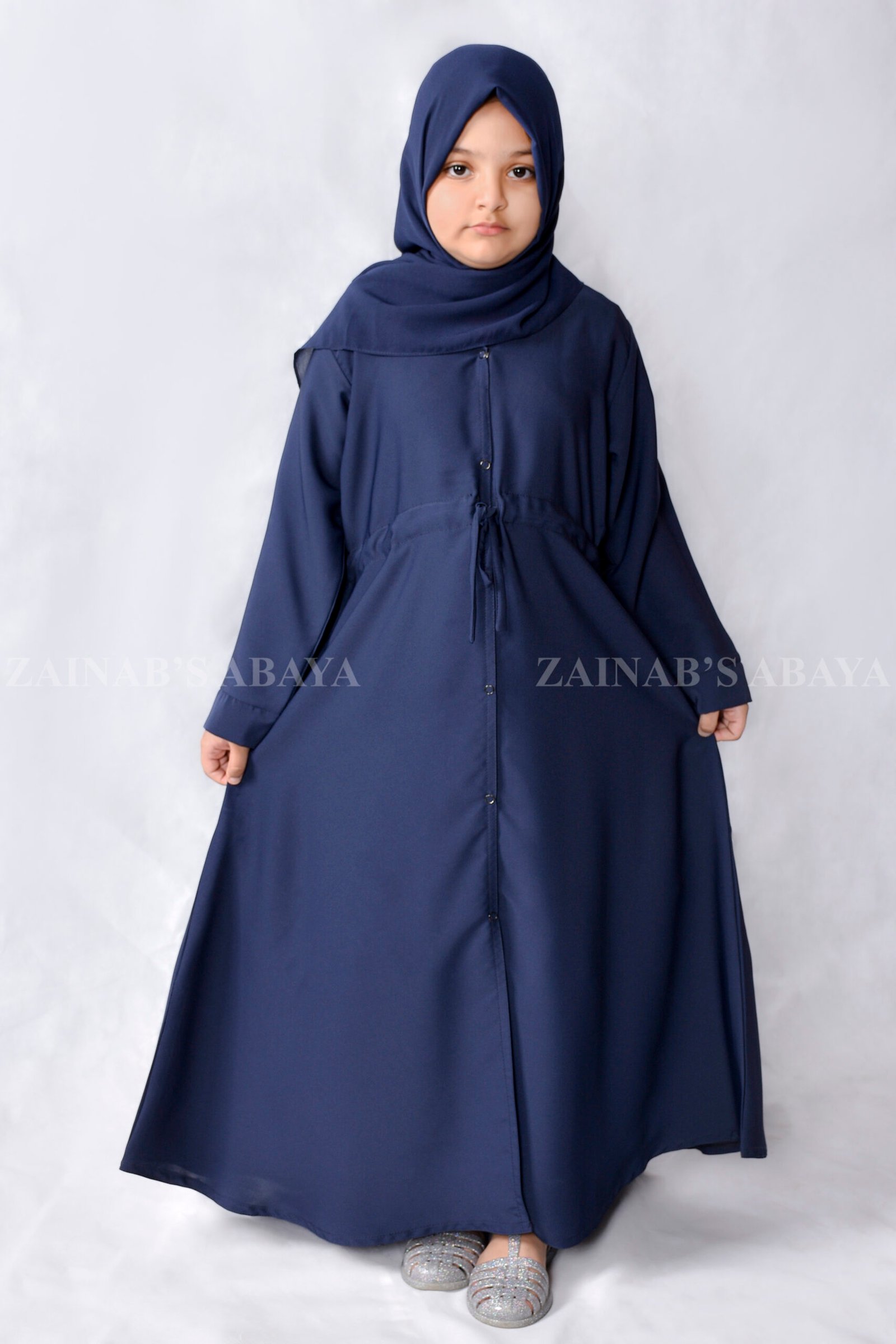 This Navy Blue Kids Front Open Abaya is made up of Imported Nida Korean Fabric. It is open from the front and perfect for children. Includes a matching navy blue chiffon fabric.Â