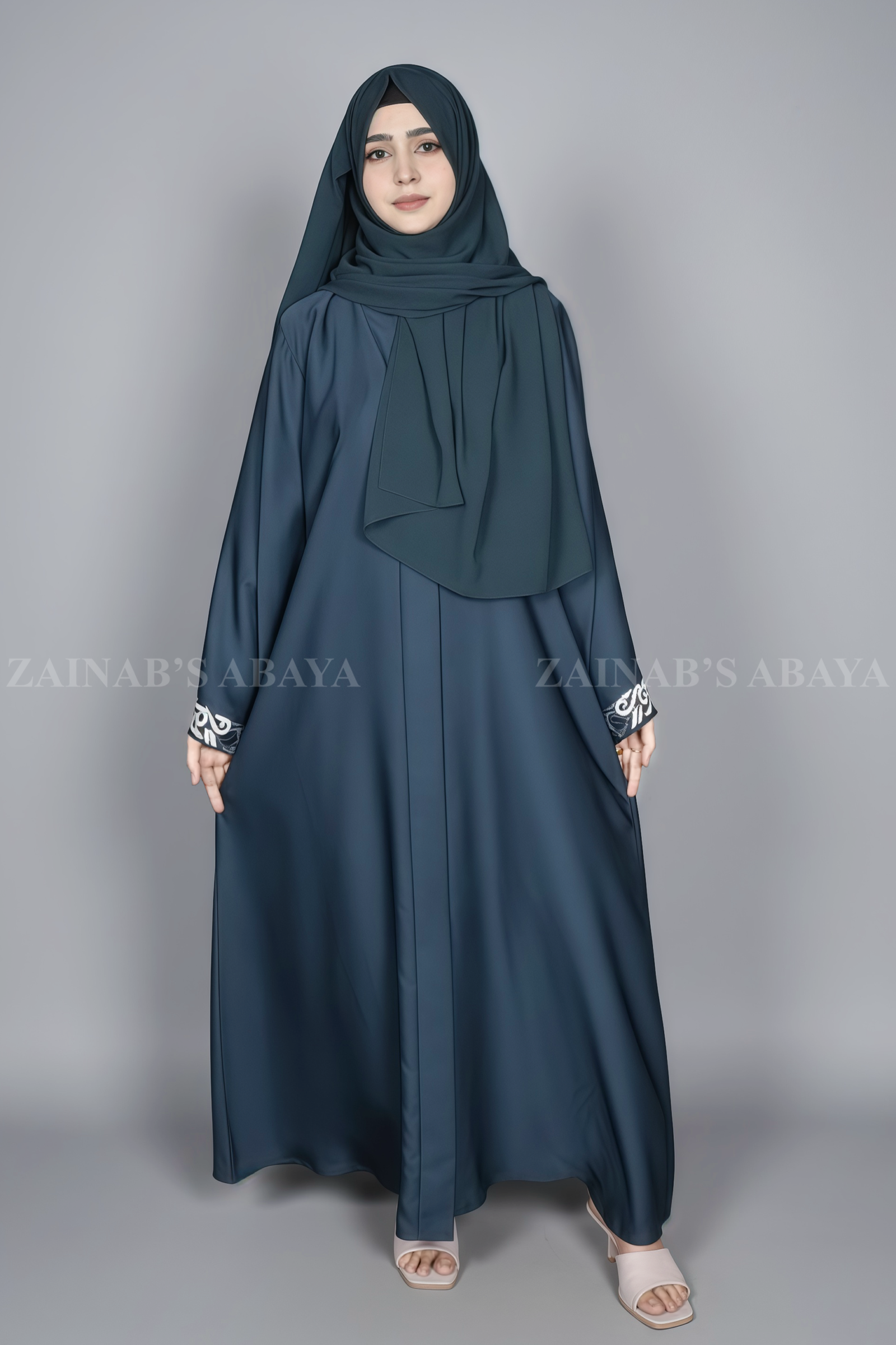 This Navy Color Front Open Abaya for women which crafted with Premium Nida Korean Fabric at a low price. This navy abaya opens at the front. It features pretty stitch designs on the sleeve cuffs. Includes a matching navy chiffon scarf.