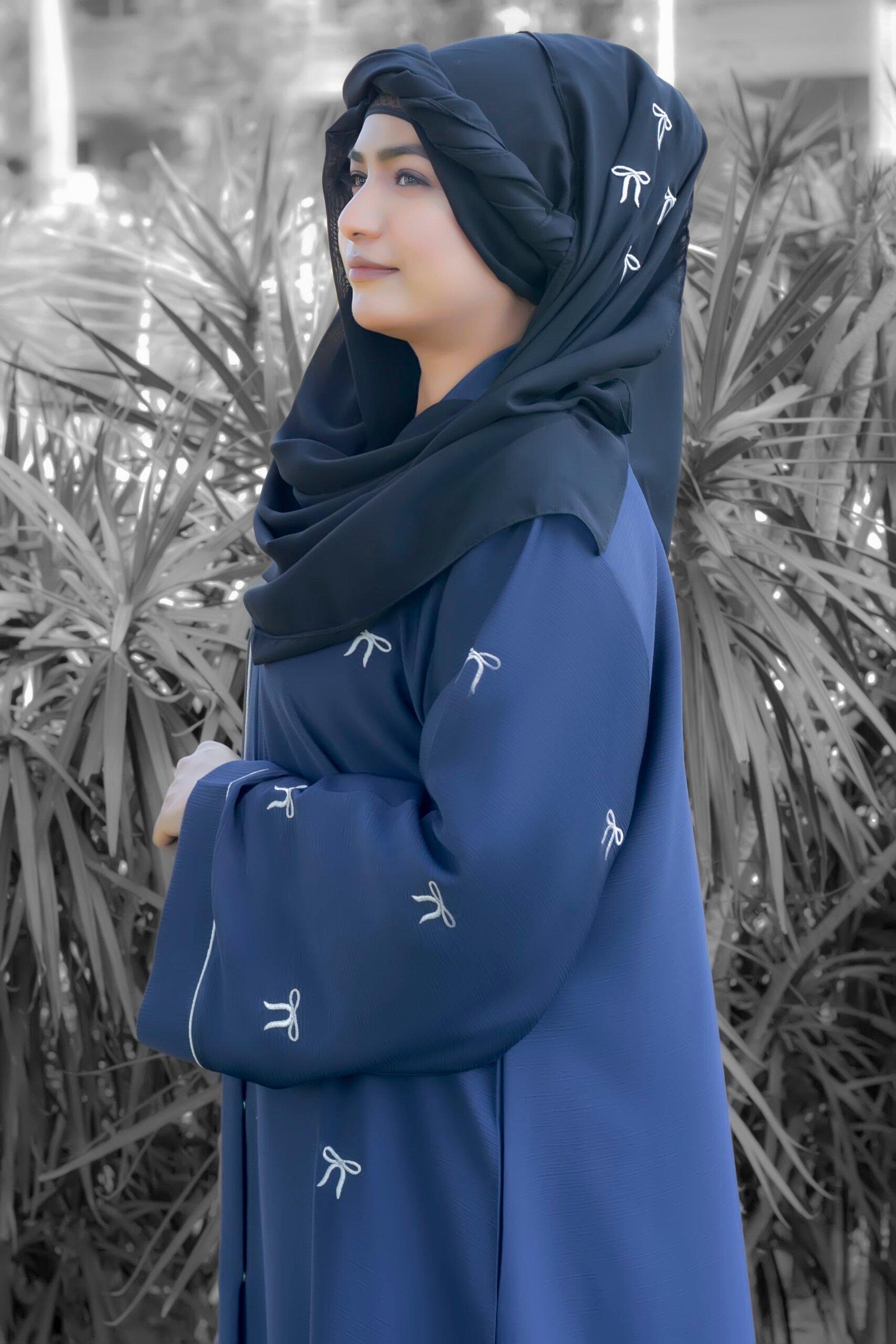 This Navy Front Open Abaya is crafted with Premium Nida Korean Fabric. It has pretty bow style embroidery and piping on front and sleeves. Including a matching scarf in chiffon with same embroidery pattern motives.