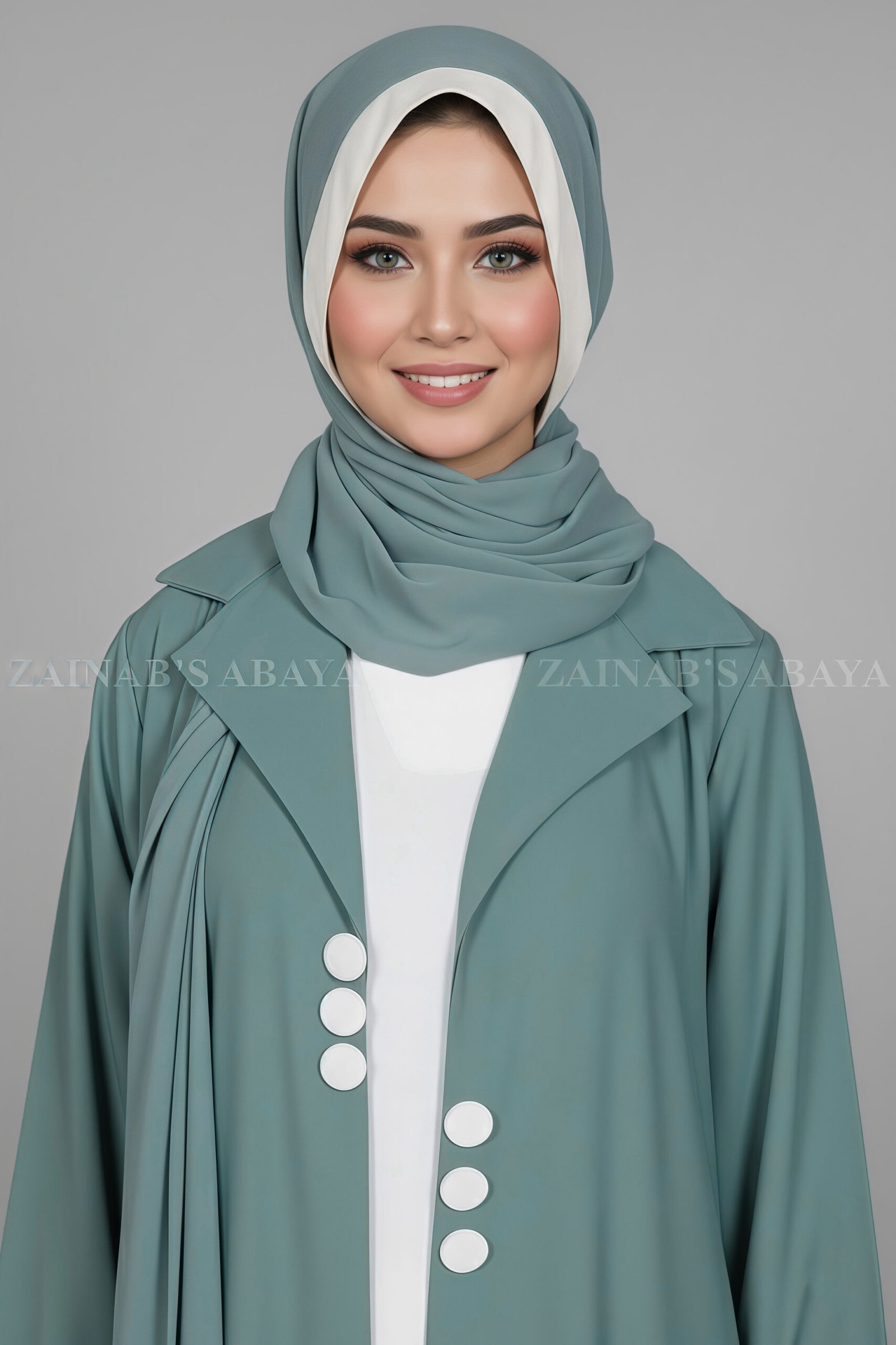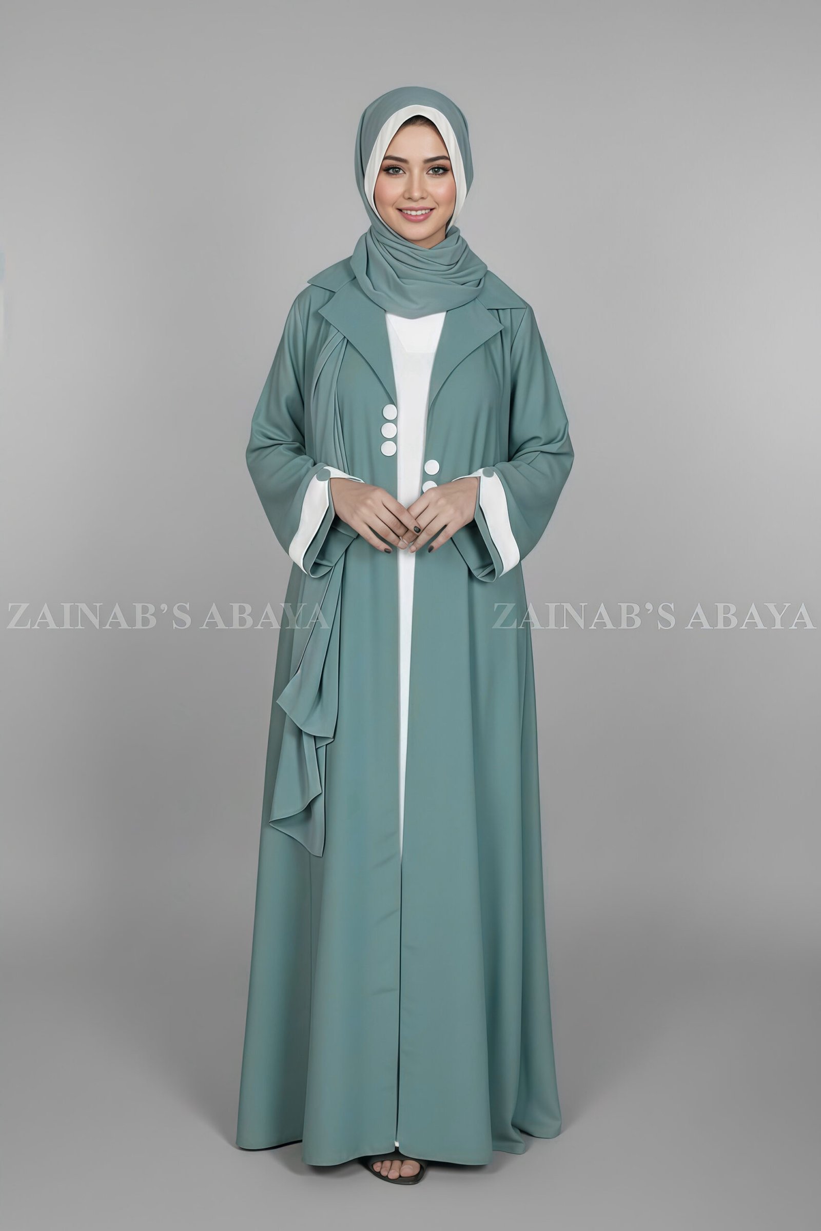 This Stylish Coat Style Abaya is crafted with Premium Nida Korean Fabric. This abaya has a smart coat style with a full inner layer. It features buttons on the front and comes with a matching chiffon scarf.