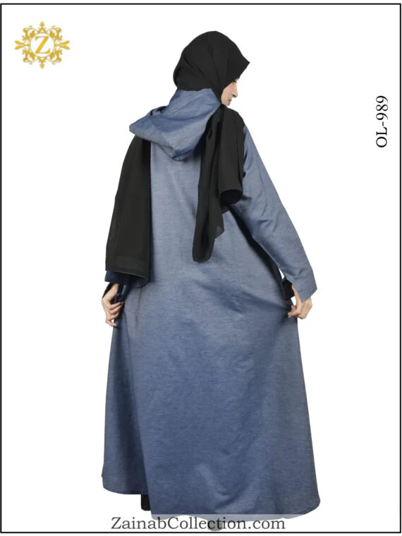 This denim huddy abaya features a trendy front-open design, offering a modern and casual look. Crafted from durable denim fabric, it combines style with comfort, making it perfect for everyday wear.