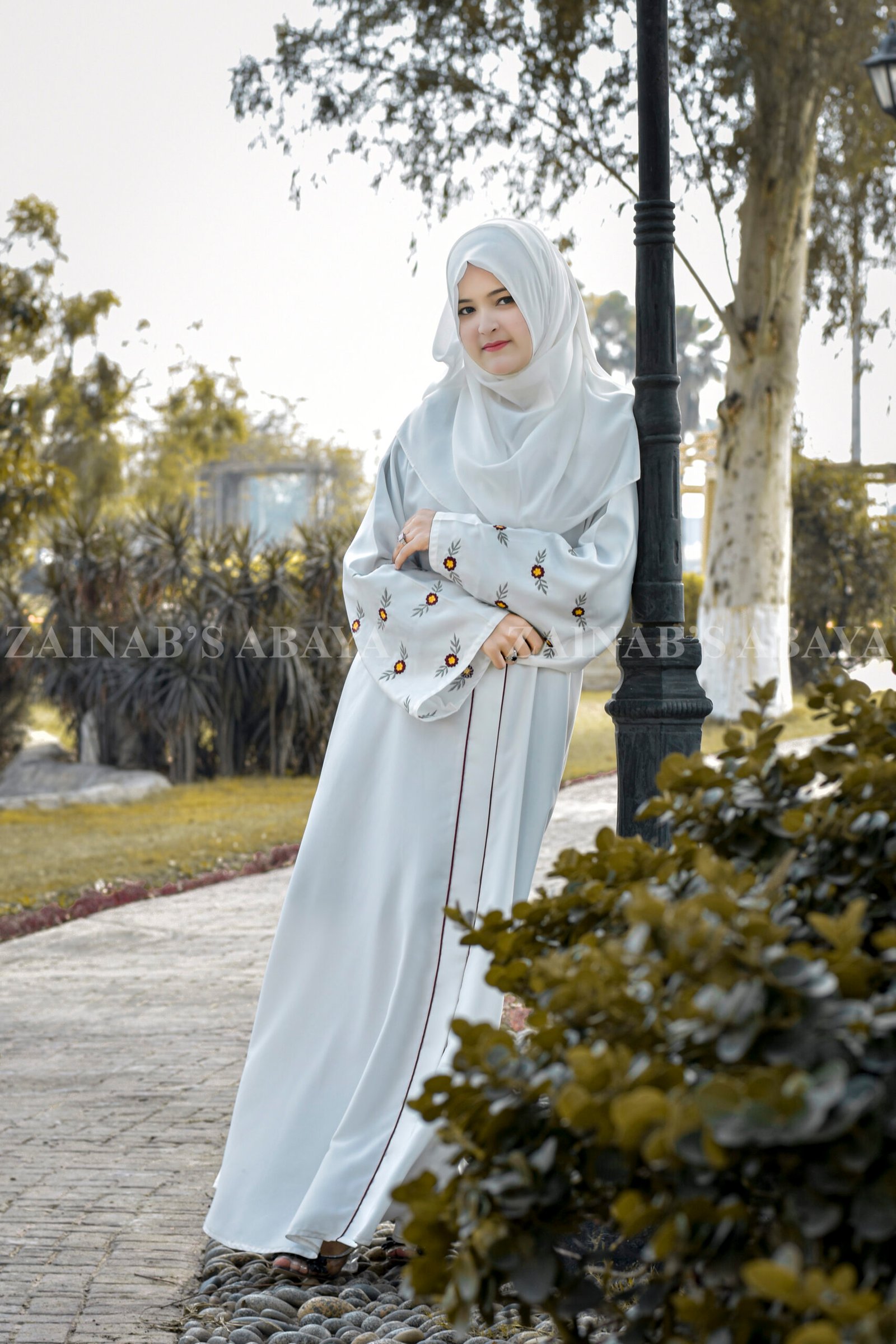 This beautiful white front open abaya is made from high-quality Nida Korean fabric, giving it a refined and elegant feel. The front-open style is highlighted with sophisticated piping, while the sleeves showcase intricate multi-colored floral embroidery that brings a lively yet classy touch. The set is completed with a matching scarf adorned with subtle motifs, adding a final layer of timeless charm to the overall look.