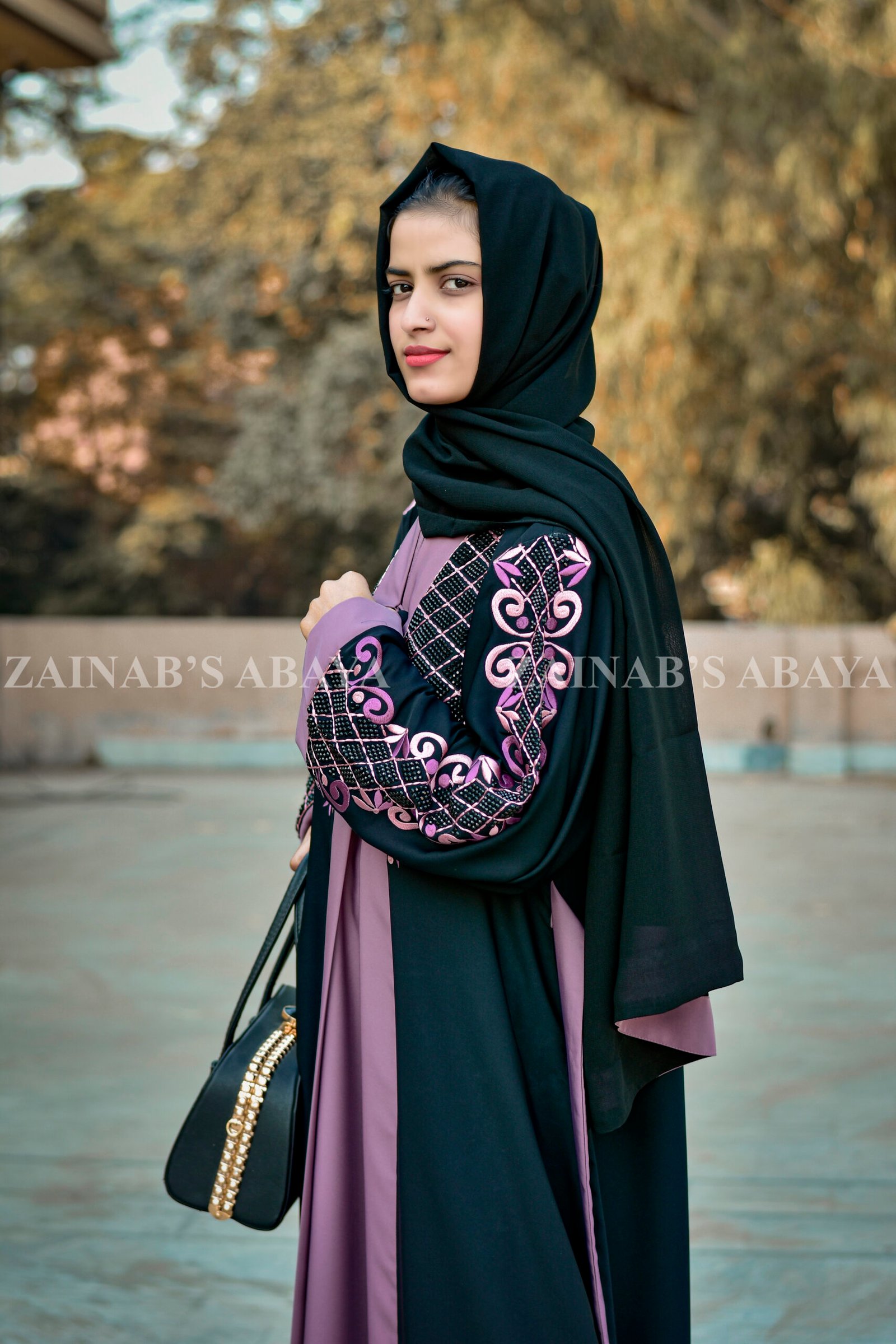 This stunning maxi abaya features a dual-tone design with a black outer and a soft T.Pink inner, crafted from premium Nida fabric. The front and sleeves are adorned with intricate T.Pink and creamy-toned embroidery, complemented by black stonework, adding a luxurious and elegant touch.