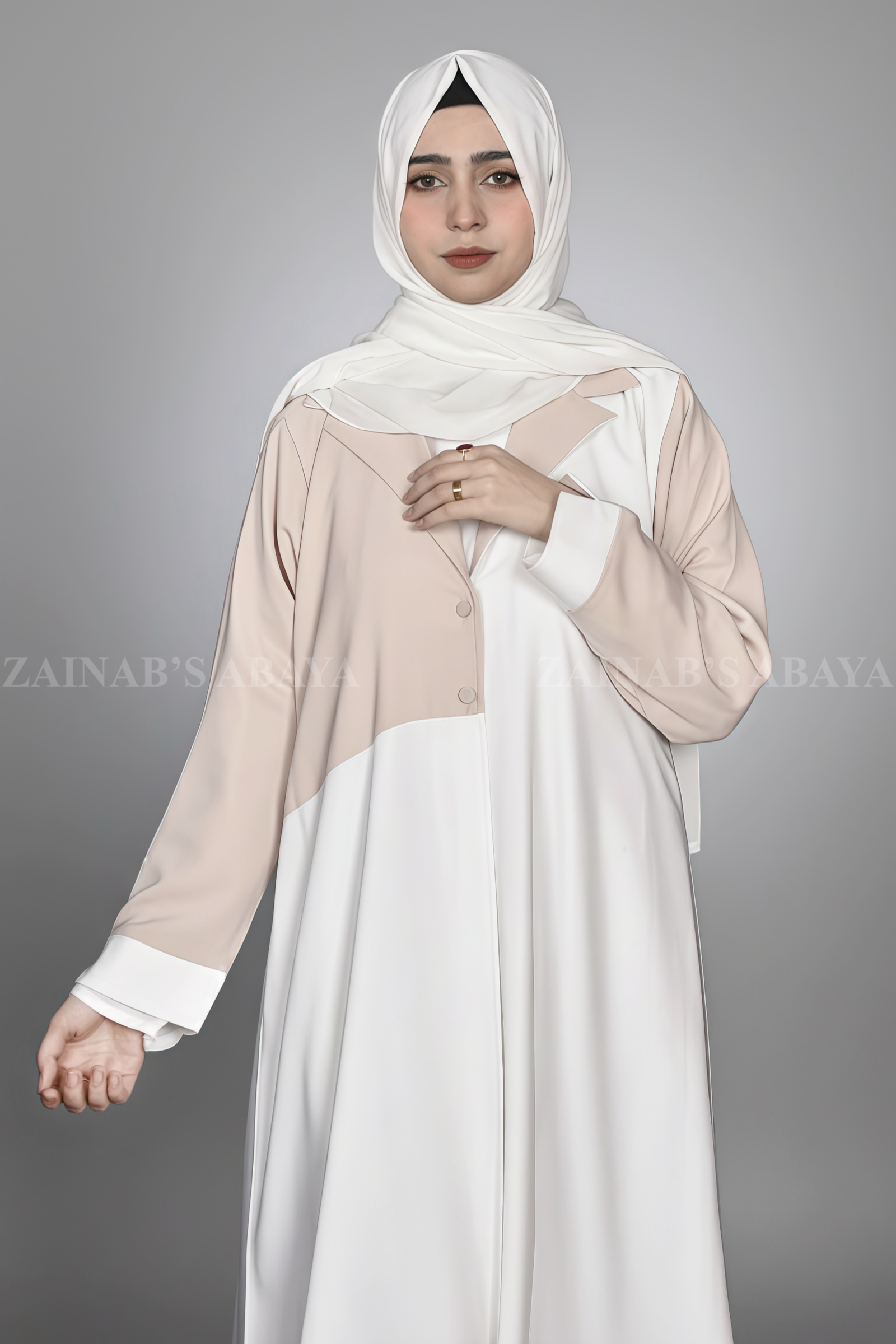 This Coat Style Abaya in Two Colors Combination is crafted with Premium Nida Korean Fabric. This abaya has a smart coat style in a white and peach color combination with stylish sleeves. Includes a matching chiffon scarf. Inner in not included.