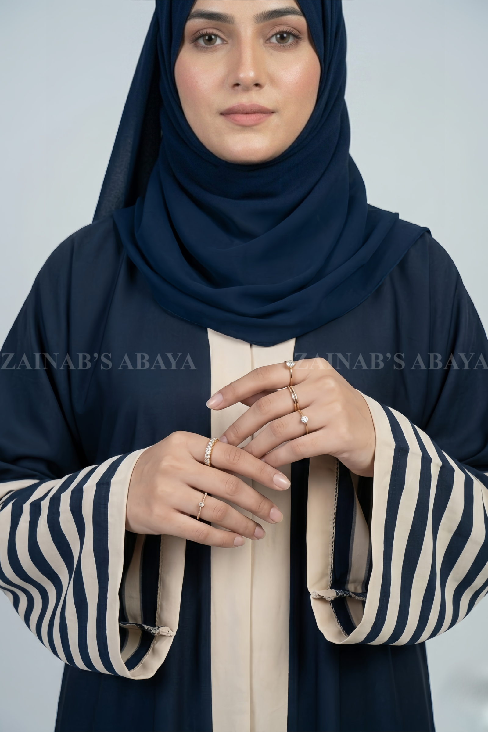 Our Nida Front Open Gown Abaya is a stunning piece that combines the comfort of Nida fabric with the modern touch of eight stylish strips on the sleeves. This unique design adds a playful and eye-catching element to the classic gown silhouette. Perfect for those who love to make a bold fashion statement.