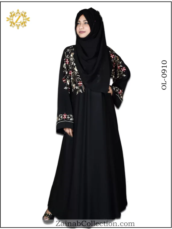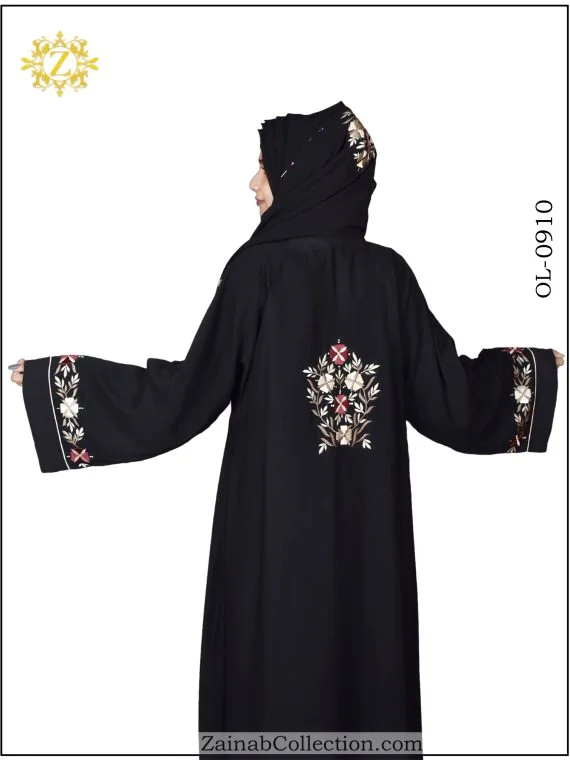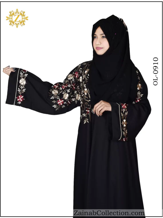 Stylish color maxi abaya with embroidery on both sides of sleeves. The Nida Color Maxi Abaya with Embroidery on Both Sides of Sleeves from the Zainab Designer Abaya Collection is an impeccable choice for the woman who appreciates a blend of traditional charm and modern sophistication.