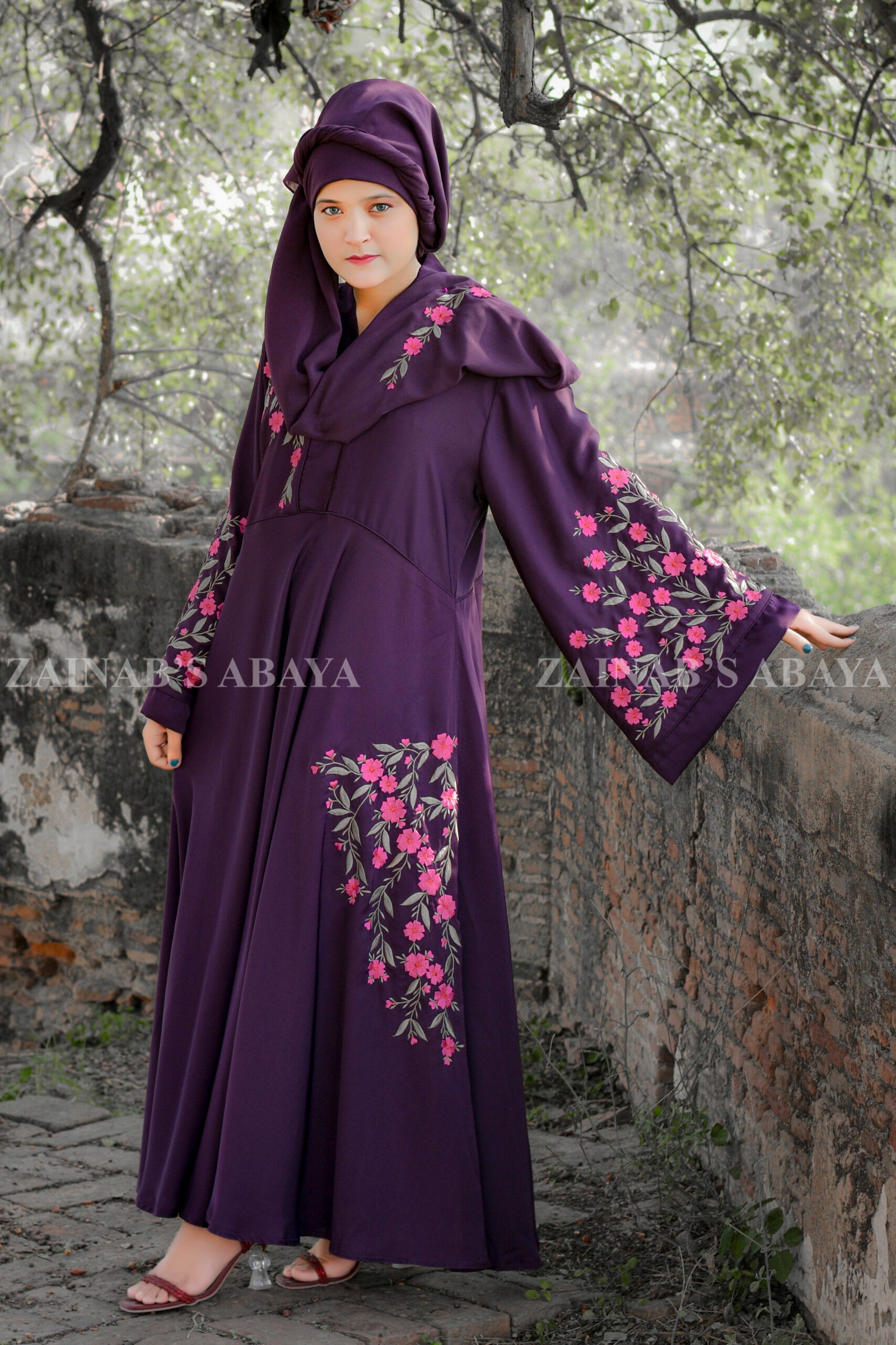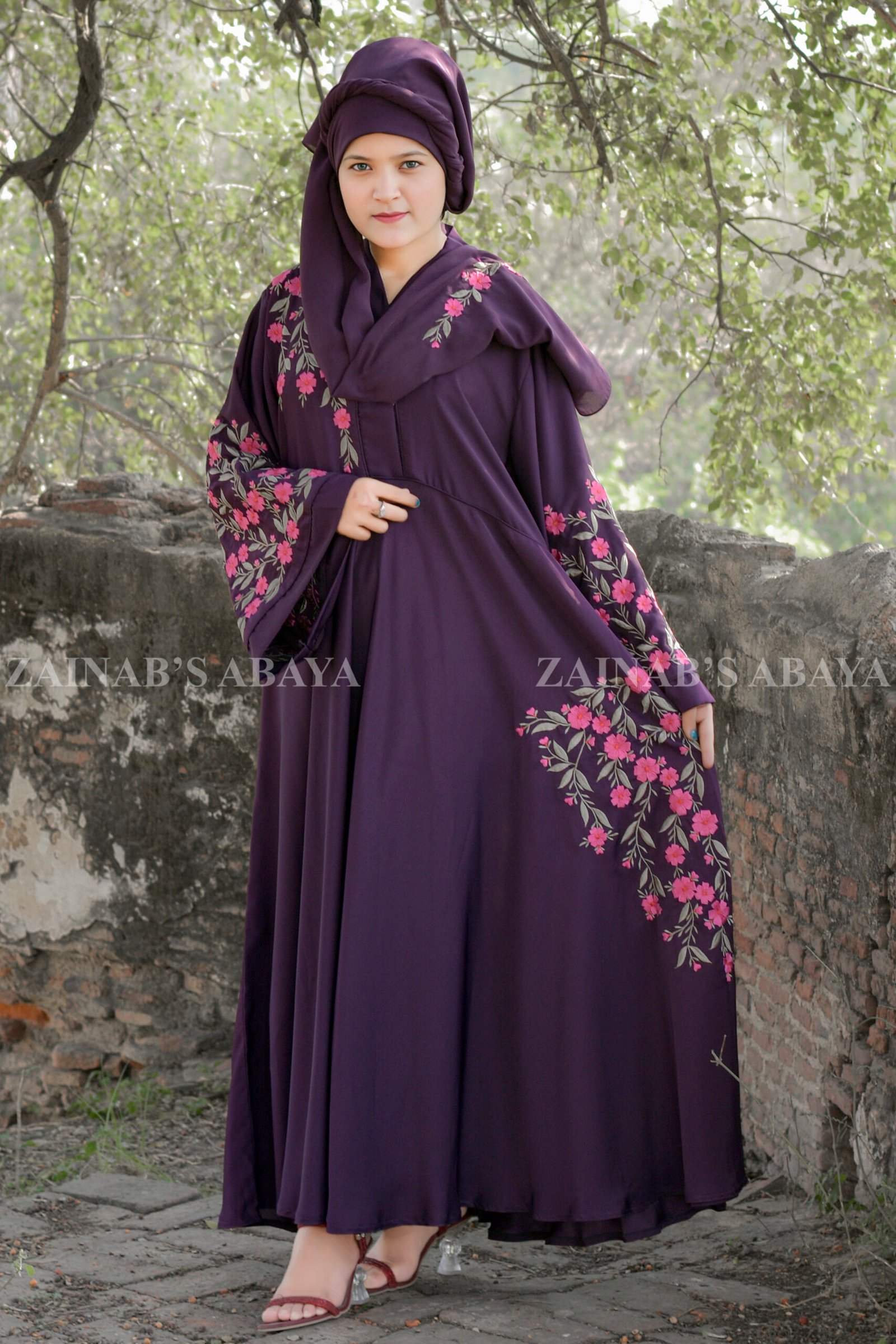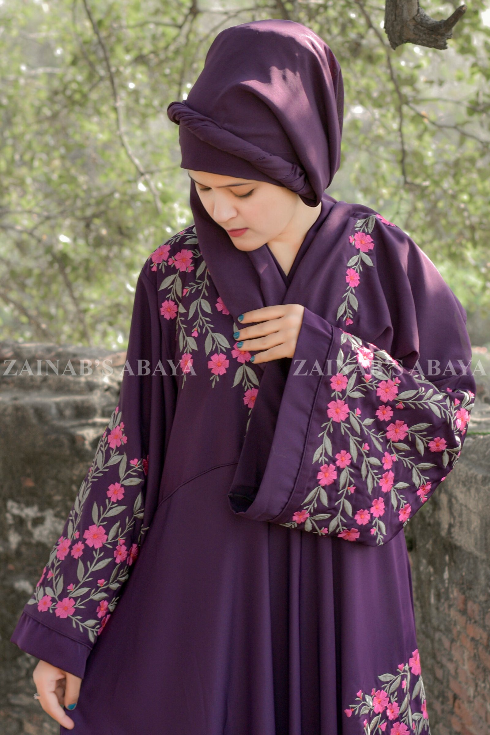 Umbrella Abaya with Embroidery is made from soft Nida Korean fabric. This flowy umbrella-style abaya features pretty embroidery designs on the front, mid-section, and one side. Includes a light chiffon scarf with the same pattern.