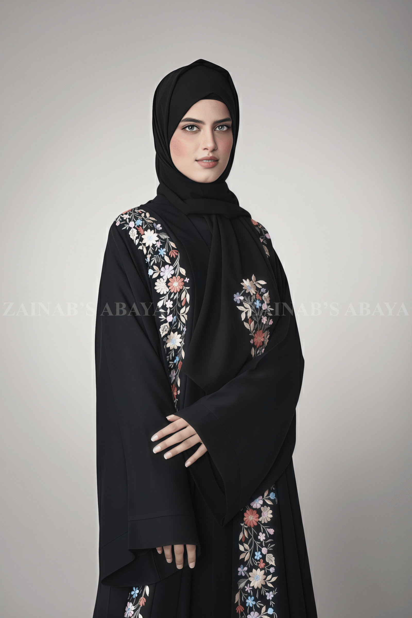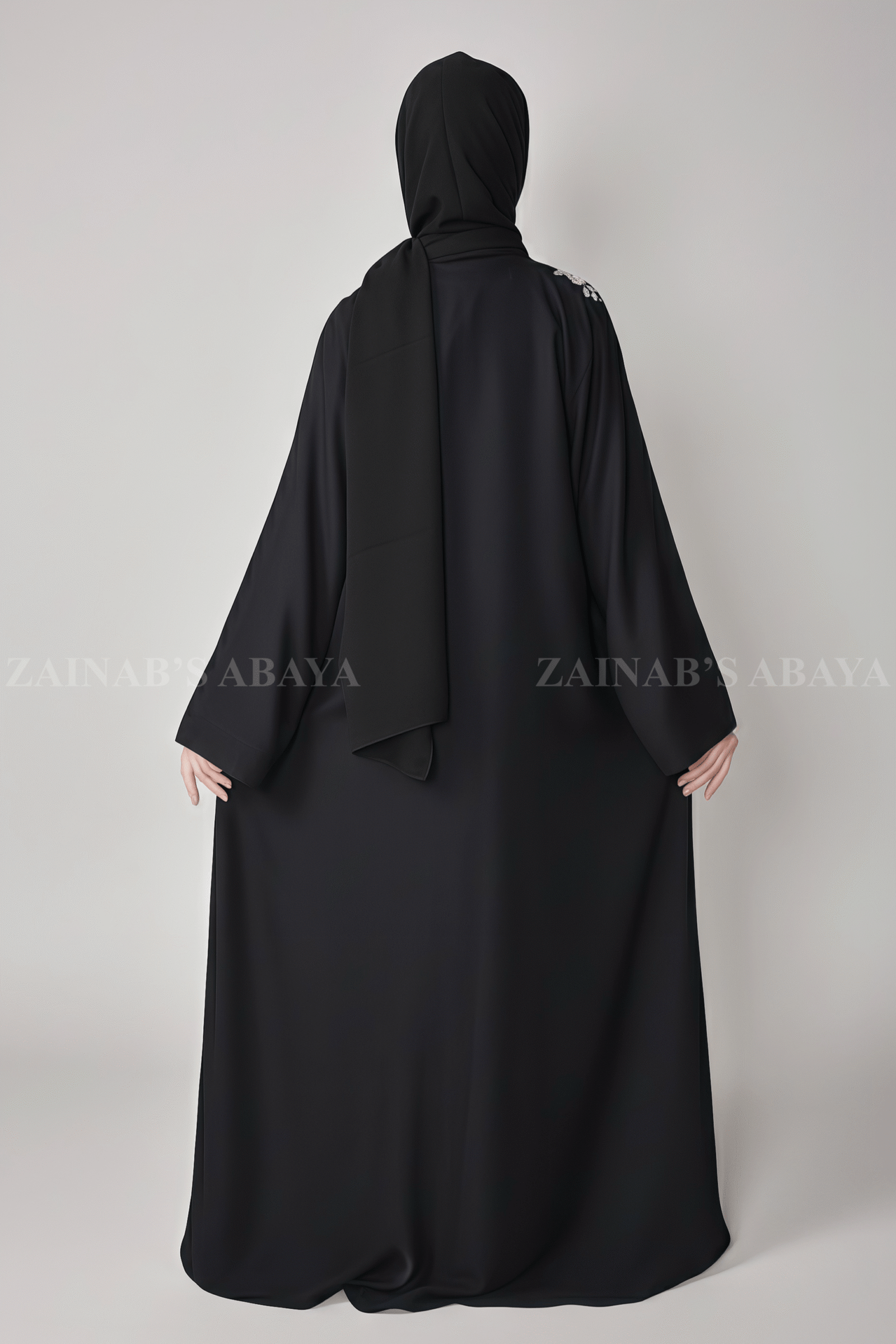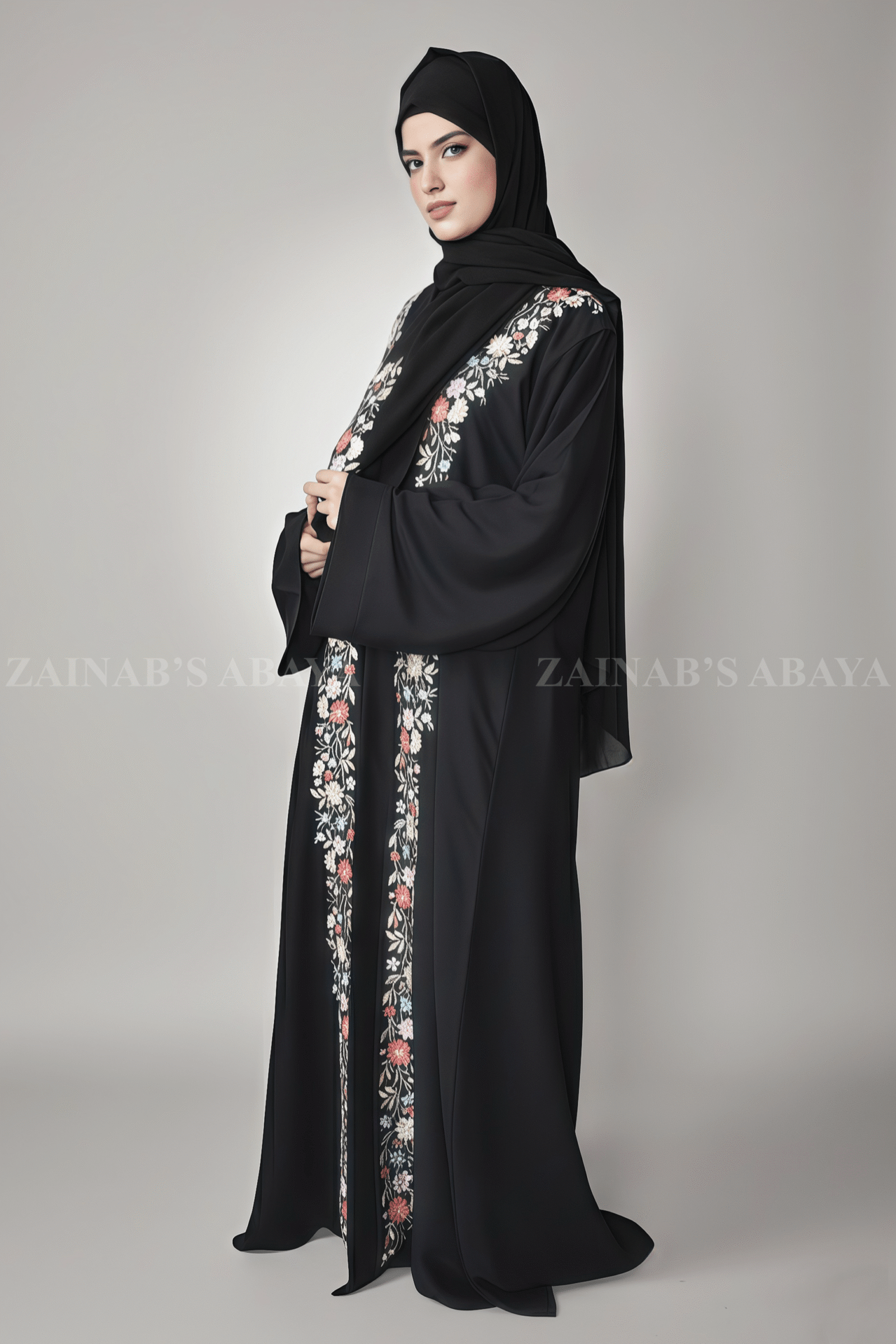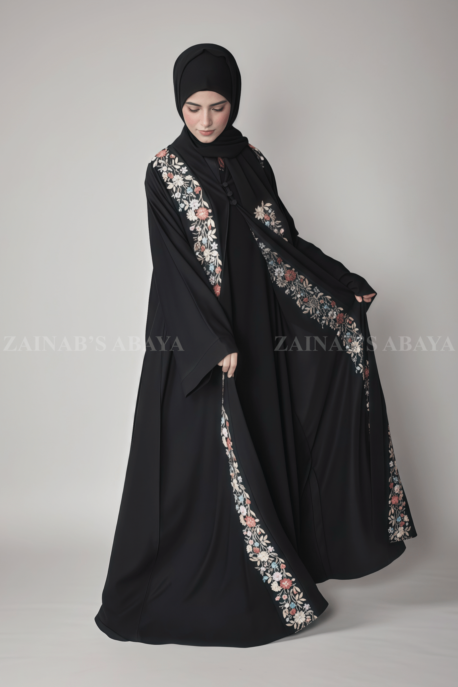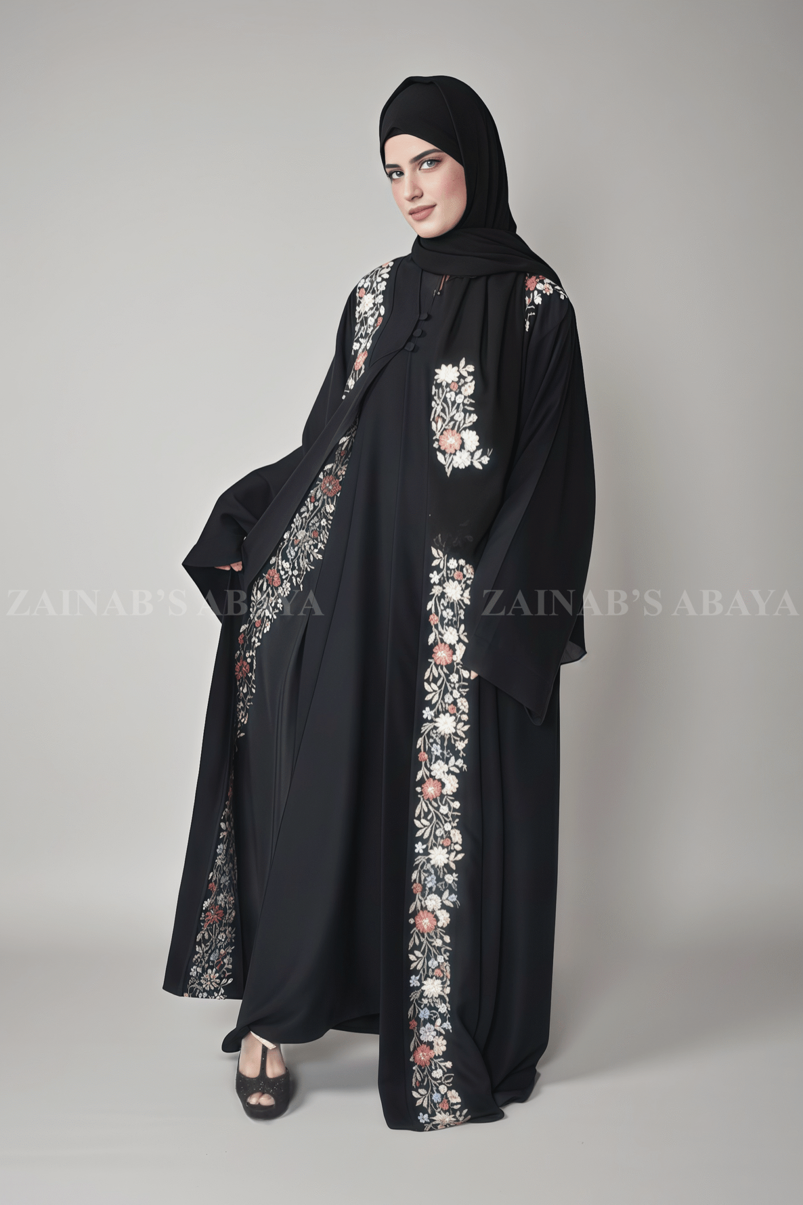 3 reviews for Nida Front Open Abaya with Inner Maxi Embroidery on Front OL-1106
