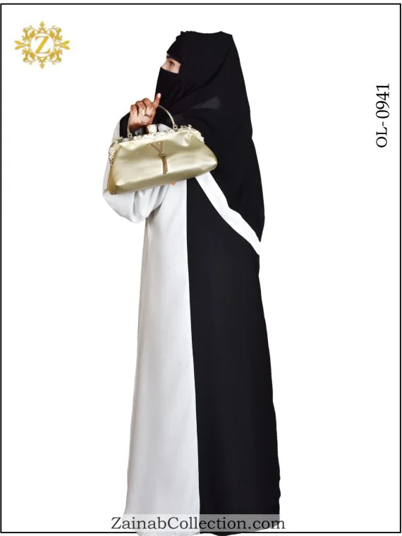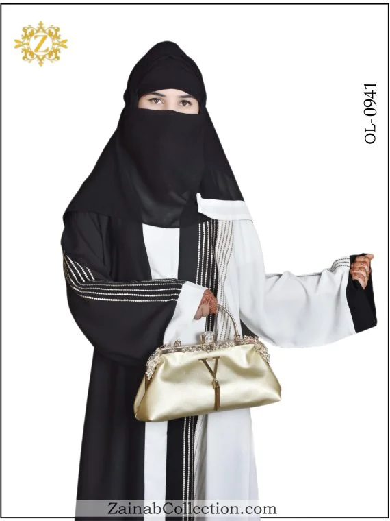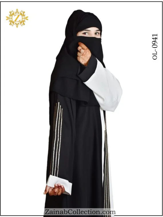 Elegant front open gown abaya with dotted embroidery on sleeves. The New Nida Front Open Gown Abaya with Dotted Embroidery on Sleeves from the Zainab Designer Abaya Collection is the perfect choice for the woman who seeks a blend of elegance and modern design.