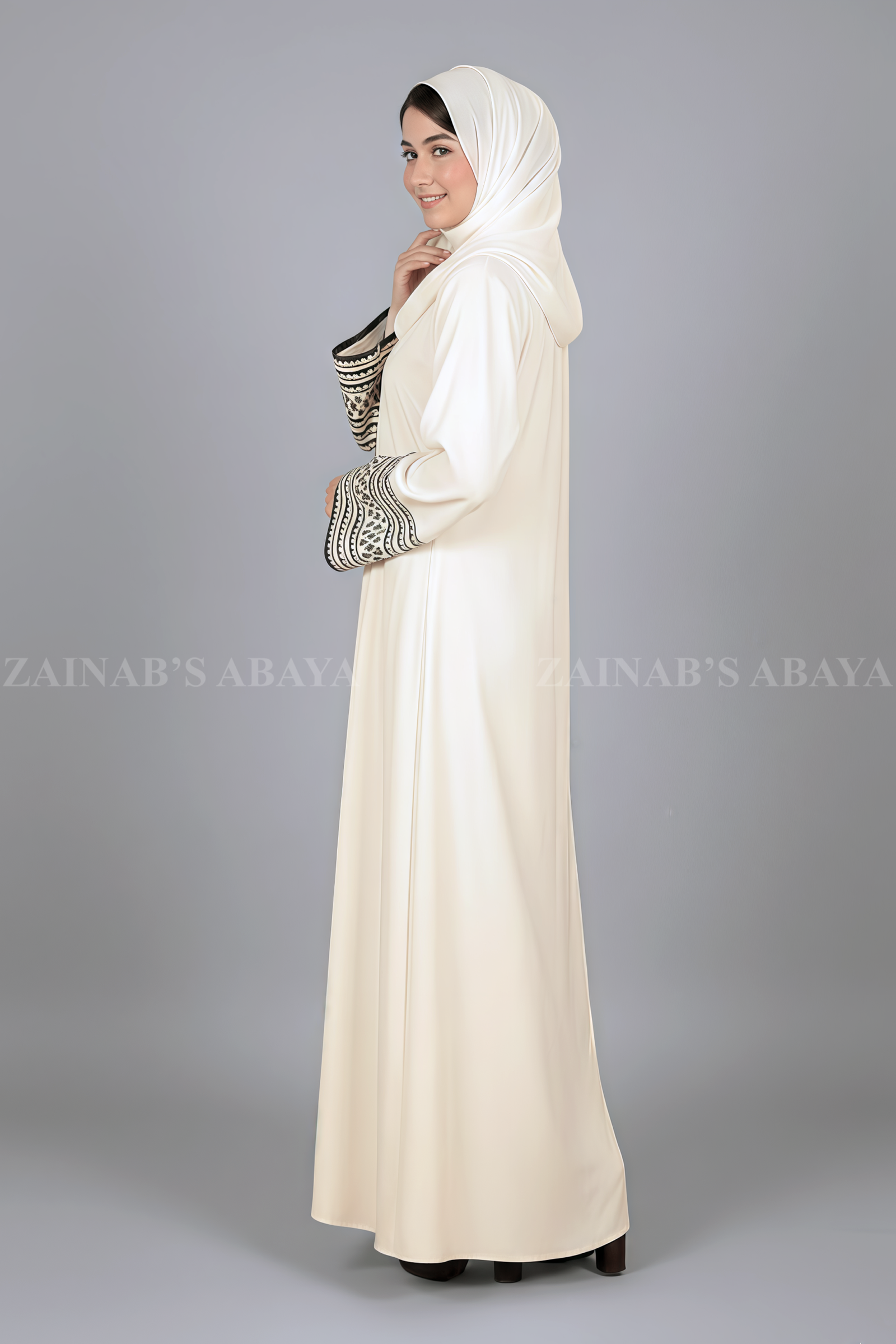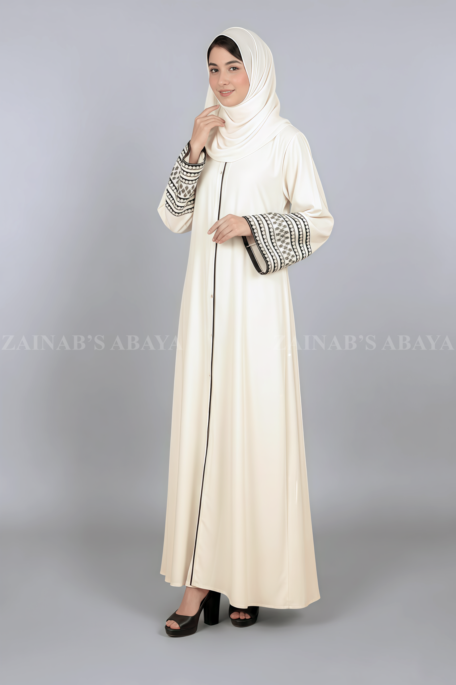 This stunning Off White Color Gown Abaya for women, which is crafted with Premium Nida Korean Fabric features the stylish embroidery stitch designs on sleeves.  Complete your graceful look with the perfectly matching chiffon scarf.