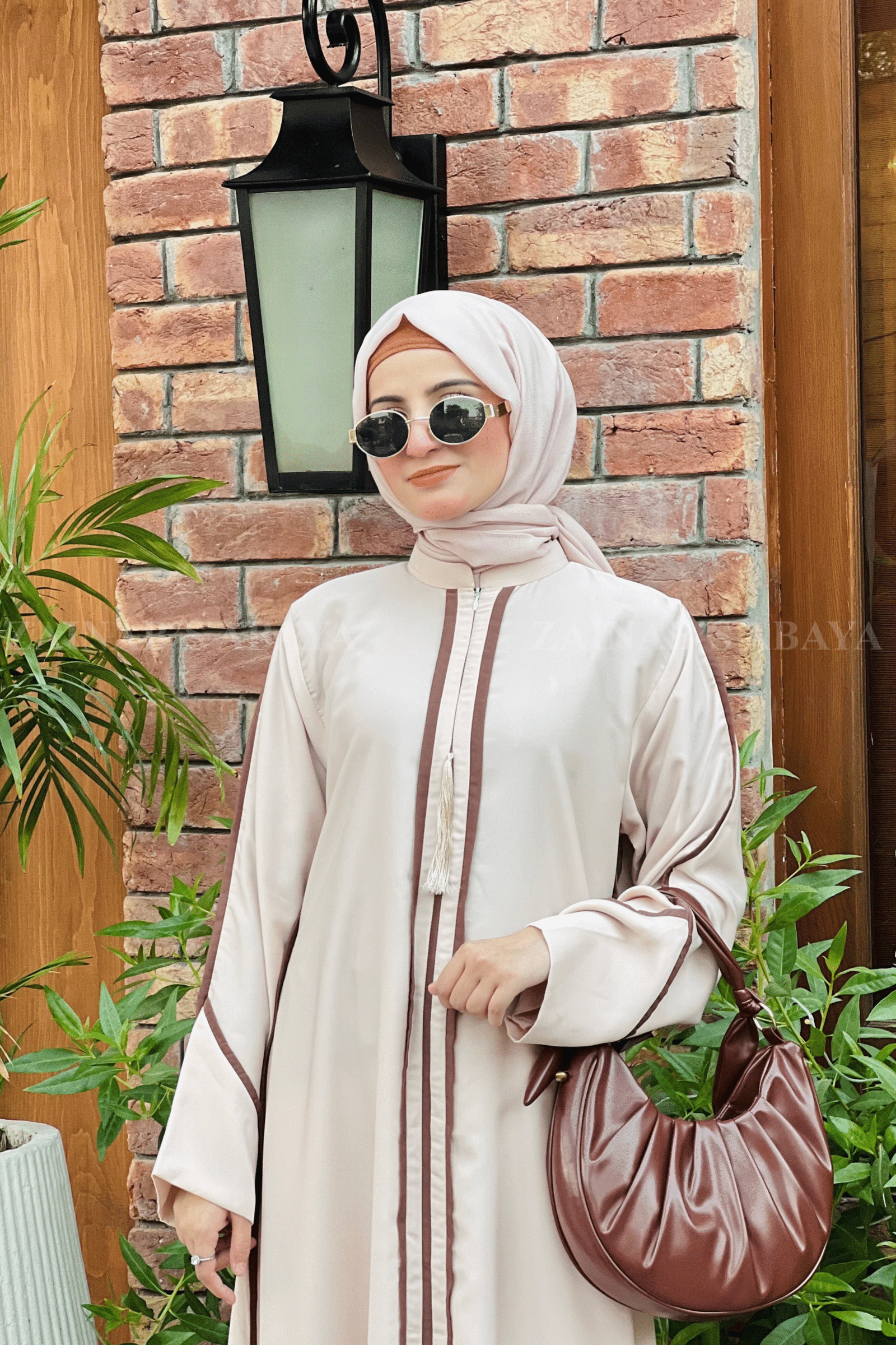 This peach-colored maxi abaya is crafted from premium Nida Korean fabric, featuring a stylish ban and strips design on the front and sleeves. The sleeves are further embellished with delicate pearl detailing, adding a touch of elegance. The brown strips create a beautiful contrast, making this abaya a perfect blend of sophistication and modern style.
