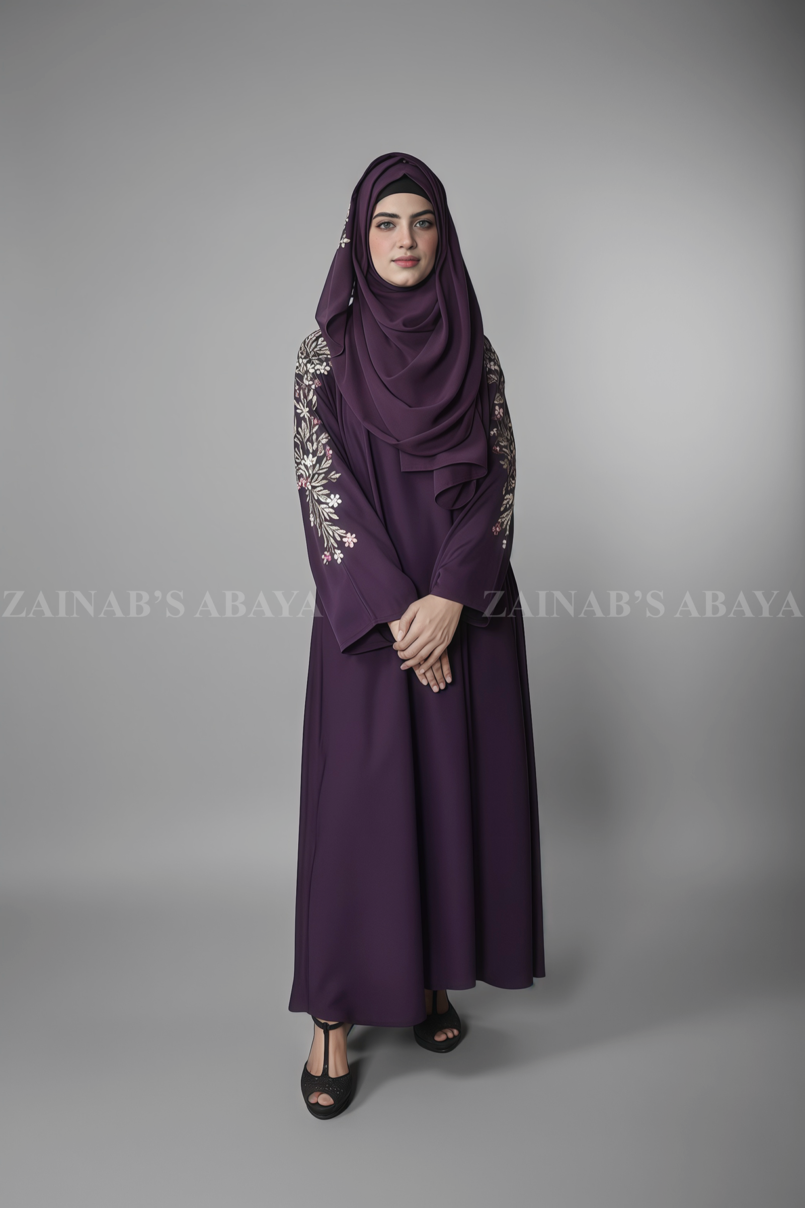 This Embroidered Maxi Abaya for Women is made up of Premium Nida Korean Fabric. This full-length abaya has pretty embroidery designs on the sleeves and back. Includes a matching chiffon scarf with the same pattern.