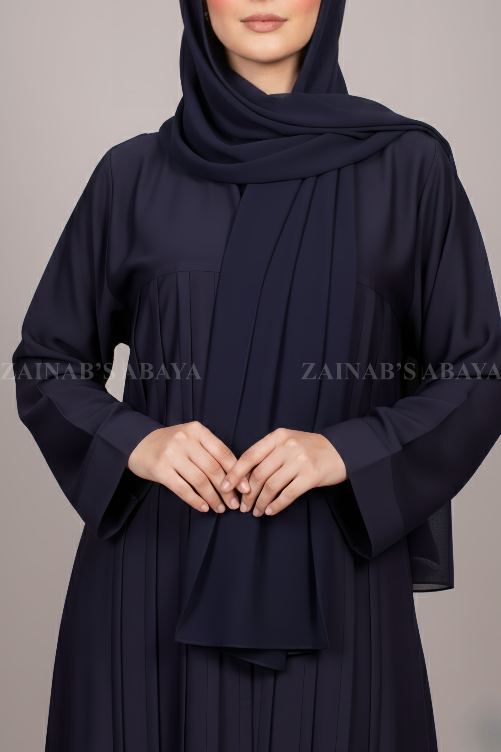 This elegant maxi abaya for women comes in rich navy and is crafted with Premium Nida Korean Fabric, known for its soft feel, smooth drape, and comfortable wear. The design features pleated style detailing on the front, adding structure and subtle elegance to the overall look. The band style neckline enhances the simplicity of the design while keeping it modern and refined. A matching scarf is included to complete the outfit, making it ready to wear for different occasions.