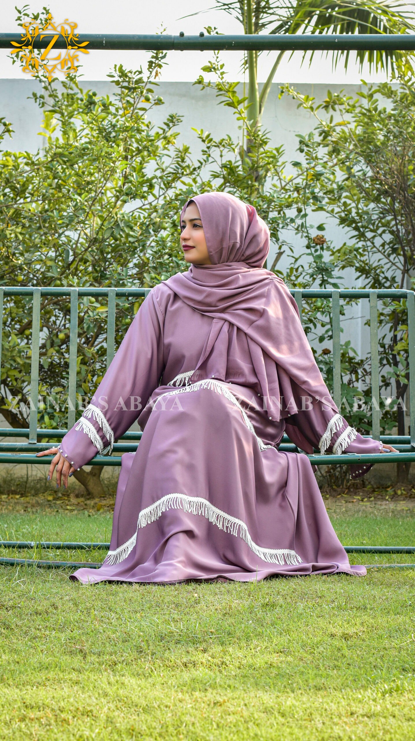 This kasani-colored maxi abaya is crafted from premium Nida Korean fabric, offering a luxurious and elegant look. The front and sleeves are adorned with delicate white lace and pearl detailing, adding a refined and sophisticated touch. Perfect for special occasions, this abaya combines timeless style with modern elegance.