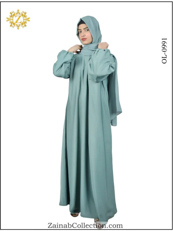 This grape-colored nida maxi abaya is crafted from premium Nida Korean fabric, offering a luxurious and elegant look. The attached staller adds a polished and sophisticated touch, making it perfect for any occasion.