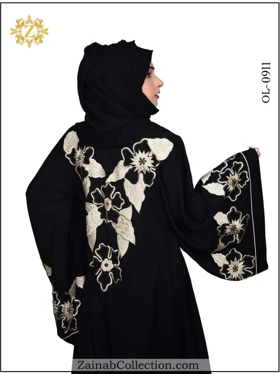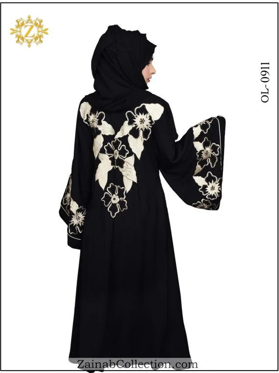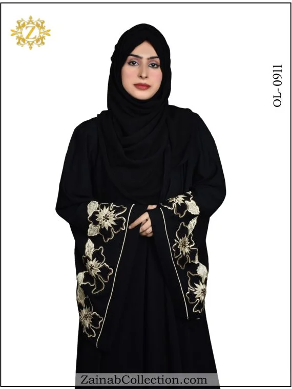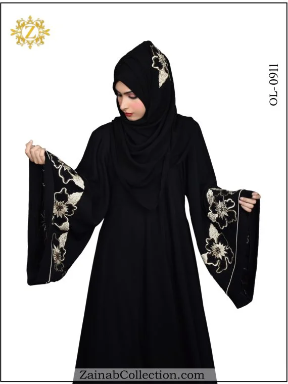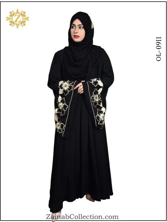 Stylish umbrella abaya with Arabic outline embroidery on Sleeves and Back. For those who appreciate the fusion of tradition and contemporary style, the New Nida Umbrella Abaya with Arabic Outline Embroidery on Sleeves from the Zainab Designer Abaya Collection is the perfect addition to your wardrobe.