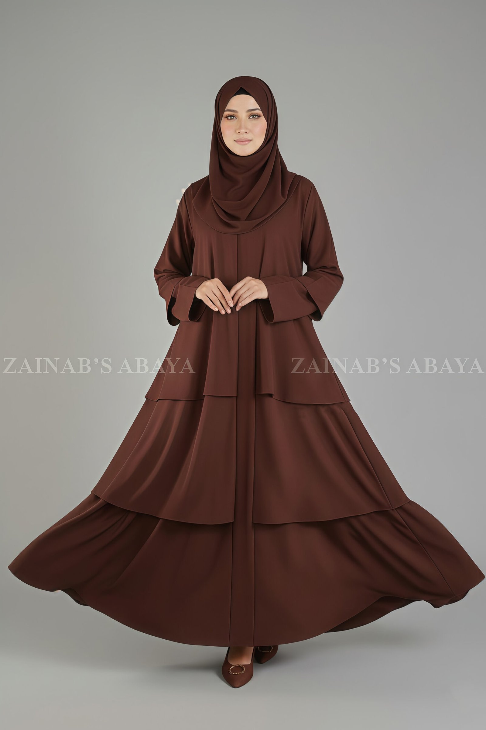 This Umbrella Abaya for women is crafted with Premium Nida Korean Fabric. It has an open style from the front, 3 layers on the body, and 2 layers on the sleeves, including a belt and a matching scarf in chiffon fabric.