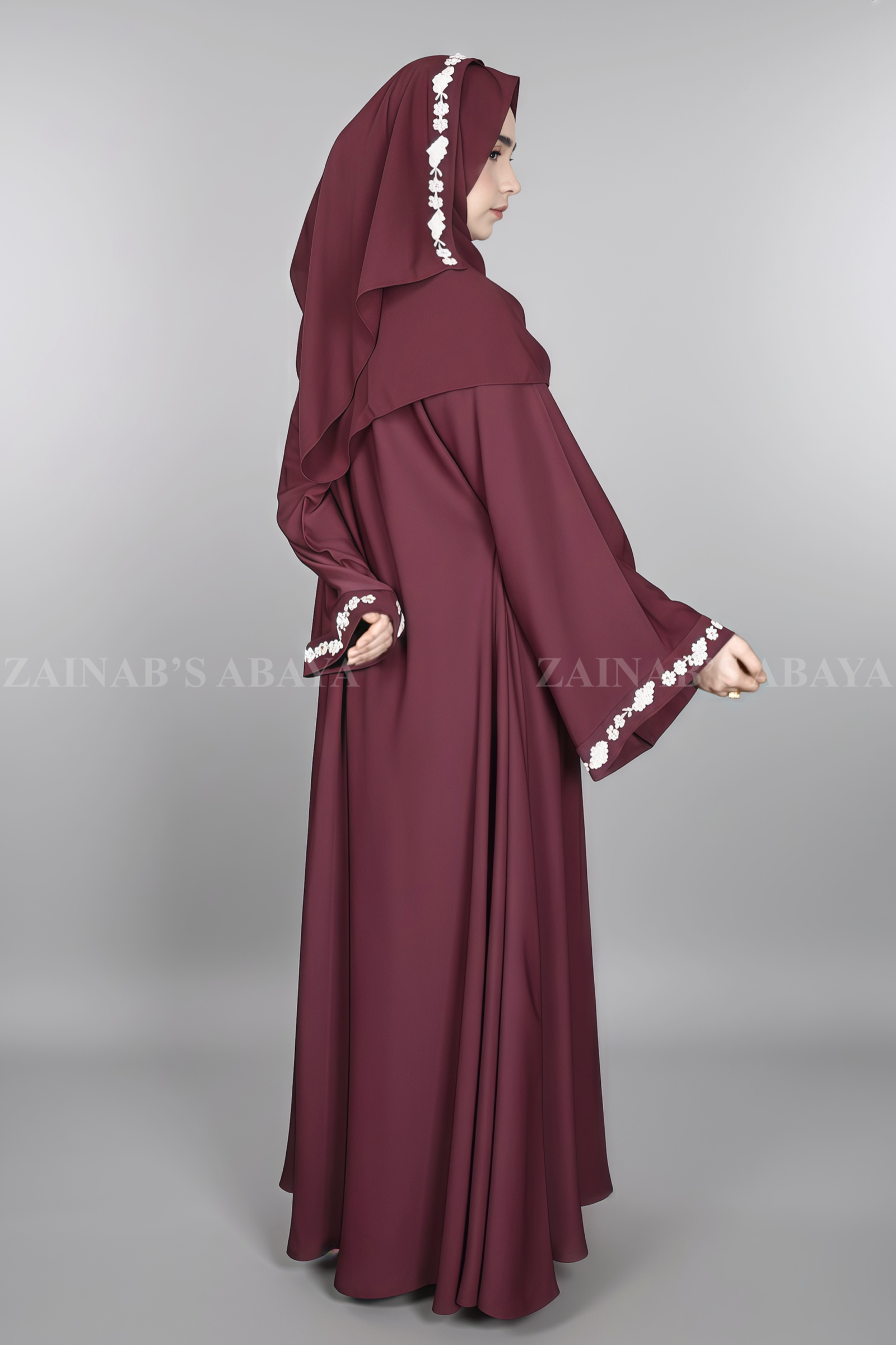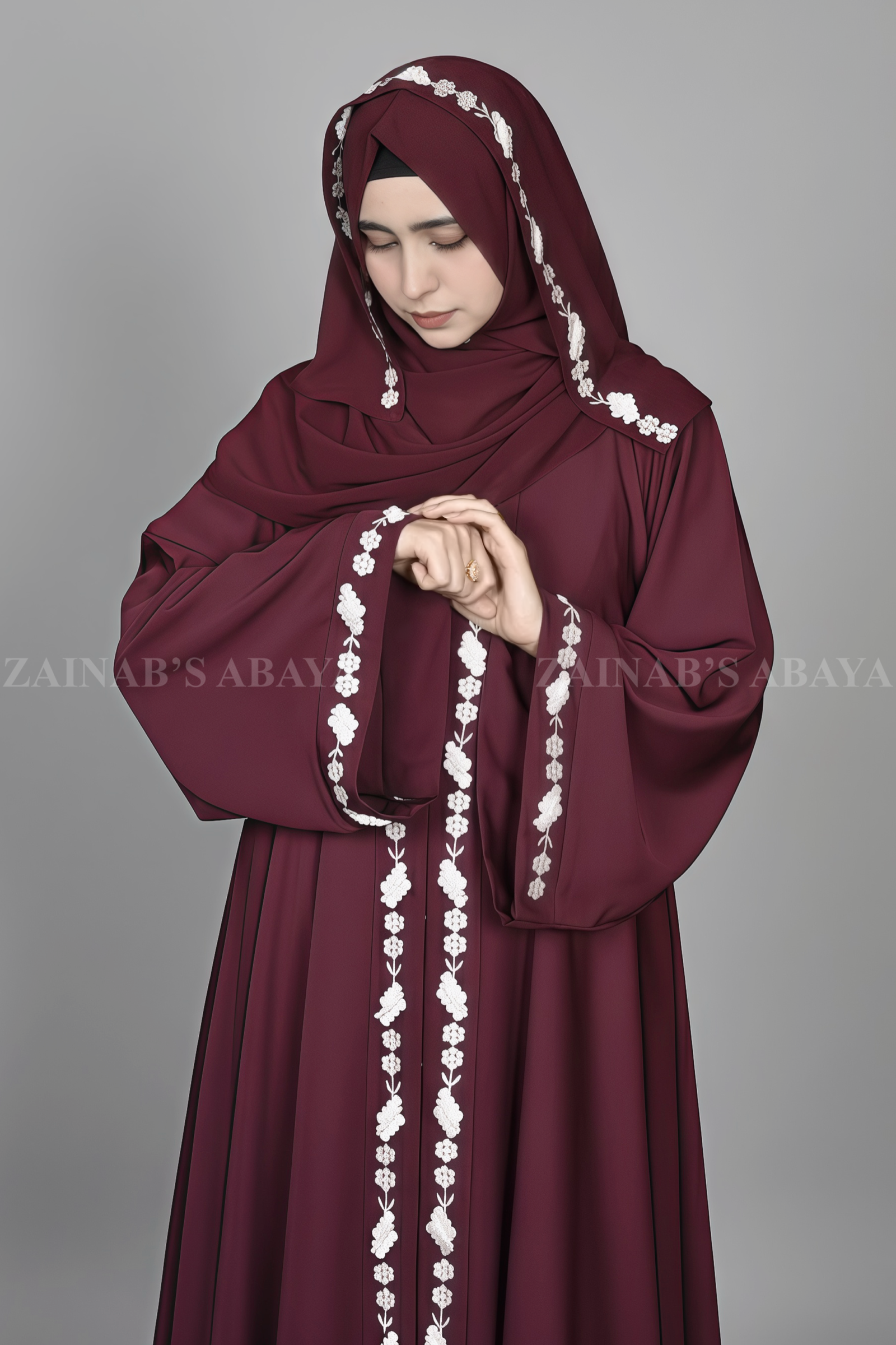 This Umbrella Abaya for women which is crafted with Premium Nida Korean Fabric, is open from the front. It has pretty embroidery designs along the front edges and sleeve cuffs. Includes a matching maroon chiffon scarf with the same embroidery on the border.
