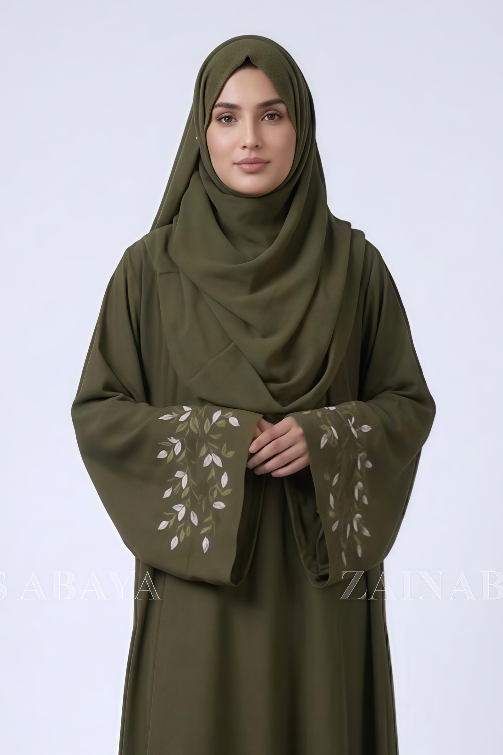 Olive Green Maxi Abaya with Embroidered Sleeves OL-1148