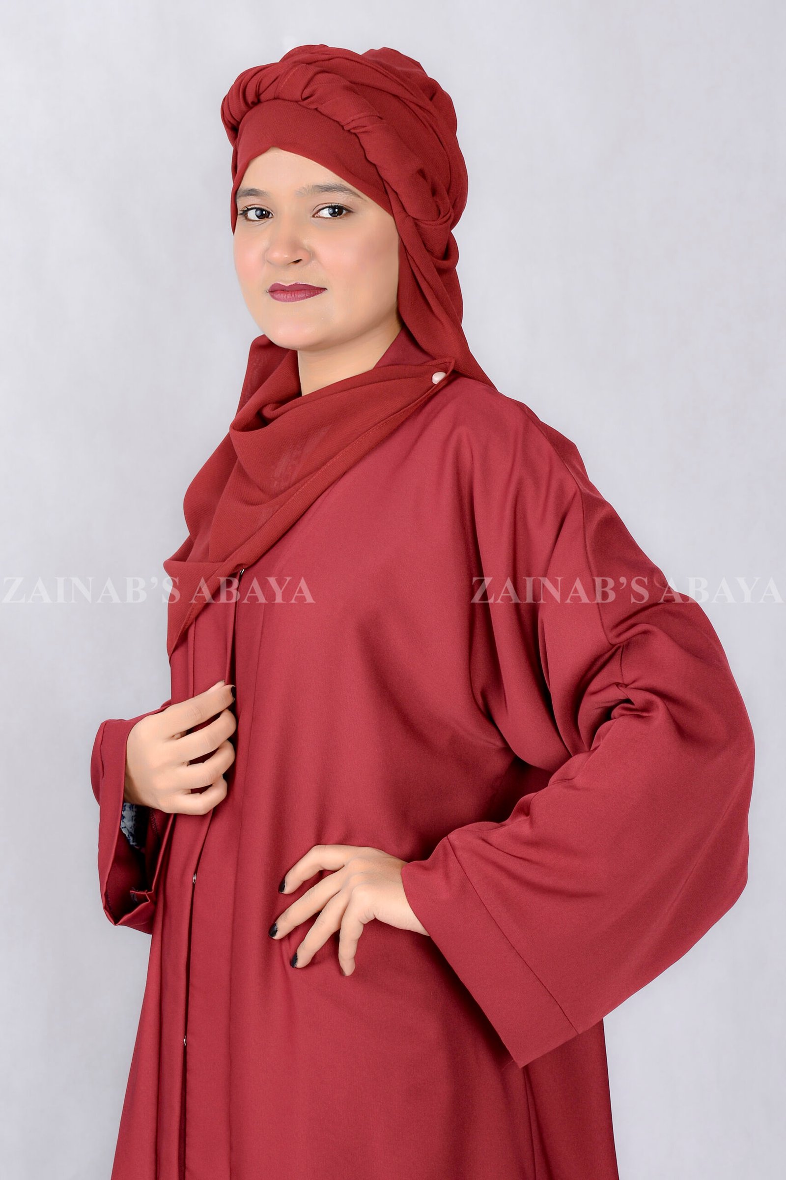 This Red Colored Front Open Abaya is made up of Premium Nida Korean Fabric. It is open from the front and has two side pockets (left and right). Includes a matching scarf in chiffon fabric.Â