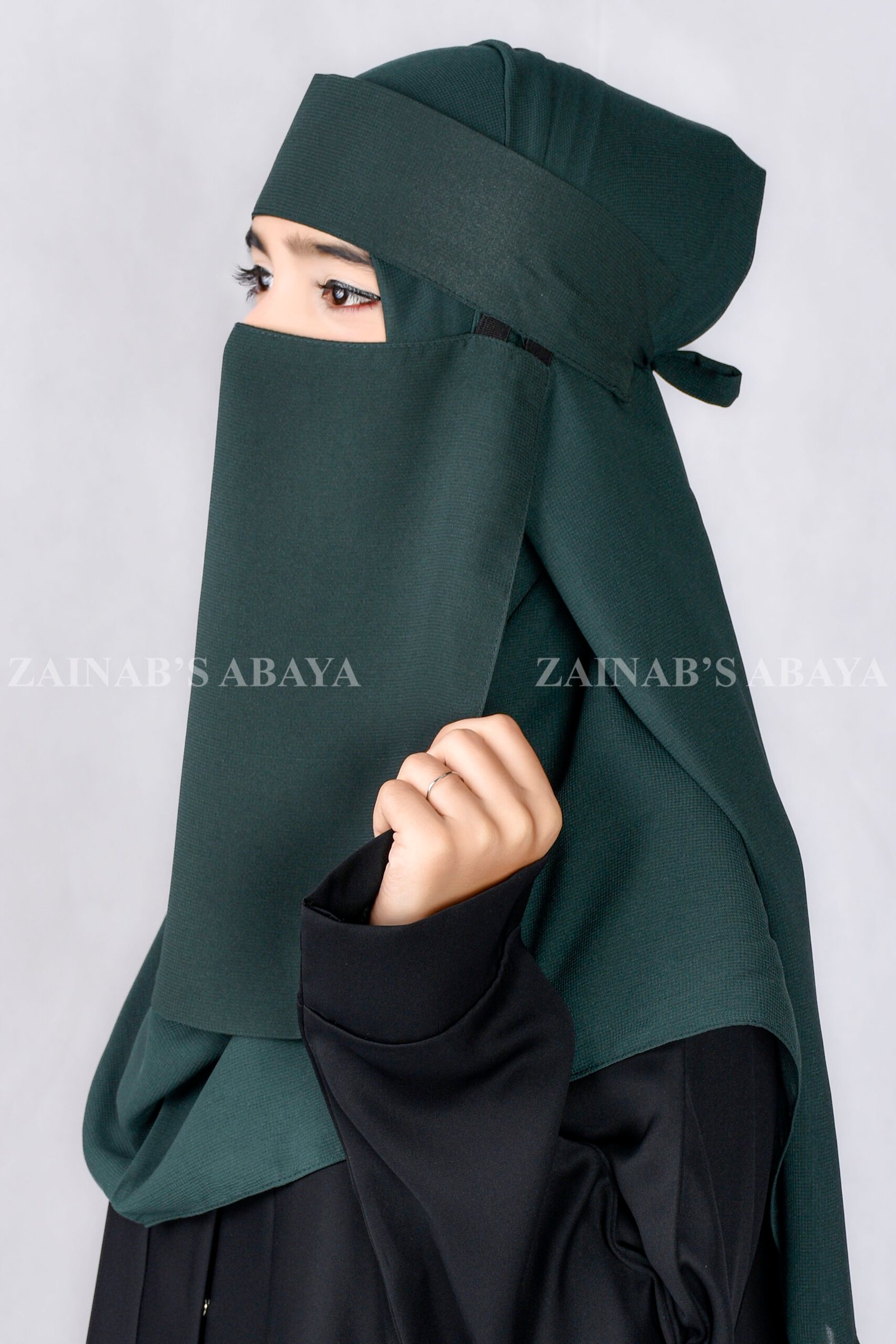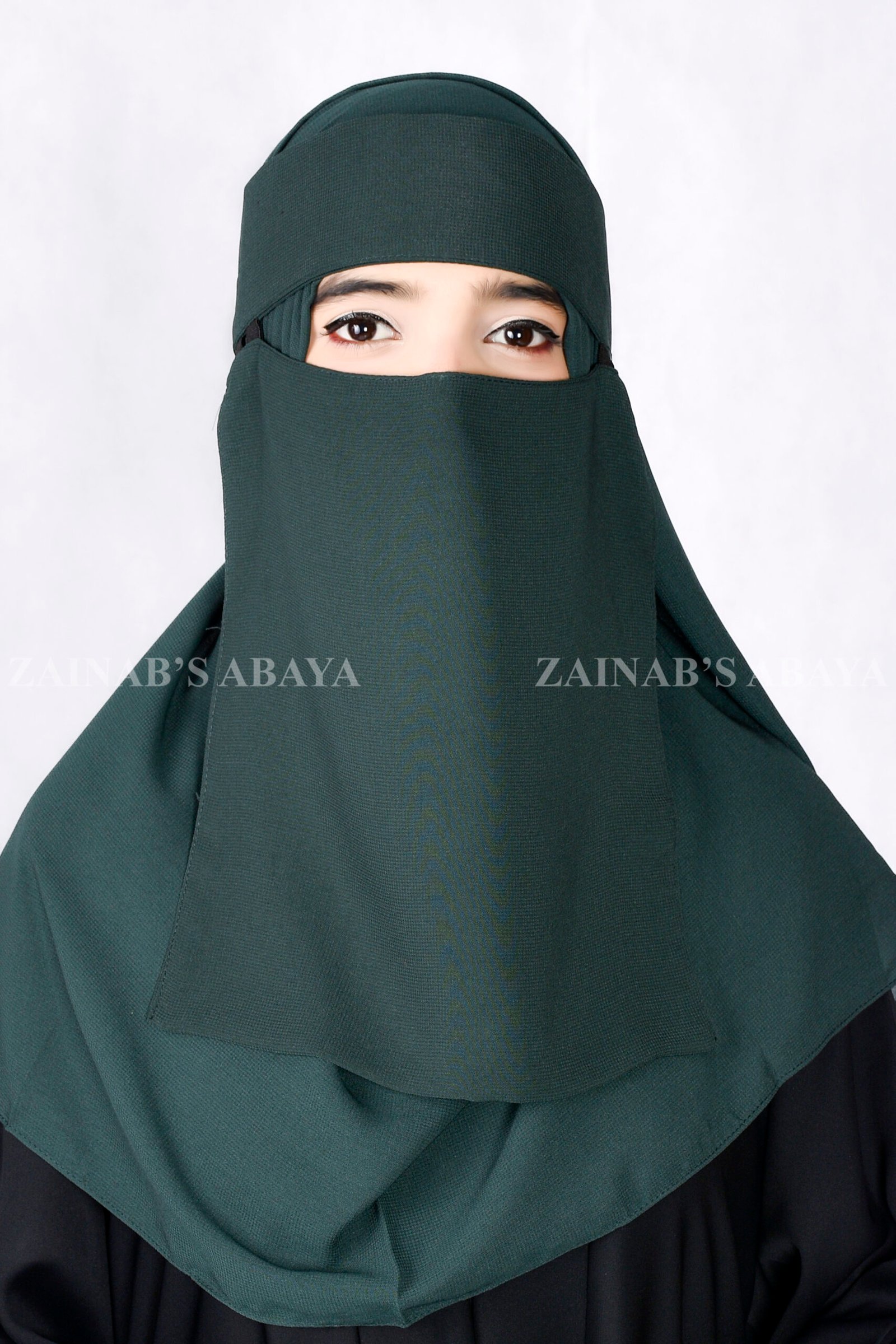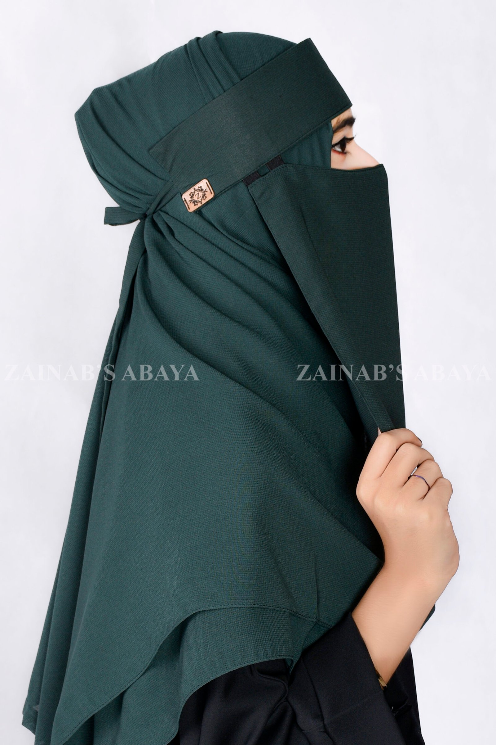 Elegant Saudi Niqab in Moongiya color made with breathable fabric. A premium Saudi niqab with logo from Zainab Designer Abaya, combining modesty, comfort, and affordability. Perfect for daily wear or special occasions.