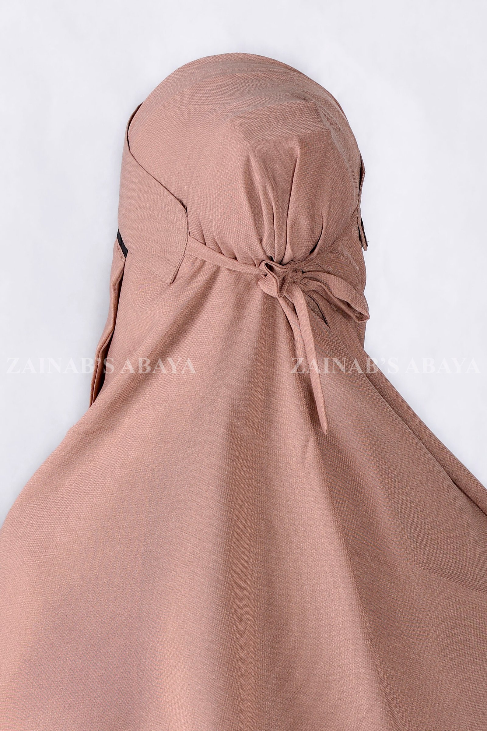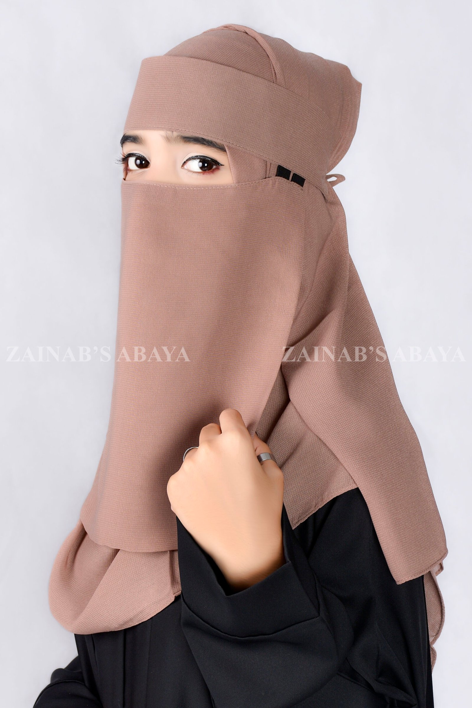Elegant Saudi Niqab in Light Brown color made with breathable fabric. A premium Saudi niqab with logo from Zainab Designer Abaya, combining modesty, comfort, and affordability. Perfect for daily wear or special occasions.